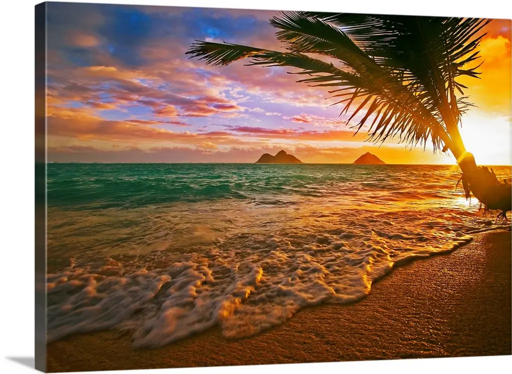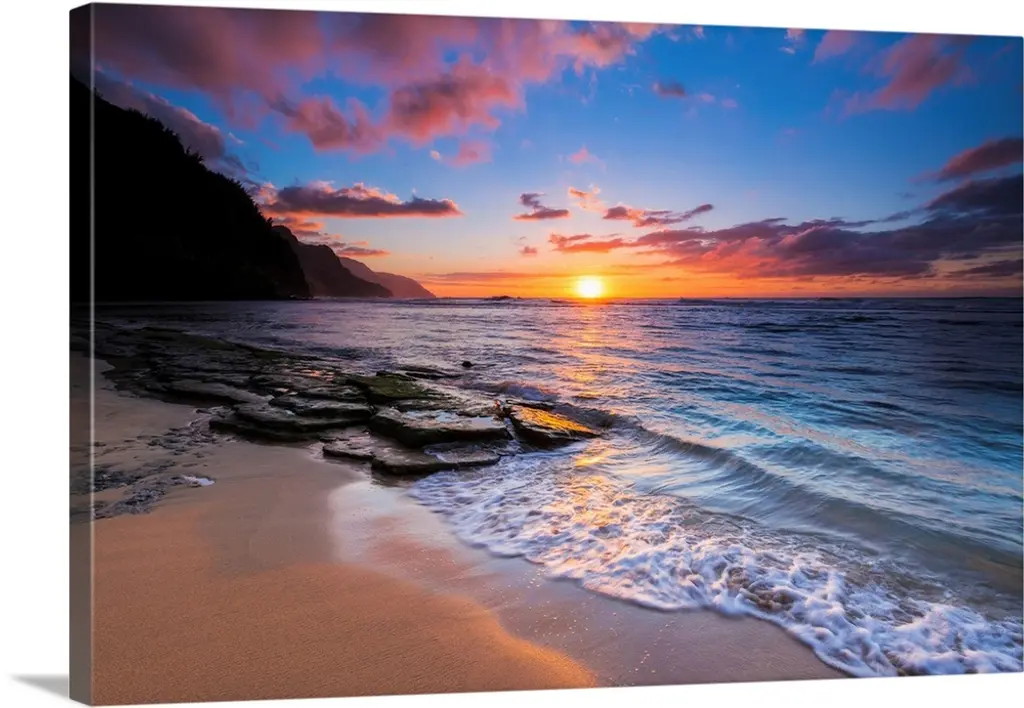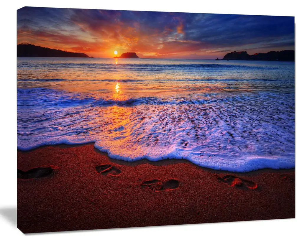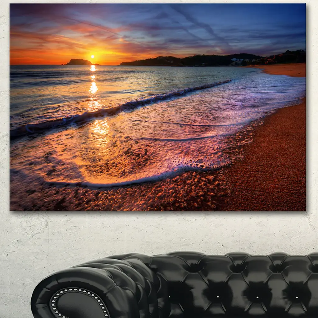 Foaming Waves At Beautiful Sunset, Seashore Canvas Art Print, 60"x28"