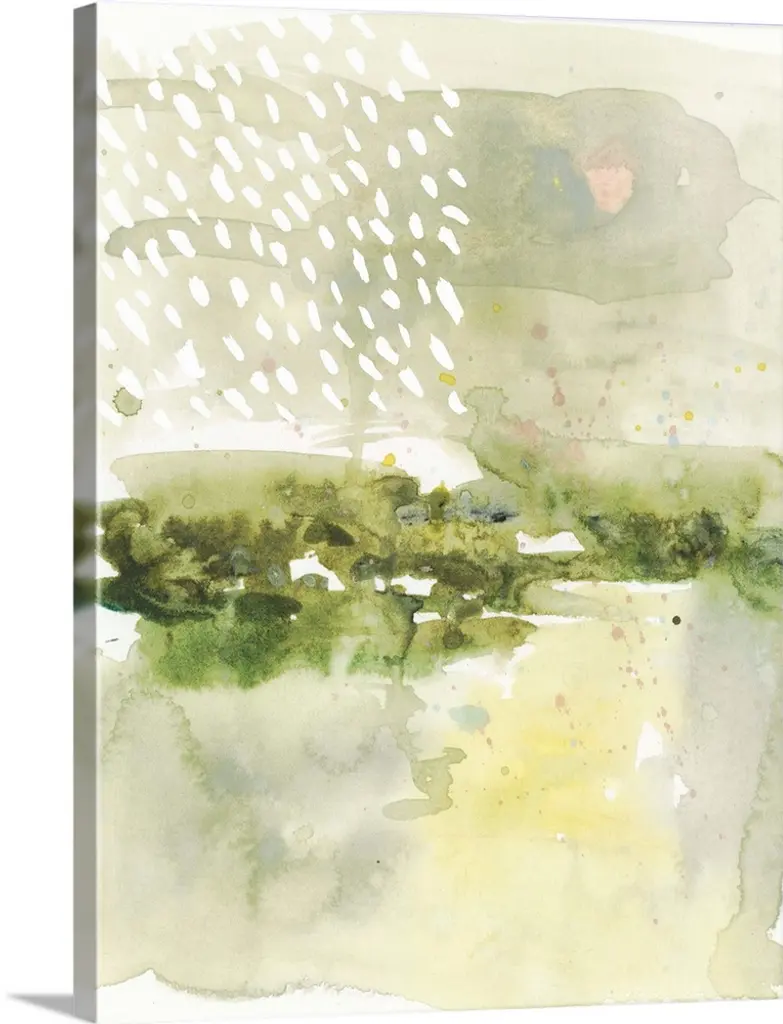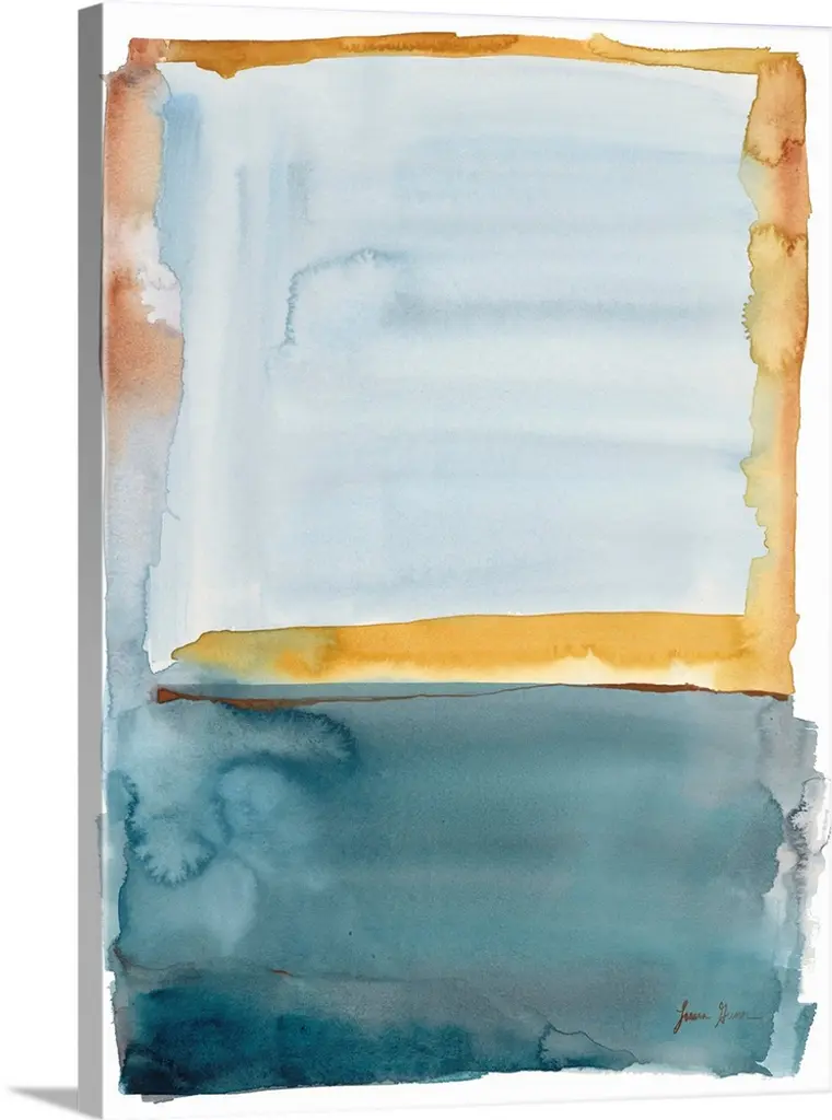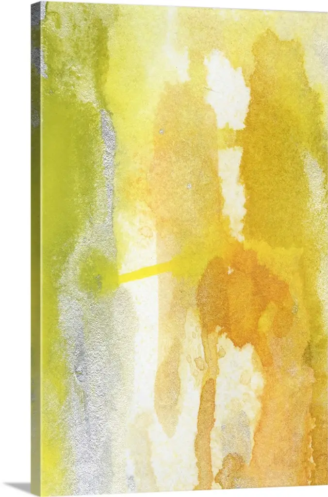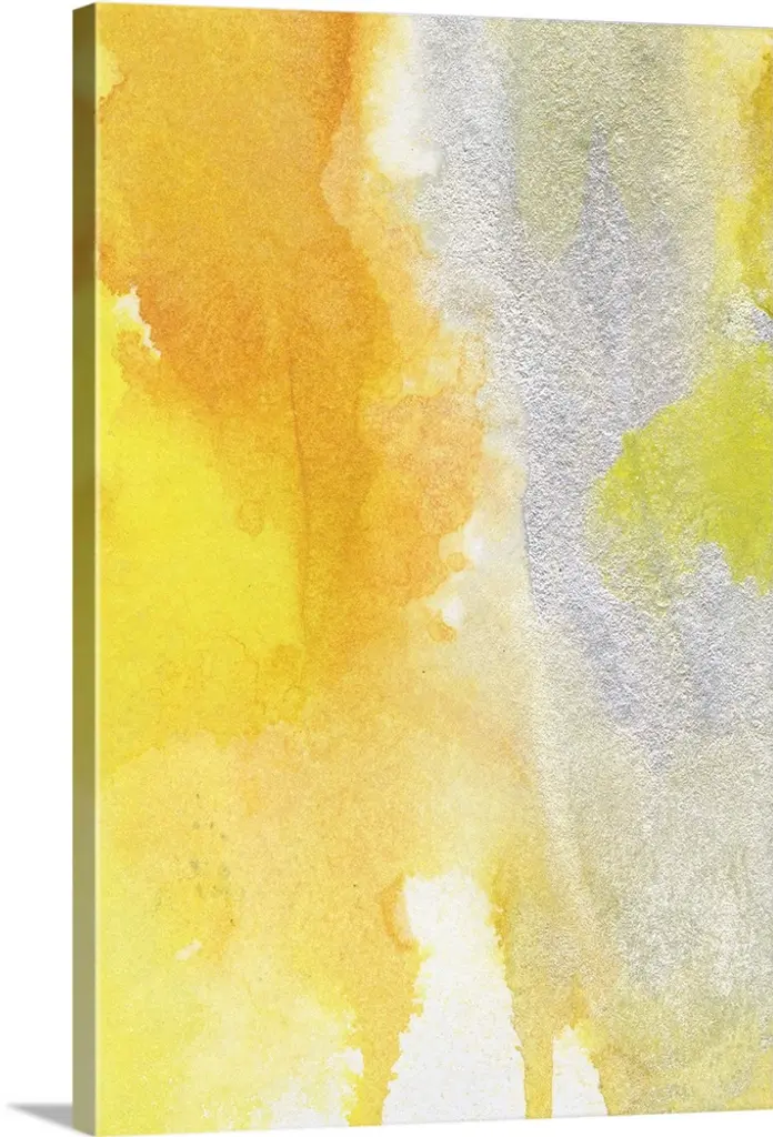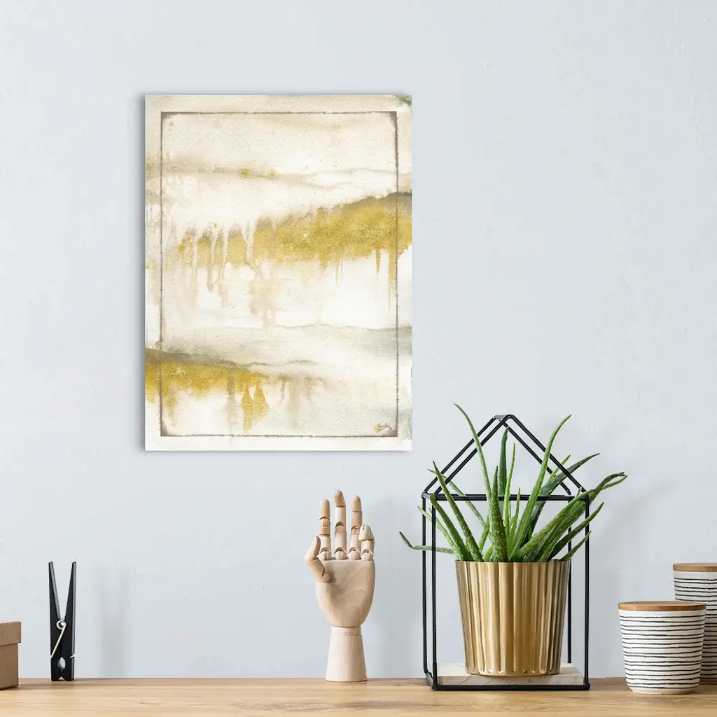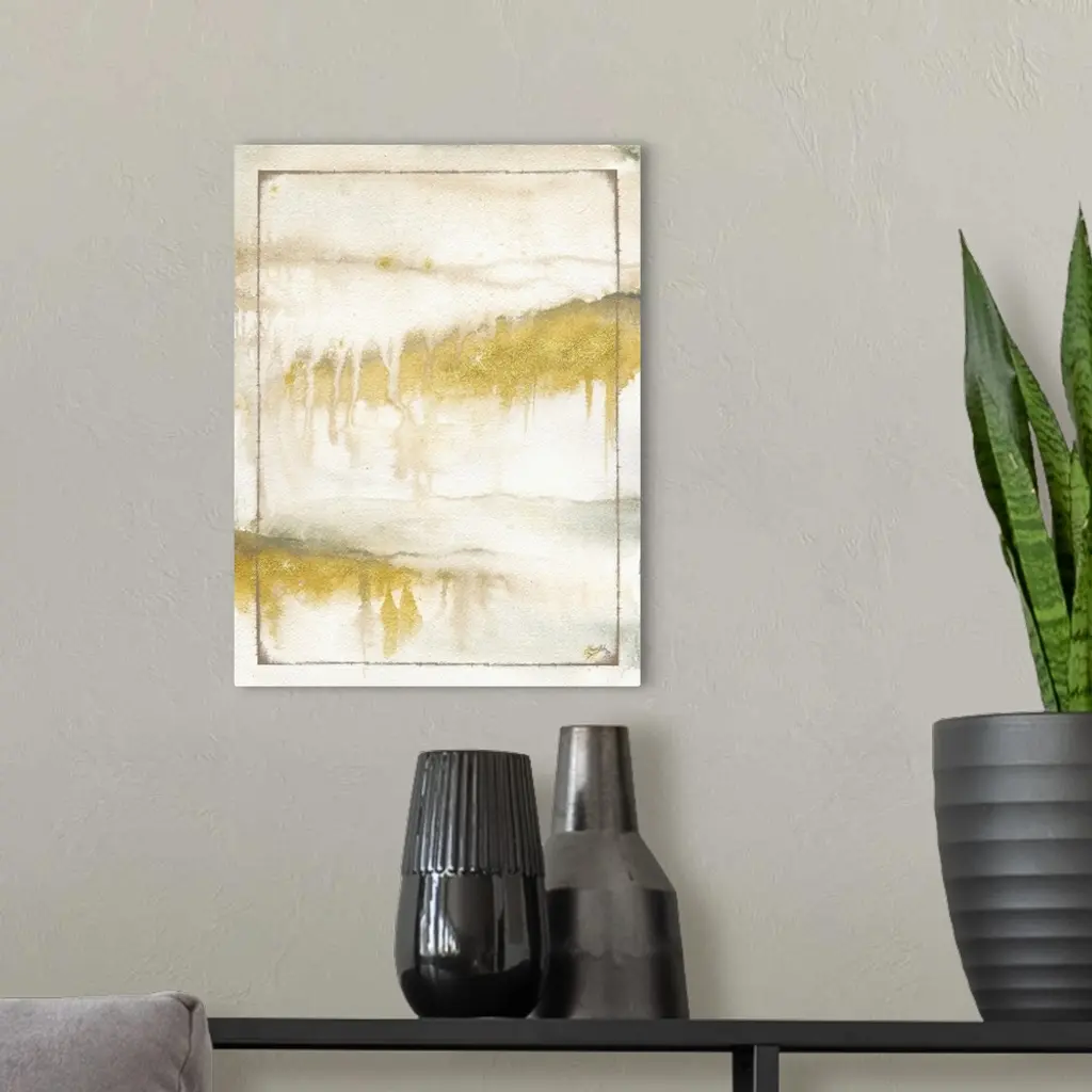 Contemporary abstract painting of horizontal sections of gold with gray drippings and a layer of gold glitter on top.