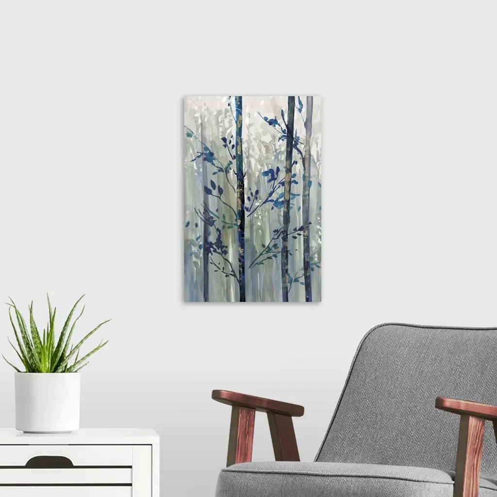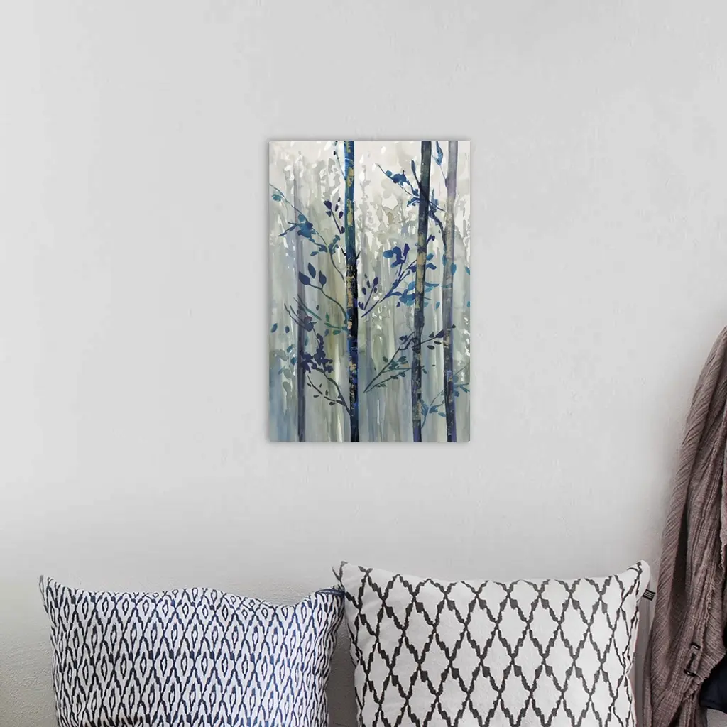 Contemporary home decor artwork of a forest of a dark blue trees.