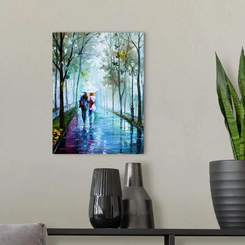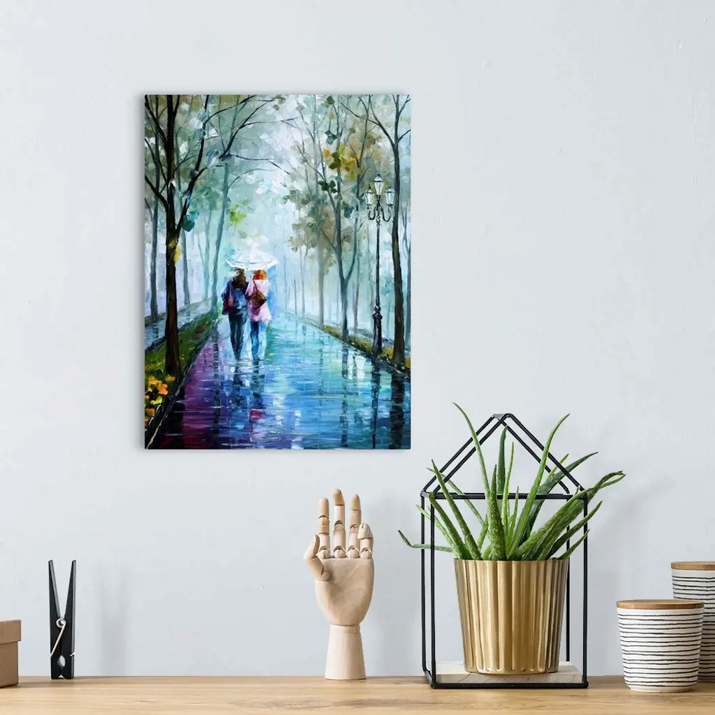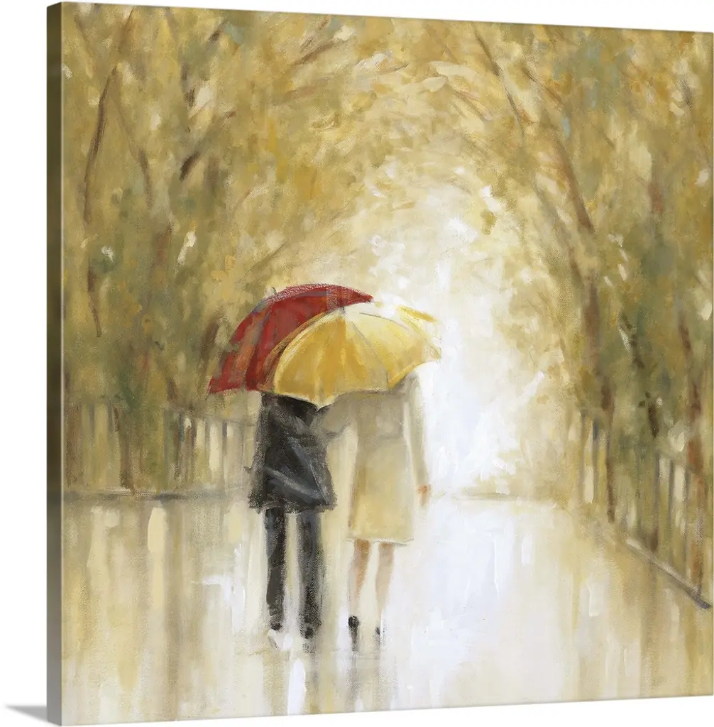 Vertical painting of two people walking in the rain with an umbrella on a path lined with trees.