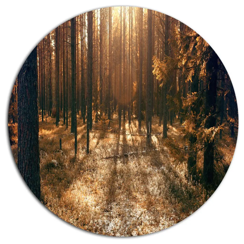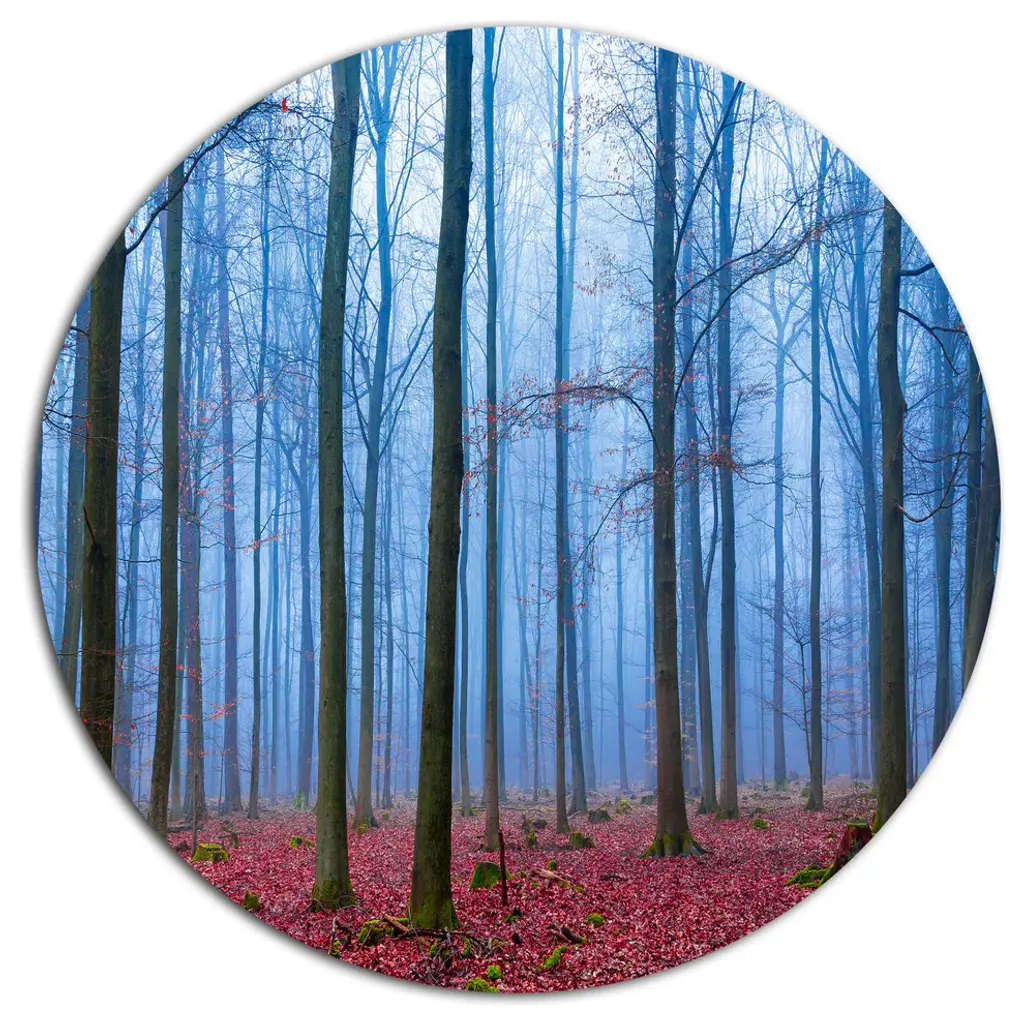 Bring Contemporary Abstraction to your home with this large Circle Metal wall art. This Foggy Dense Forest in autumn Metal Artwork makes it the focal point of any room or office. - White Gloss Coating ensures colors are extra vibrant with light reflection.- Aluminum grade Sheet Metal with 1 inch mounting frame on the back giving the illusion that the artwork is floating on the wall..- Mounting Brackets are included along with instructions.- High Quality Digital images are created directly into a glossy aluminum panel producing a stunning and captivating print into the glossy finish of the metal.- Water, Fire and Scratch resistant HD Aluminum panels.- Looks better than any photo paper and guaranteed to last at least 20 years- Easy to clean with a microfiber cloth. Colors are far superior to regular Canvas Art. - Easy to Hang
