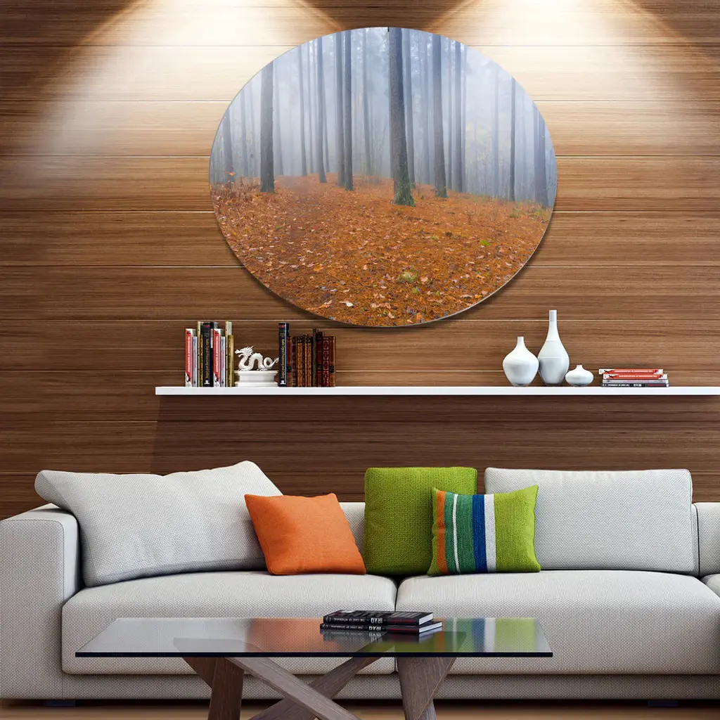 Foggy Dense Forest In Autumn, Modern Forest Disc Metal Wall Art, 36"