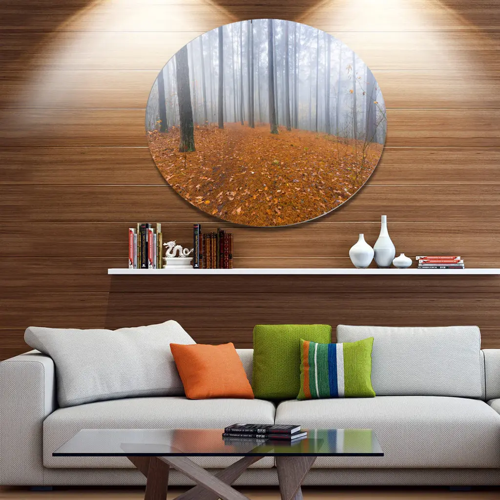 Bring Contemporary Abstraction to your home with this large Circle Metal wall art. This Foggy Forest and Fallen Leaves Metal Artwork makes it the focal point of any room or office. - White Gloss Coating ensures colors are extra vibrant with light reflection.- Aluminum grade Sheet Metal with 1 inch mounting frame on the back giving the illusion that the artwork is floating on the wall..- Mounting Brackets are included along with instructions.- High Quality Digital images are created directly into a glossy aluminum panel producing a stunning and captivating print into the glossy finish of the metal.- Water, Fire and Scratch resistant HD Aluminum panels.- Looks better than any photo paper and guaranteed to last at least 20 years- Easy to clean with a microfiber cloth. Colors are far superior to regular Canvas Art. - Easy to Hang