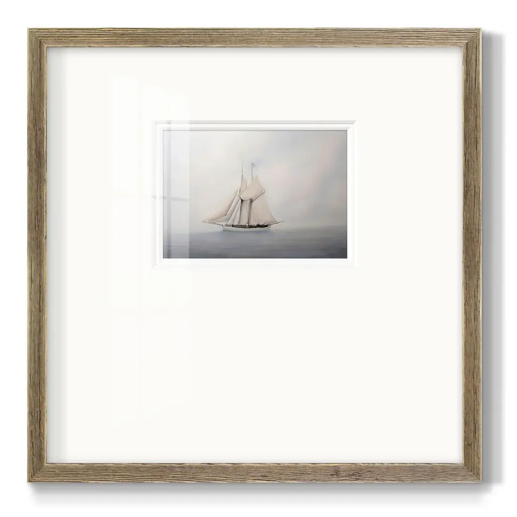 Foggy Sail IIIPremium Framed Print A framed cold pressed paper print featuring superior double matting and quality frame. 2 SIZES AVAILABLE 16''X16''' - Overall Size 20''X20''' - Overall Size Each piece is made to order. Each piece comes with hanging hardware. Made in the USA Ready to Hang Giclee Paper Print Plexiglass Beveled Matt Board Double Matte Board