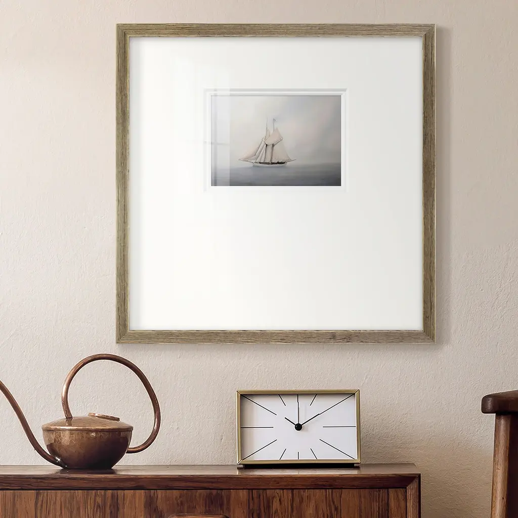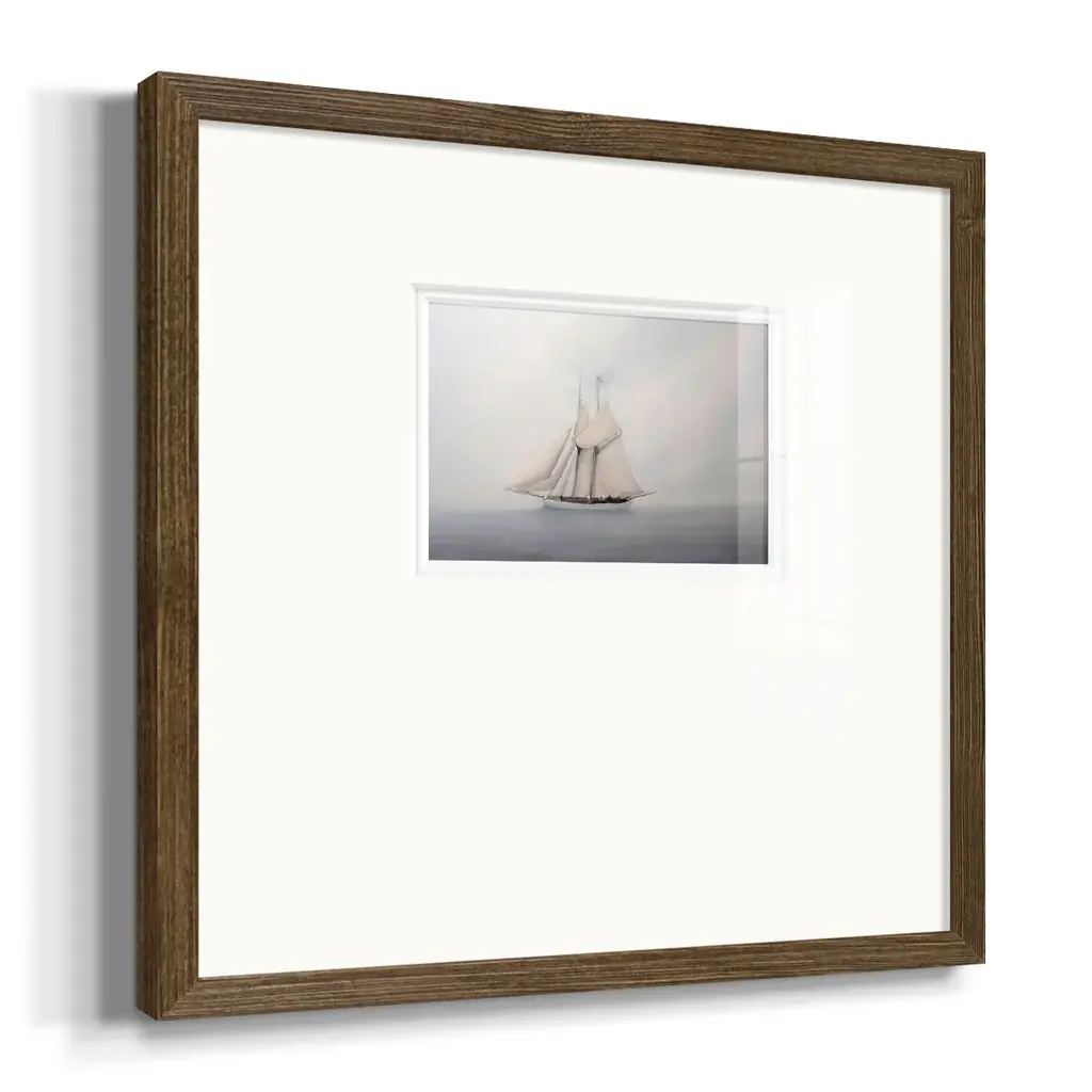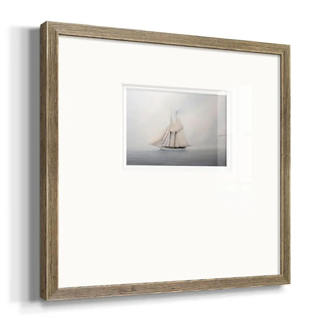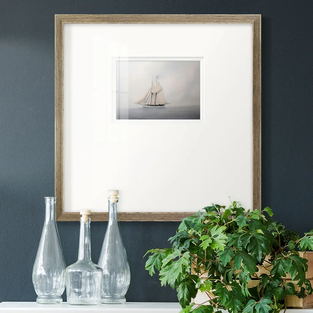 Foggy Sail IIIPremium Framed Print A framed cold pressed paper print featuring superior double matting and quality frame. 2 SIZES AVAILABLE 16''X16''' - Overall Size 20''X20''' - Overall Size Each piece is made to order. Each piece comes with hanging hardware. Made in the USA Ready to Hang Giclee Paper Print Plexiglass Beveled Matt Board Double Matte Board