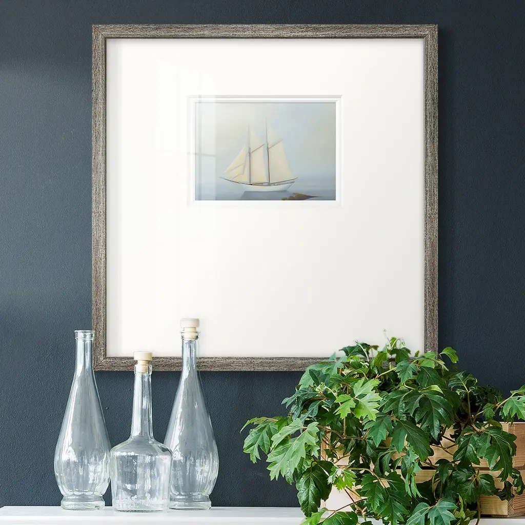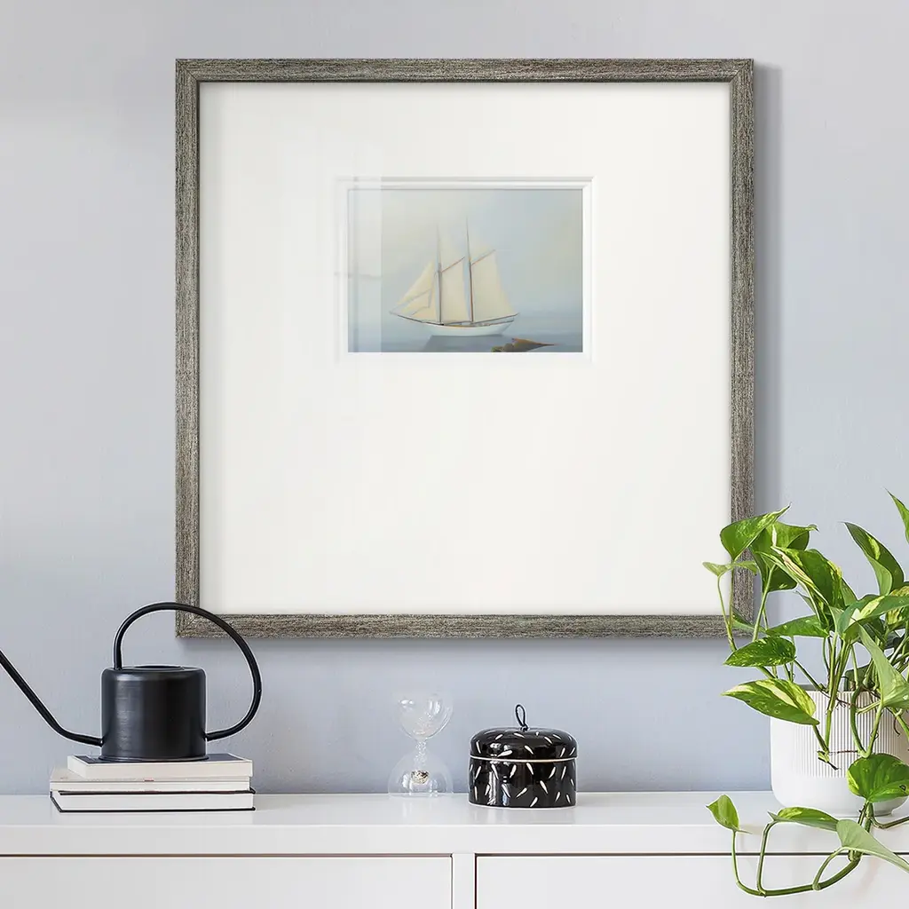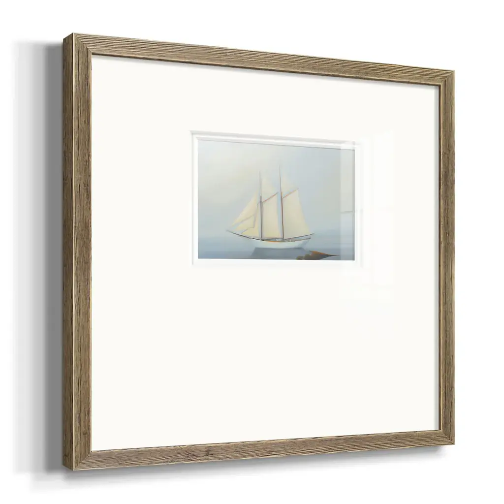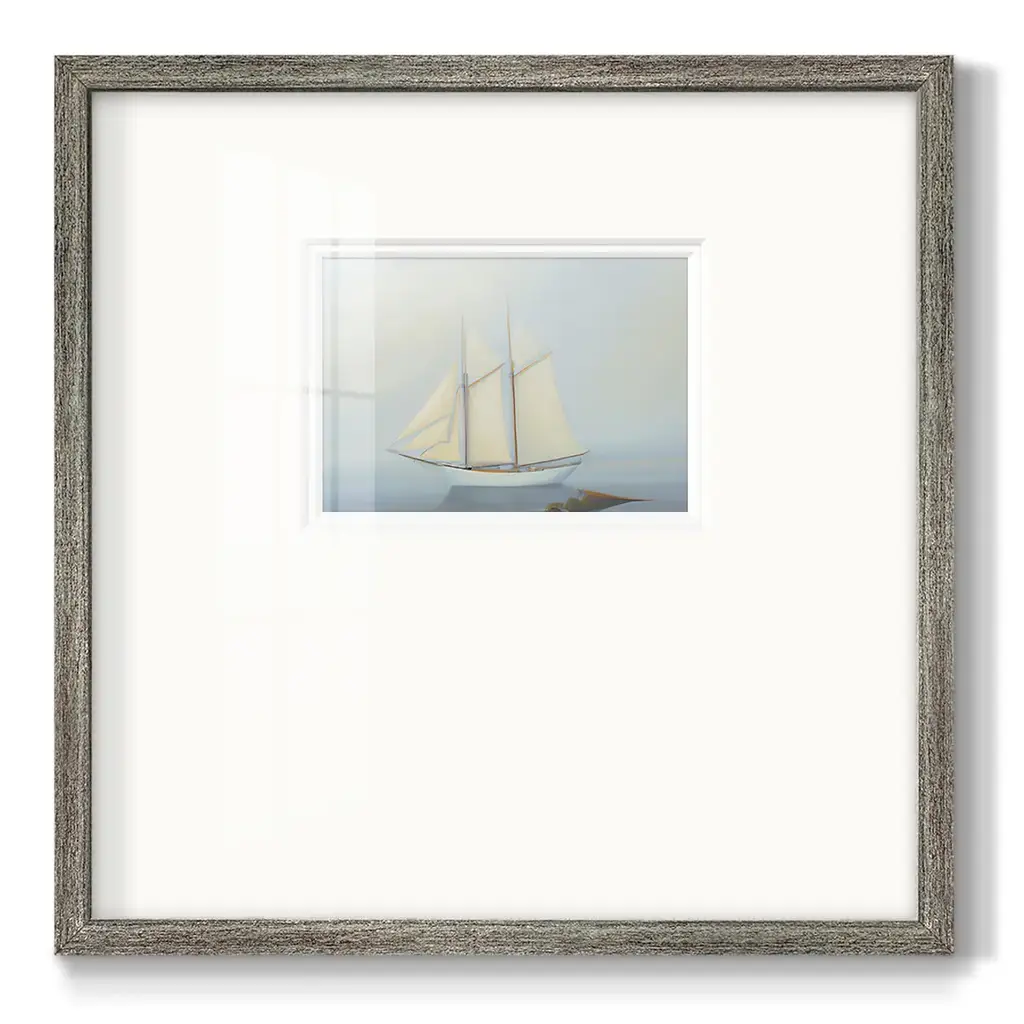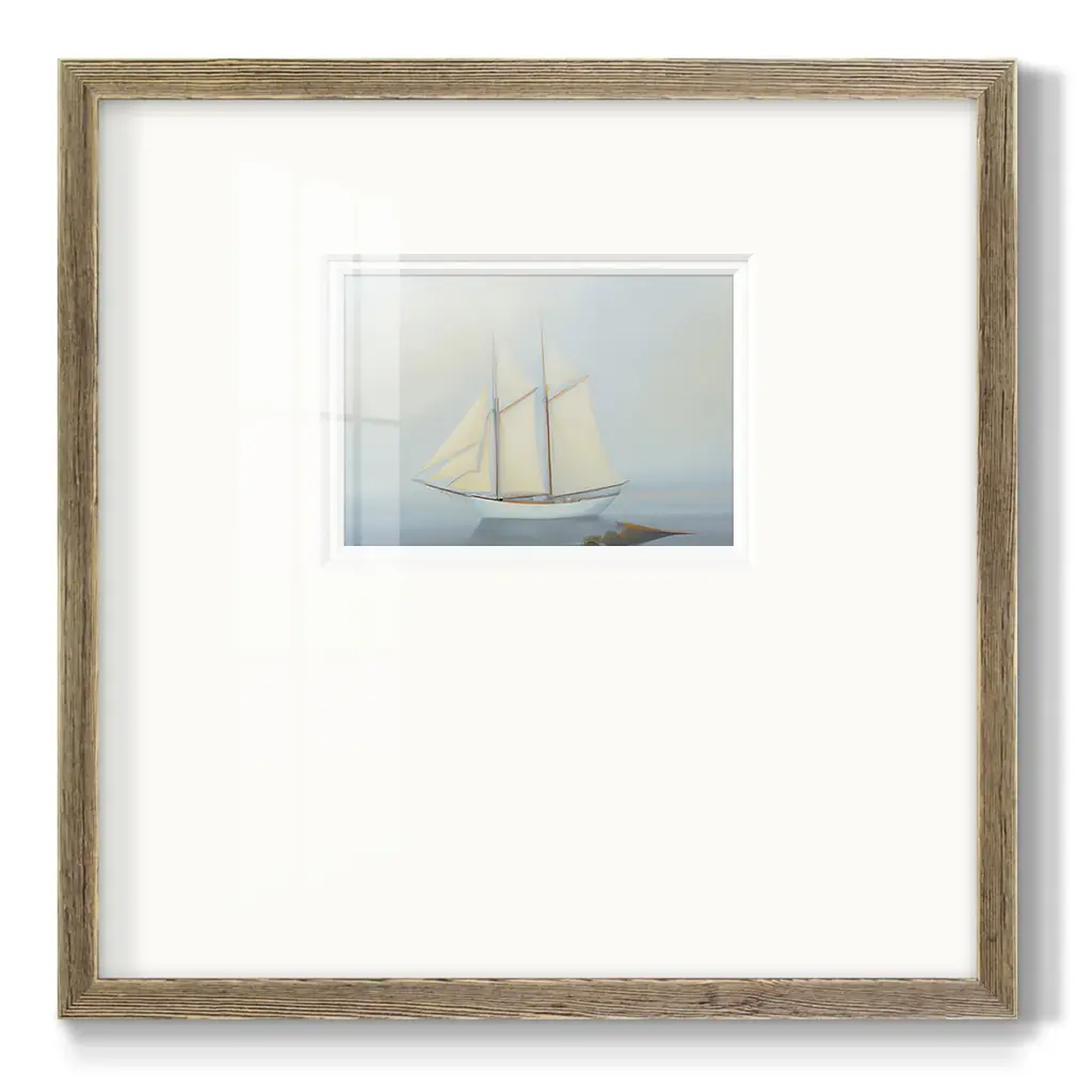 Foggy Sail IIPremium Framed Print A framed cold pressed paper print featuring superior double matting and quality frame. 2 SIZES AVAILABLE 16''X16''' - Overall Size 20''X20''' - Overall Size Each piece is made to order. Each piece comes with hanging hardware. Made in the USA Ready to Hang Giclee Paper Print Plexiglass Beveled Matt Board Double Matte Board