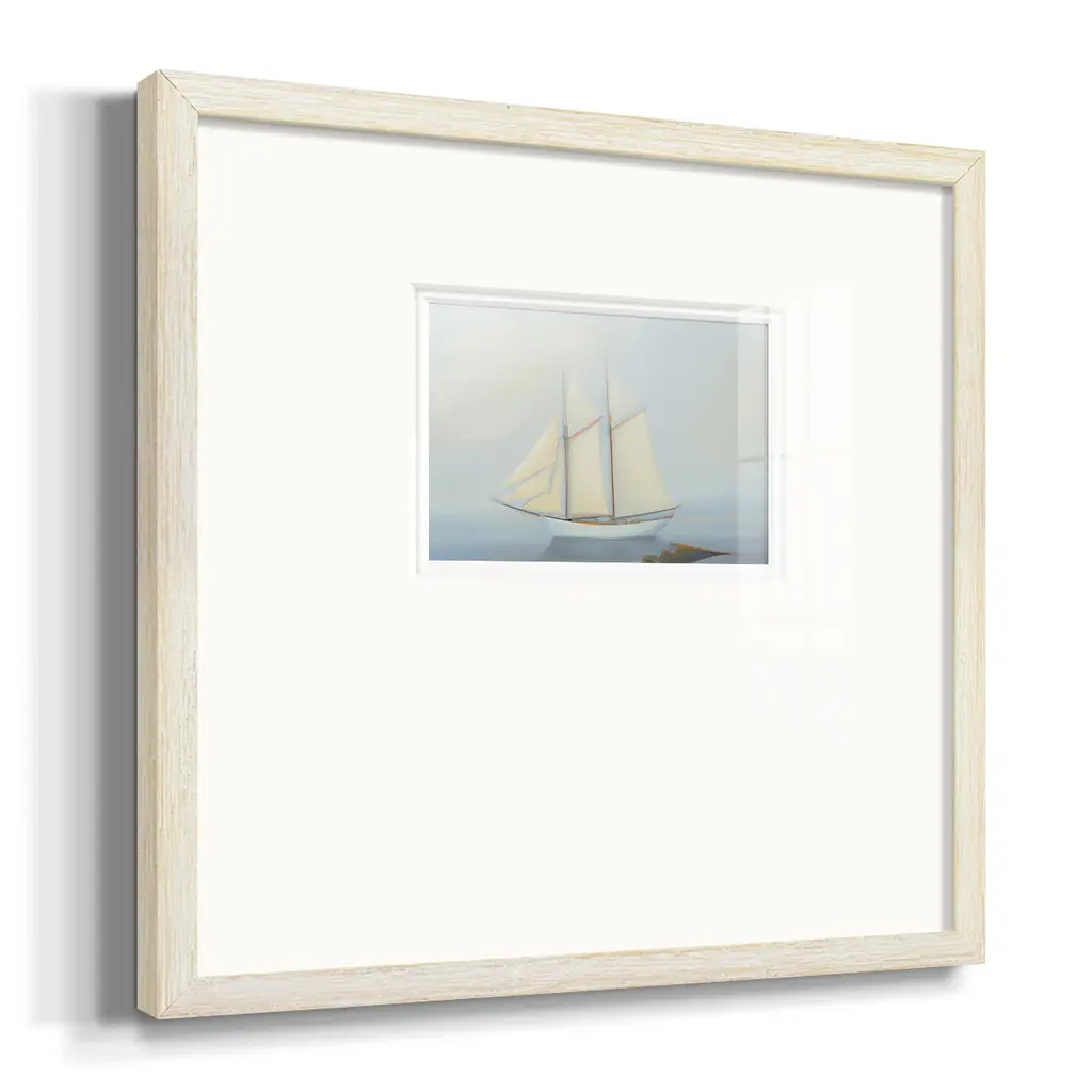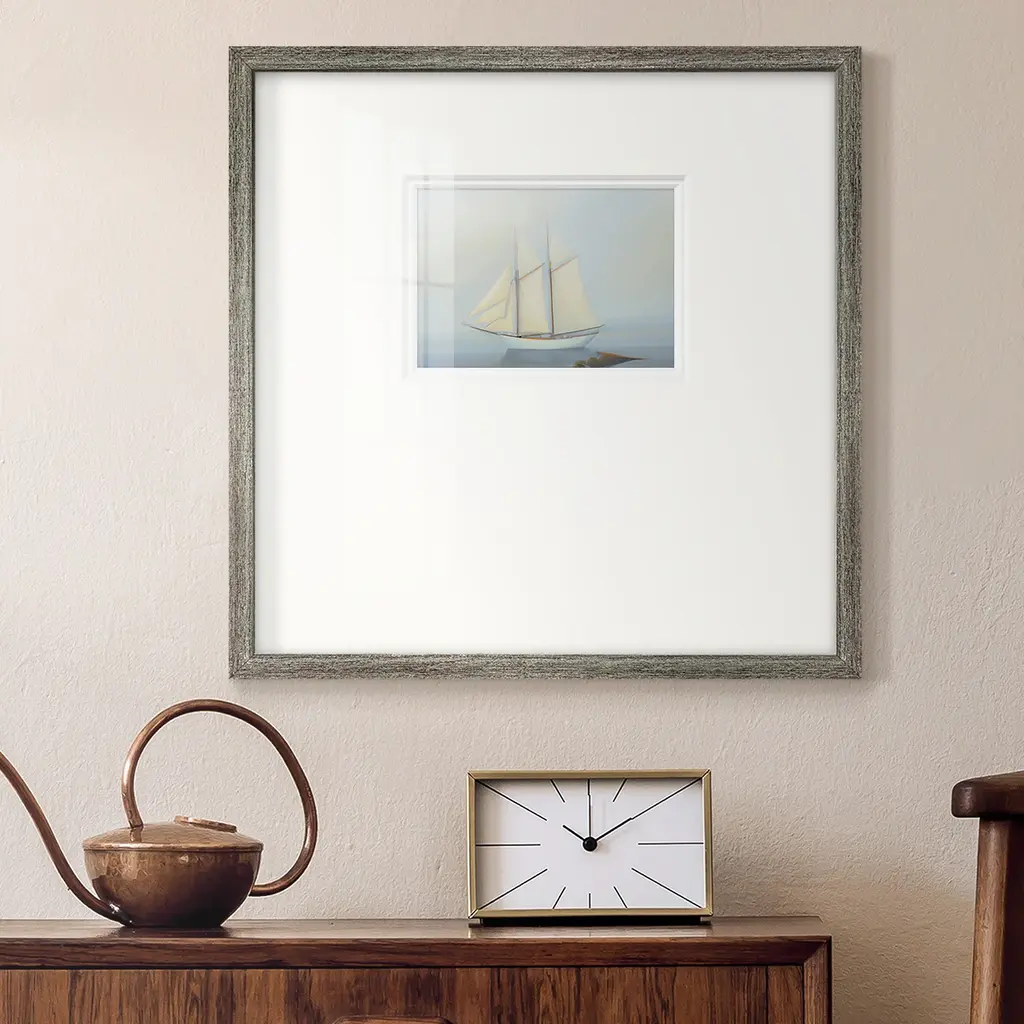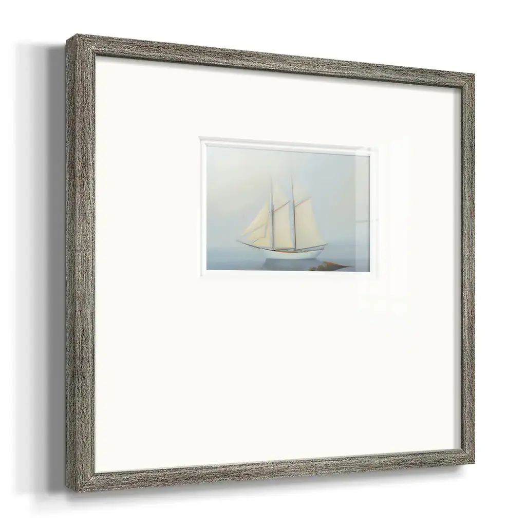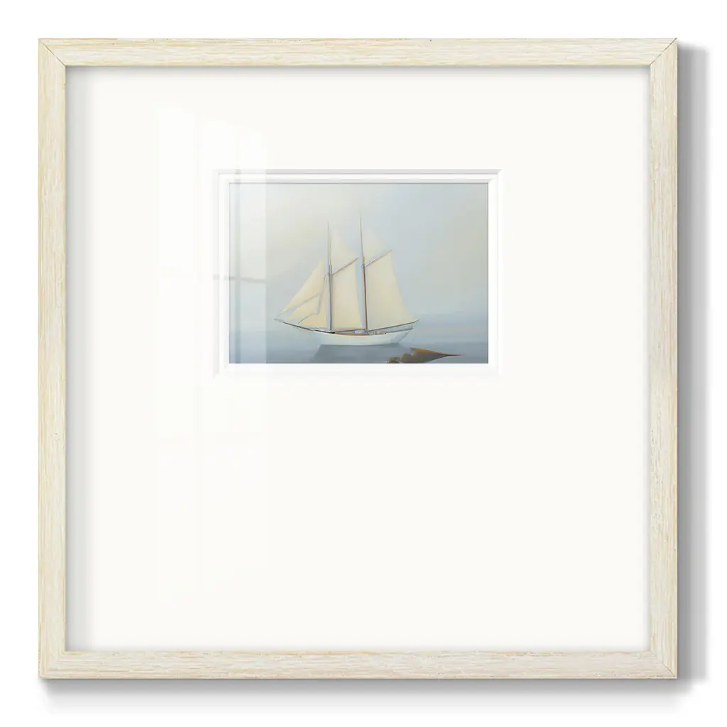 Foggy Sail IIPremium Framed Print A framed cold pressed paper print featuring superior double matting and quality frame. 2 SIZES AVAILABLE 16''X16''' - Overall Size 20''X20''' - Overall Size Each piece is made to order. Each piece comes with hanging hardware. Made in the USA Ready to Hang Giclee Paper Print Plexiglass Beveled Matt Board Double Matte Board