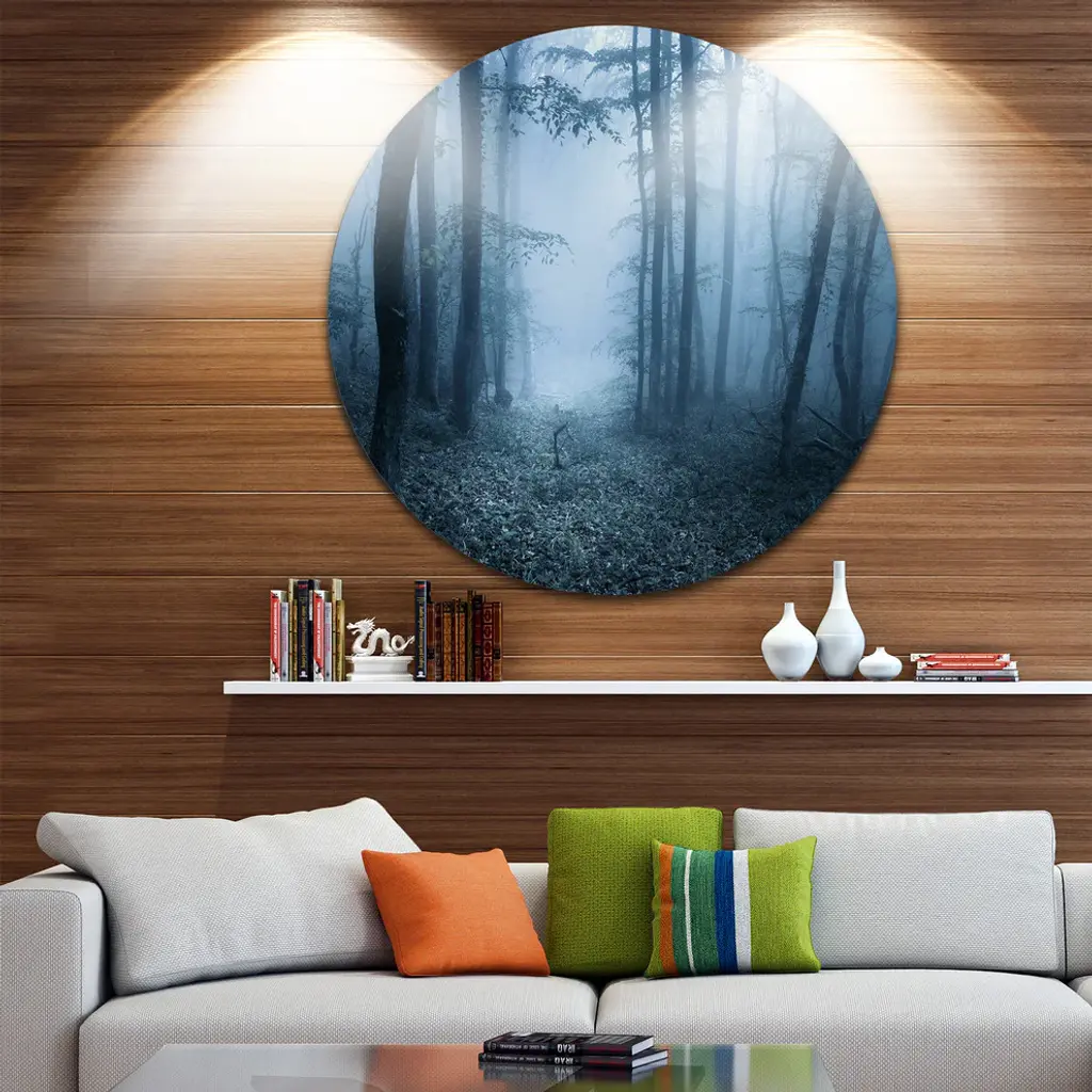 Bring Contemporary Abstraction to your home with this large Circle Metal wall art. This Foggy Spring Forest Metal Artwork makes it the focal point of any room or office. - White Gloss Coating ensures colors are extra vibrant with light reflection.- Aluminum grade Sheet Metal with 1 inch mounting frame on the back giving the illusion that the artwork is floating on the wall..- Mounting Brackets are included along with instructions.- High Quality Digital images are created directly into a glossy aluminum panel producing a stunning and captivating print into the glossy finish of the metal.- Water, Fire and Scratch resistant HD Aluminum panels.- Looks better than any photo paper and guaranteed to last at least 20 years- Easy to clean with a microfiber cloth. Colors are far superior to regular Canvas Art. - Easy to Hang