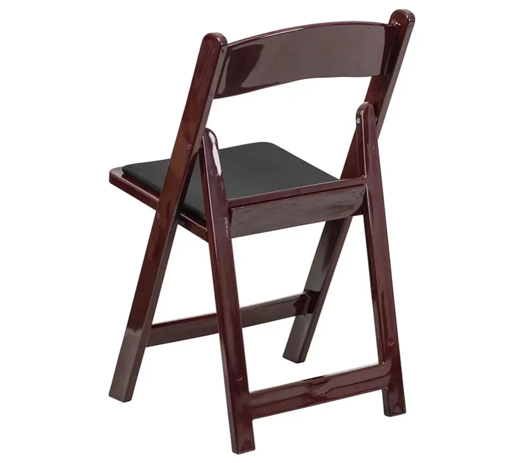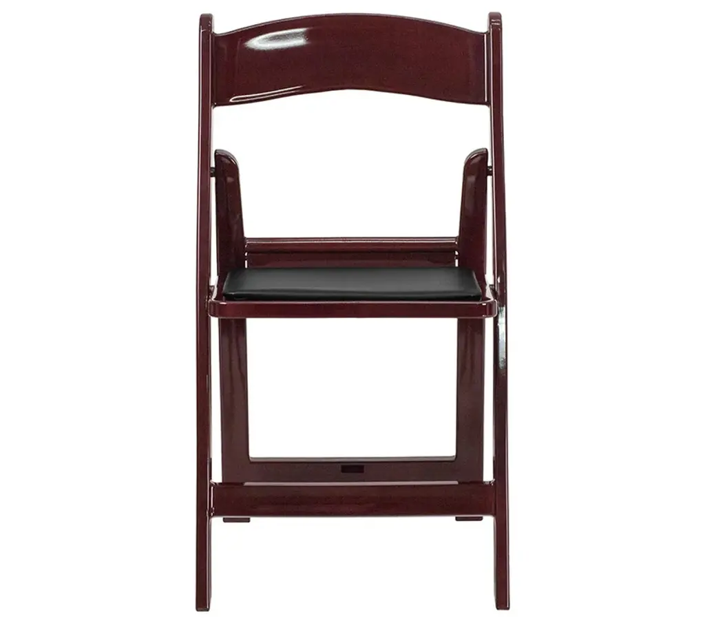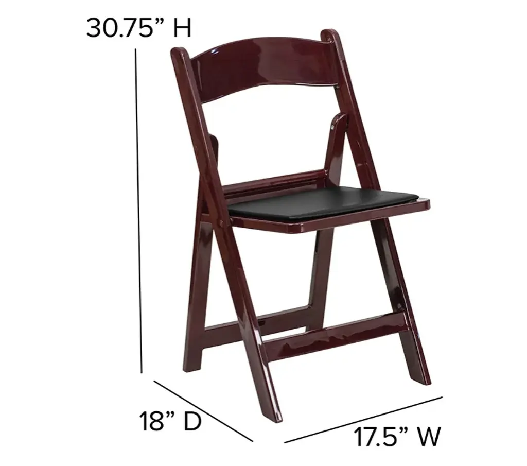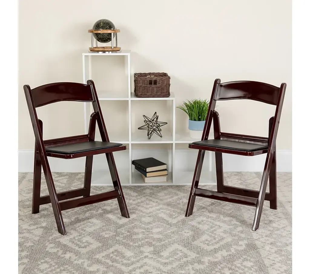 Set of 2 Resin Folding Chairs for Indoor or Outdoor Events1000 lb. Weight CapacityLightweight for storage and portabilityUV Stabilized Polypropylene ResinNo repainting necessary, color is same throughoutRemovable Waterproof Vinyl Seat with CAL 117 Fire Retardant FoamDesigned for Commercial UseFolded Size: 17.5"W x 2.25"D x 35"HMahogany folding chair for extra seating, rental companies, banquet halls and patio seating
