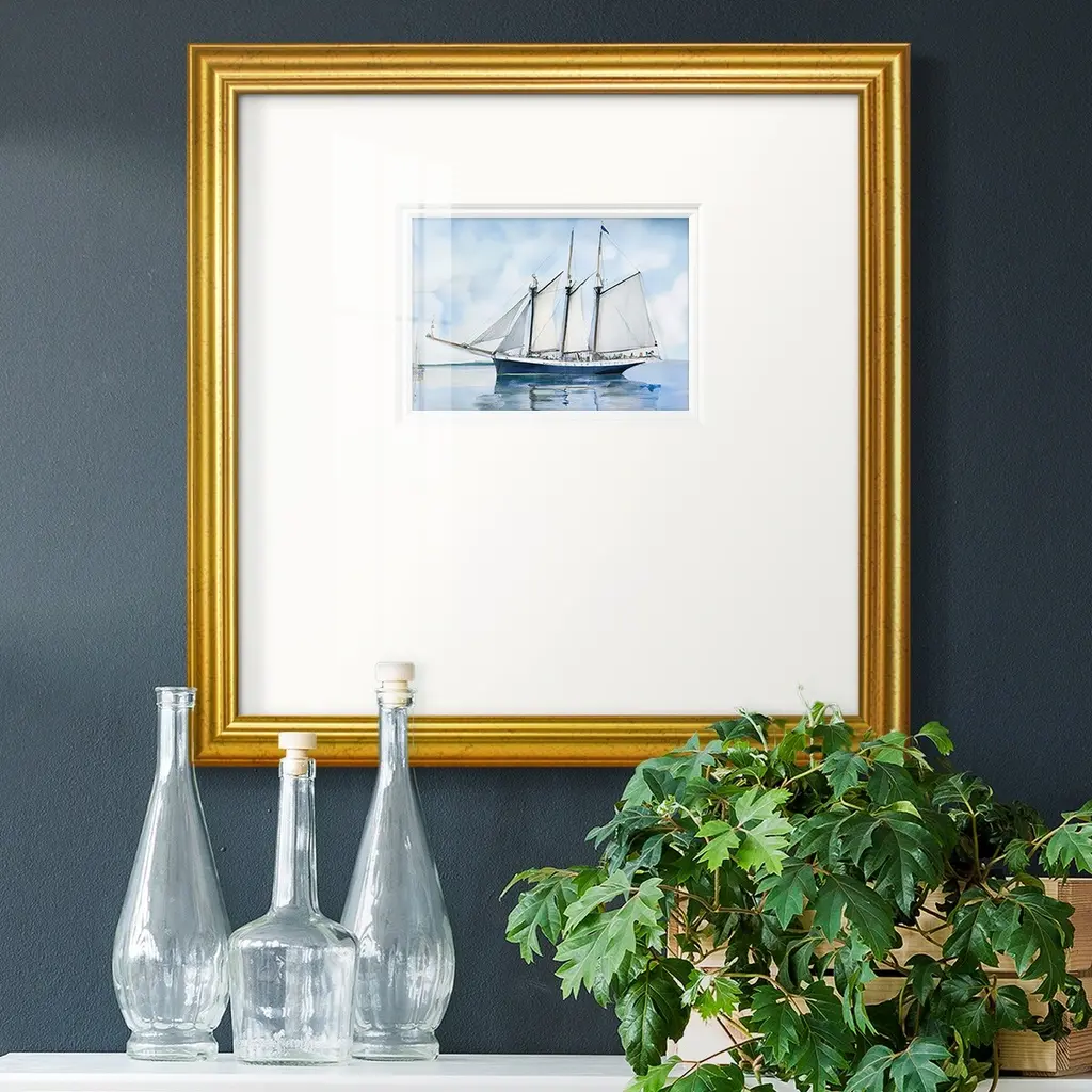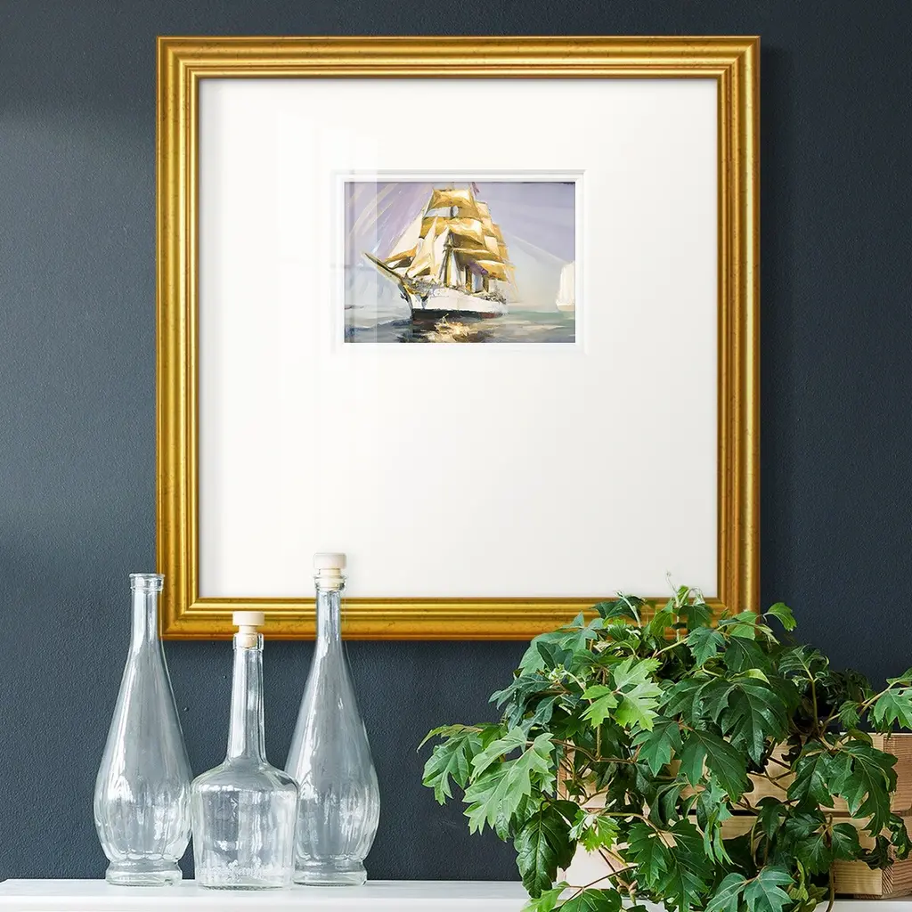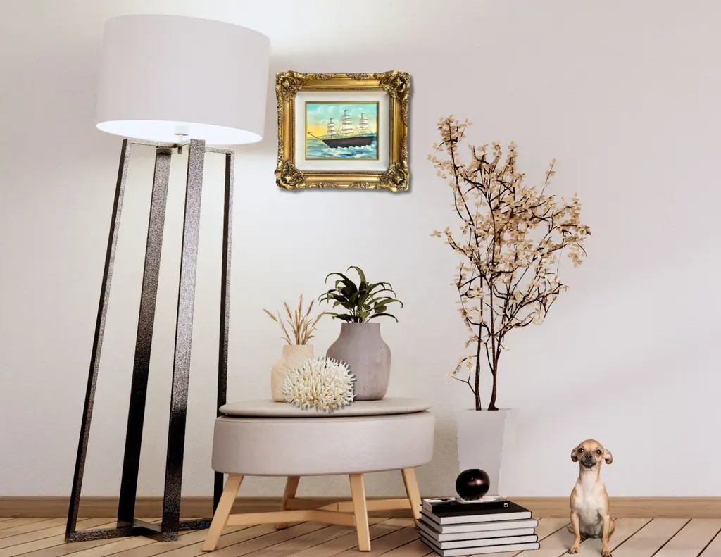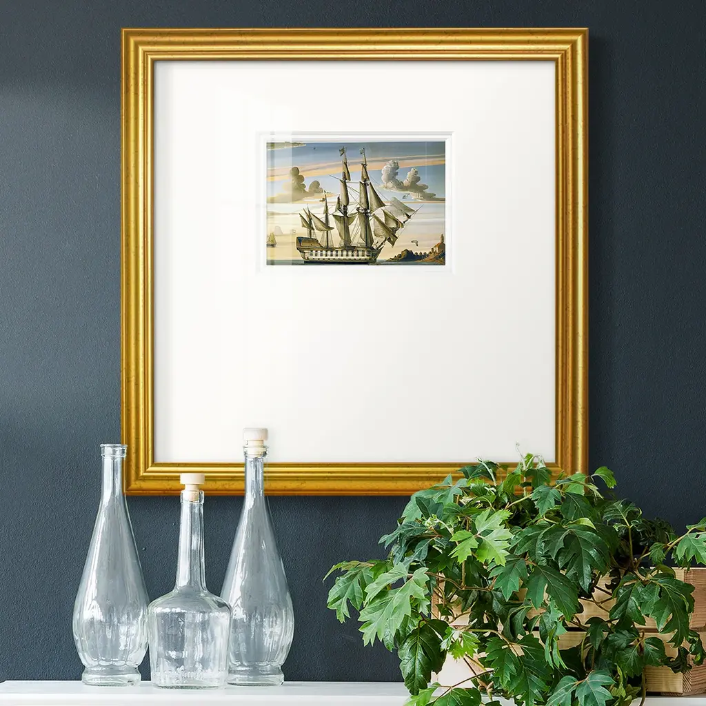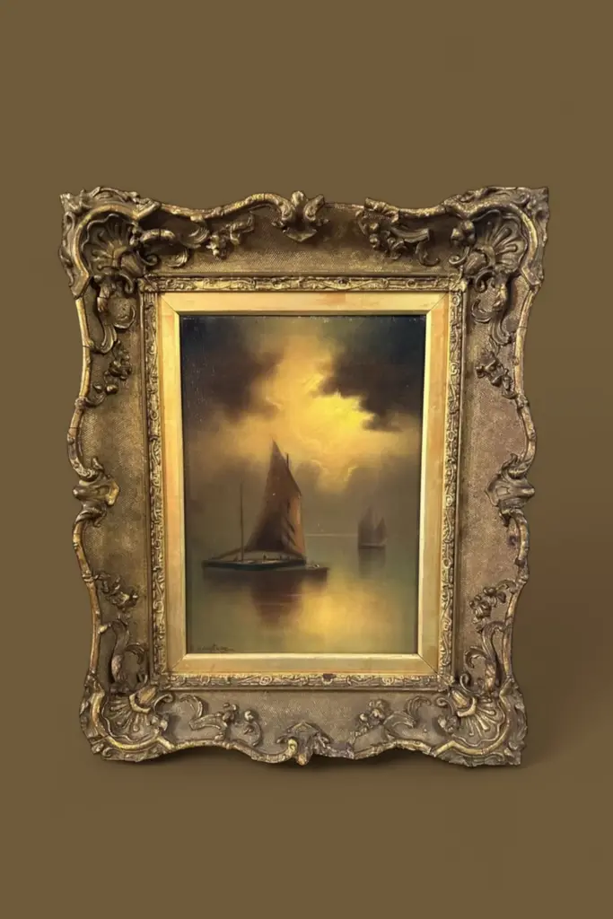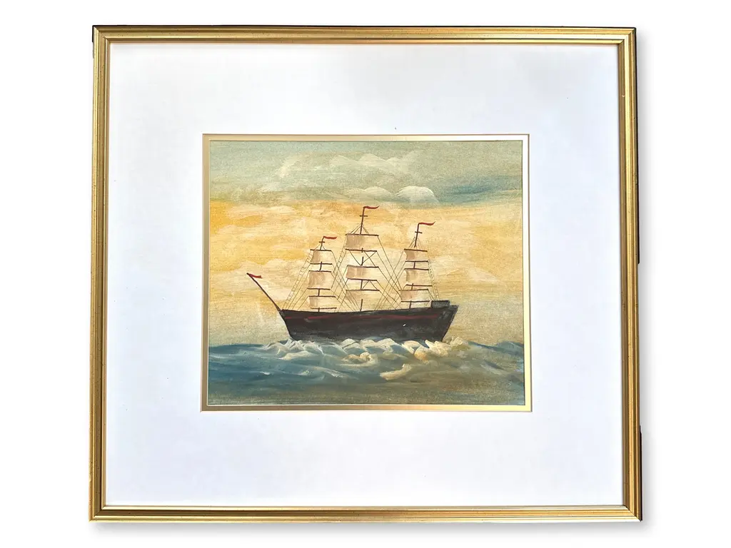 A stunning Folk Art painting of a sailing ship cutting through the waves, set against a serene sky in soft pastel tones. The bold lines and vibrant details evoke the spirit of nautical adventure and craftsmanship. Encased in an ornately carved gold-tone frame, this piece makes a grand statement, perfect for lovers of maritime art or those looking to add a touch of classic elegance to their decor. Unsigned.