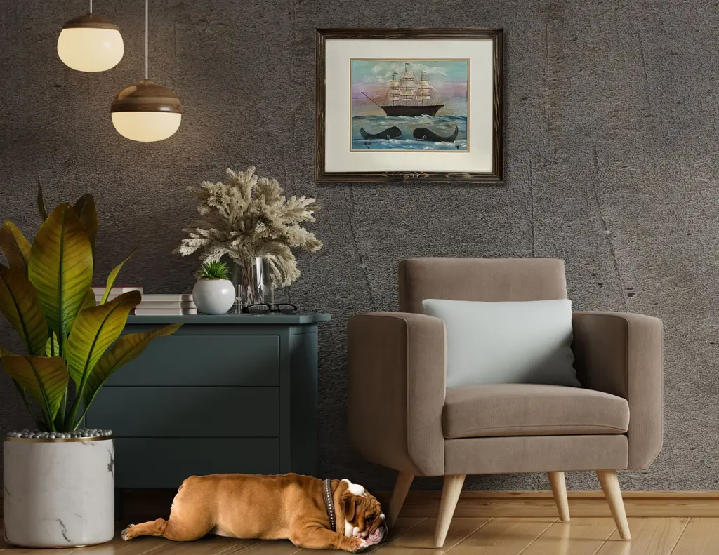 A charming Folk Art painting by a local New England artist in Maine, depicting a ship at sea with two whimsical whales surfacing in the foreground. The vibrant colors and playful details capture the essence of maritime life with a touch of humor and artistry. Newly custom framed in a rustic wood frame, this piece adds character and coastal charm to any space, perfect for collectors or lovers of nautical art. Unsigned.
