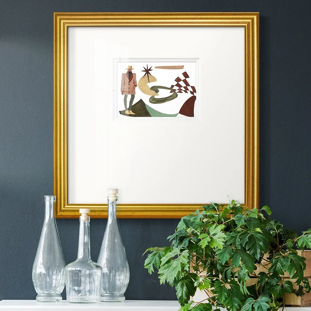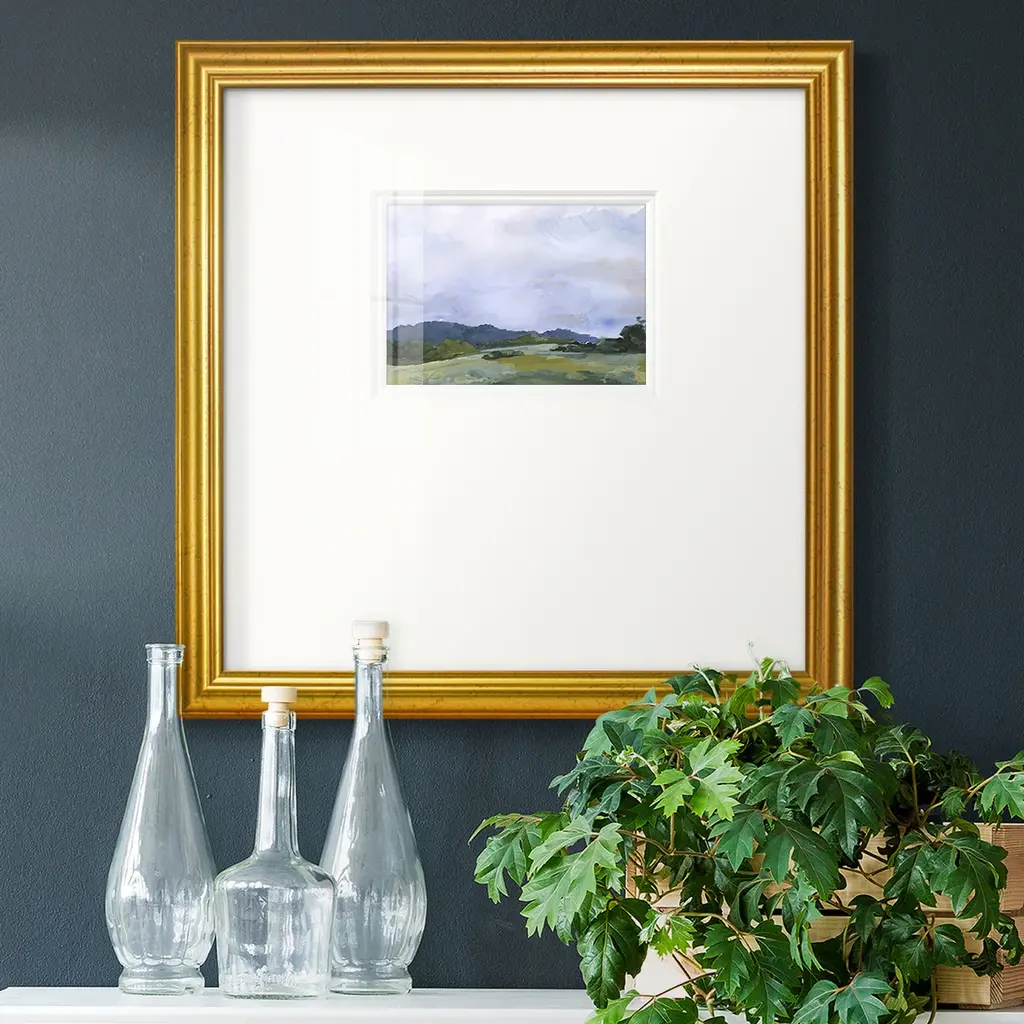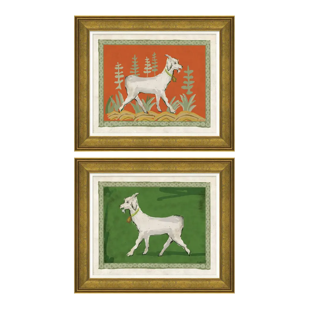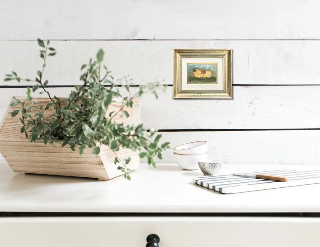 A delightful Folk Art painting of a whimsical sheep adorned with a heart-accented blanket, set against a charming pastoral backdrop. The playful details and vibrant colors evoke a sense of rustic warmth and simplicity. Newly custom framed in an elegant gold-tone frame, this piece is perfect for adding a touch of country charm and personality to your home or collection. Unsigned.