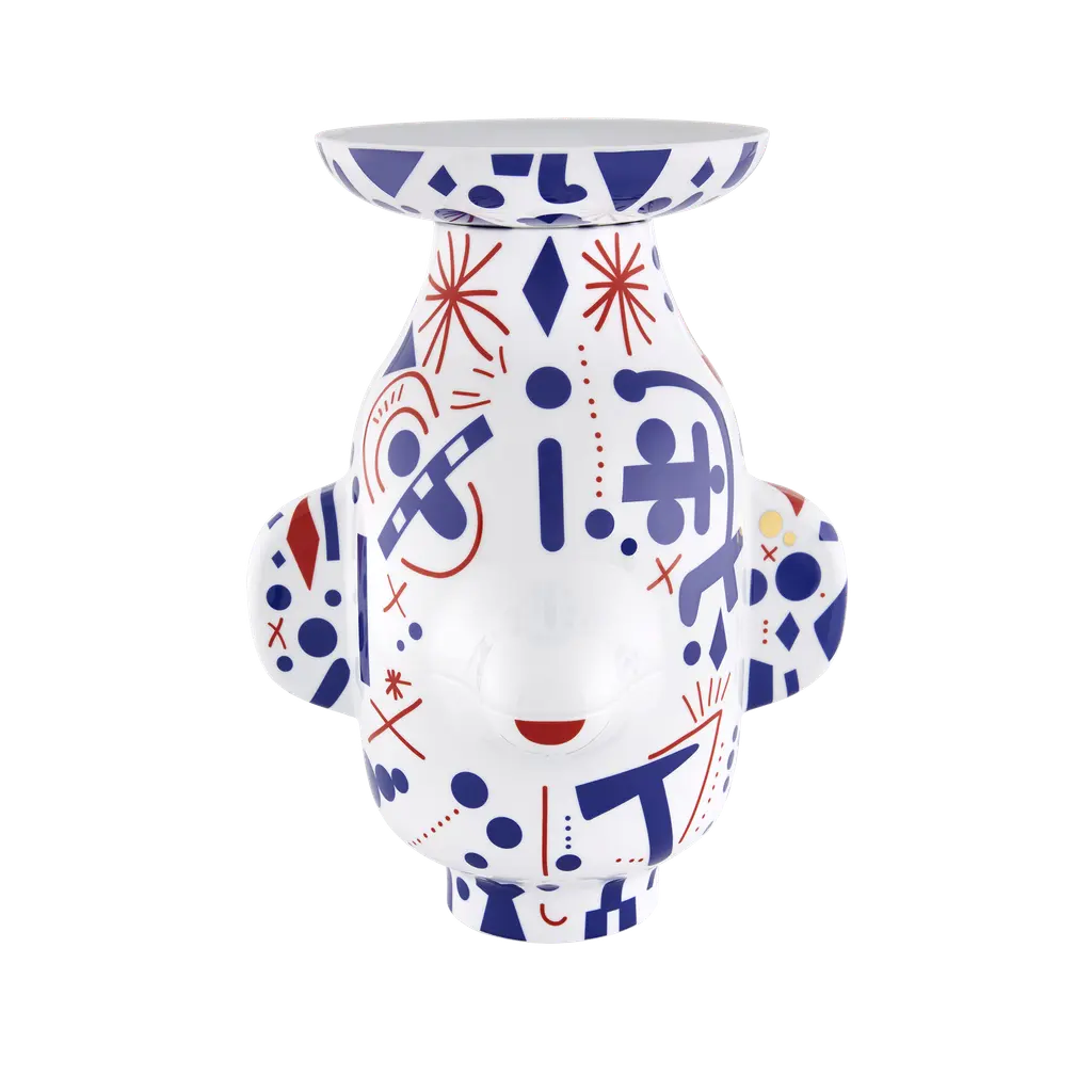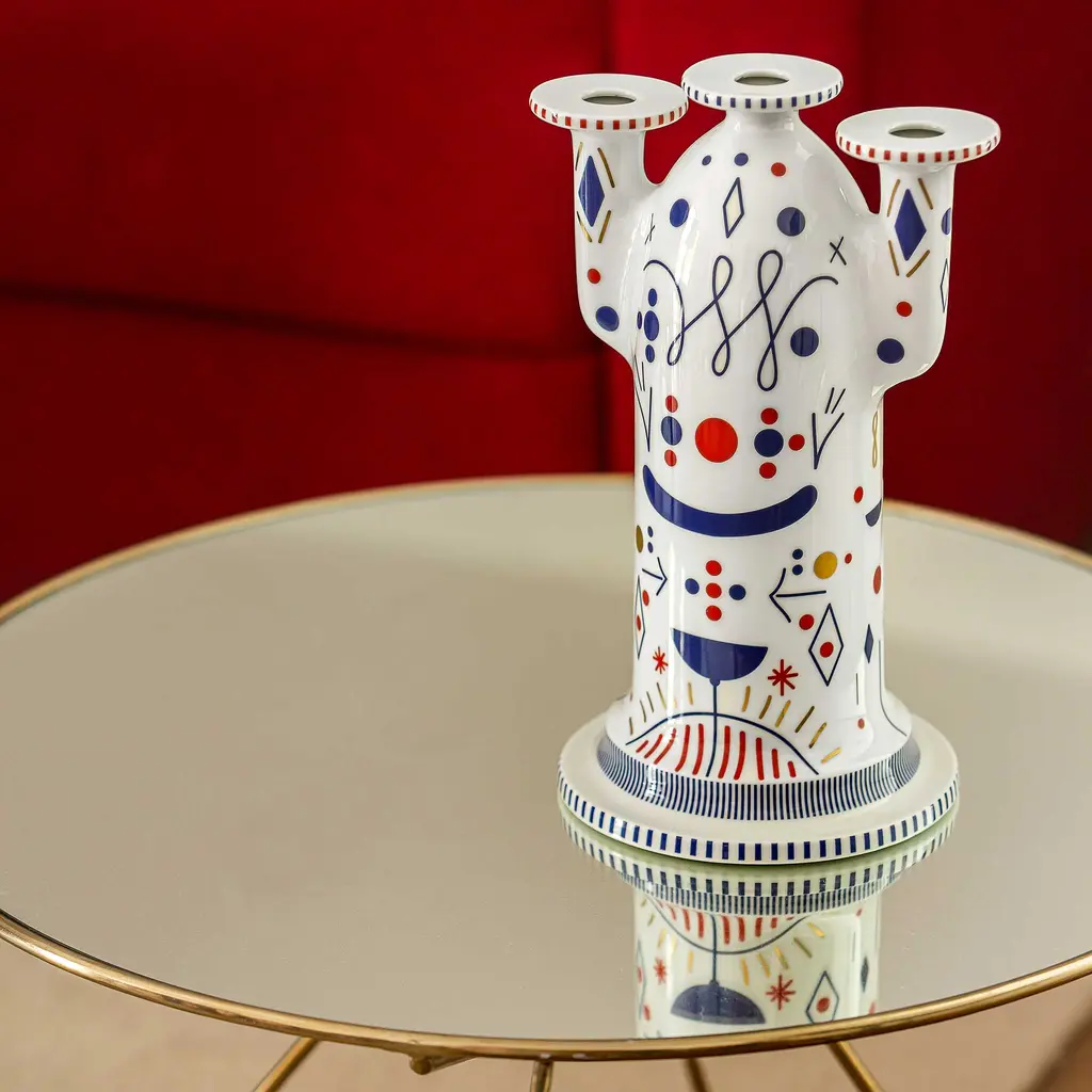 A bold, unmistakable palette of red and blue accented with hints of gold is the unifying aesthetic of the Folkifunki collection by Jaime Hayon. Created for Vista Alegre, each piece in this series of decorative porcelain tableware is adorned with a unique artwork inspired by animals, plants, masks or images, including elements of national folklore. This candleholder offers a slot in which to place a single candle and can equally be displayed independently as an original piece of art.