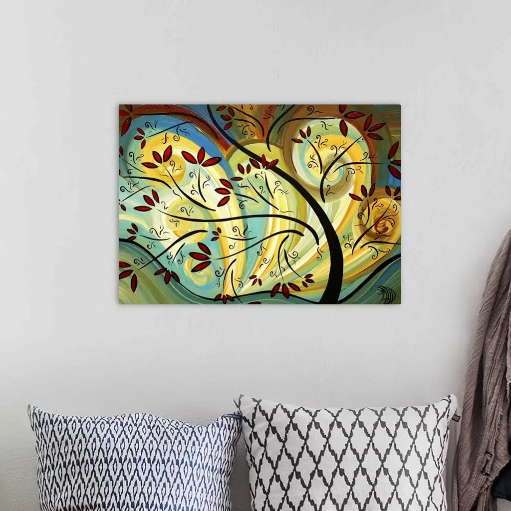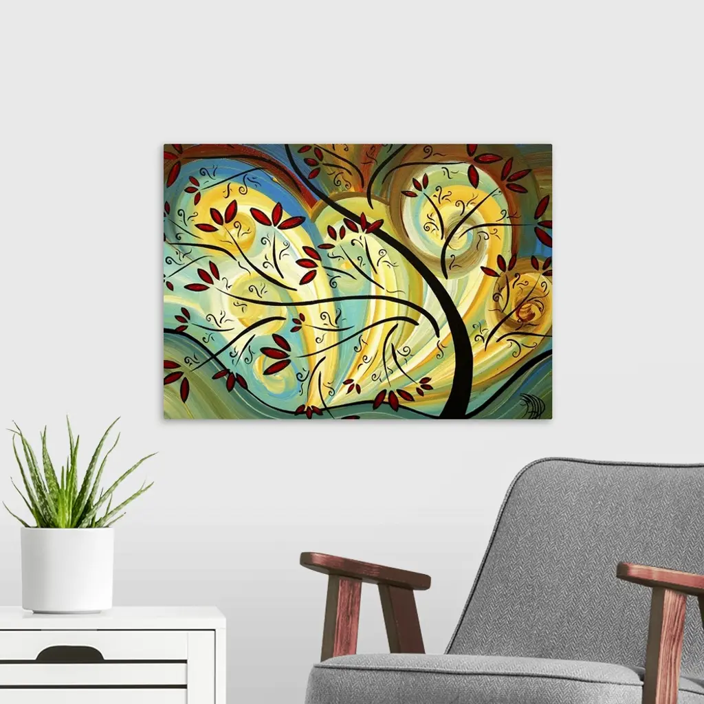 Huge canvas art depicts a tall deconstructed tree positioned on a rolling hill with a backdrop full of vibrant earth tones. Artist heavily emphasizes the use of curved lines and swirls to generate the tree and surrounding landscape.