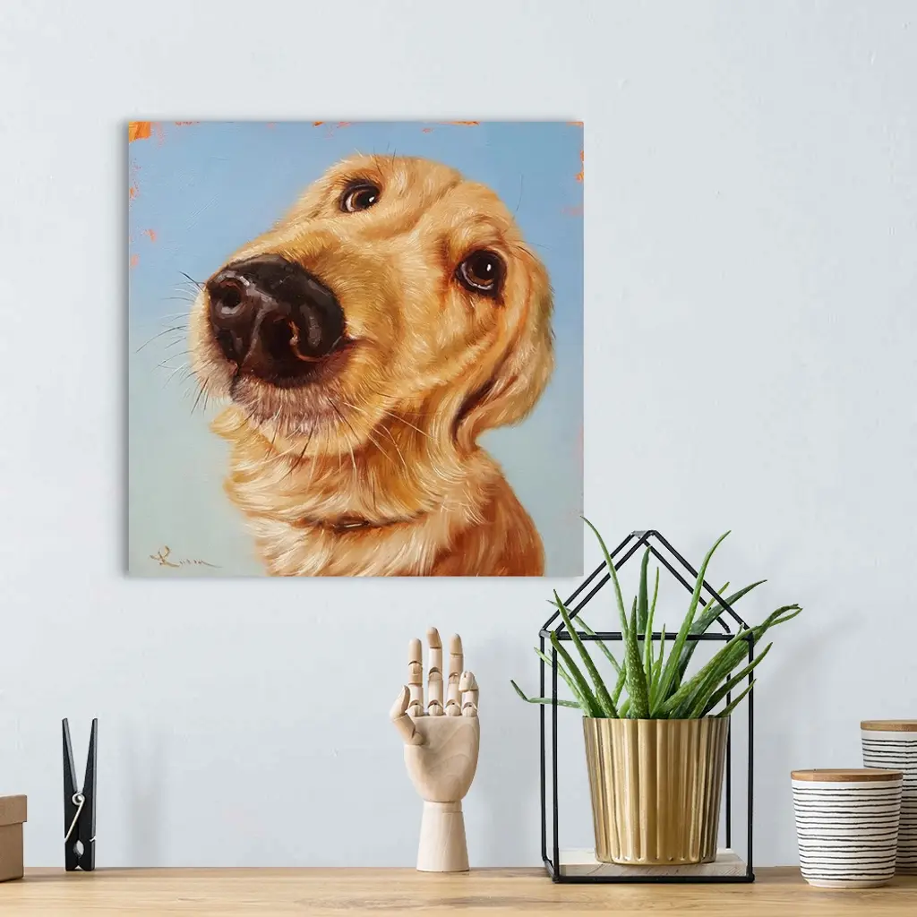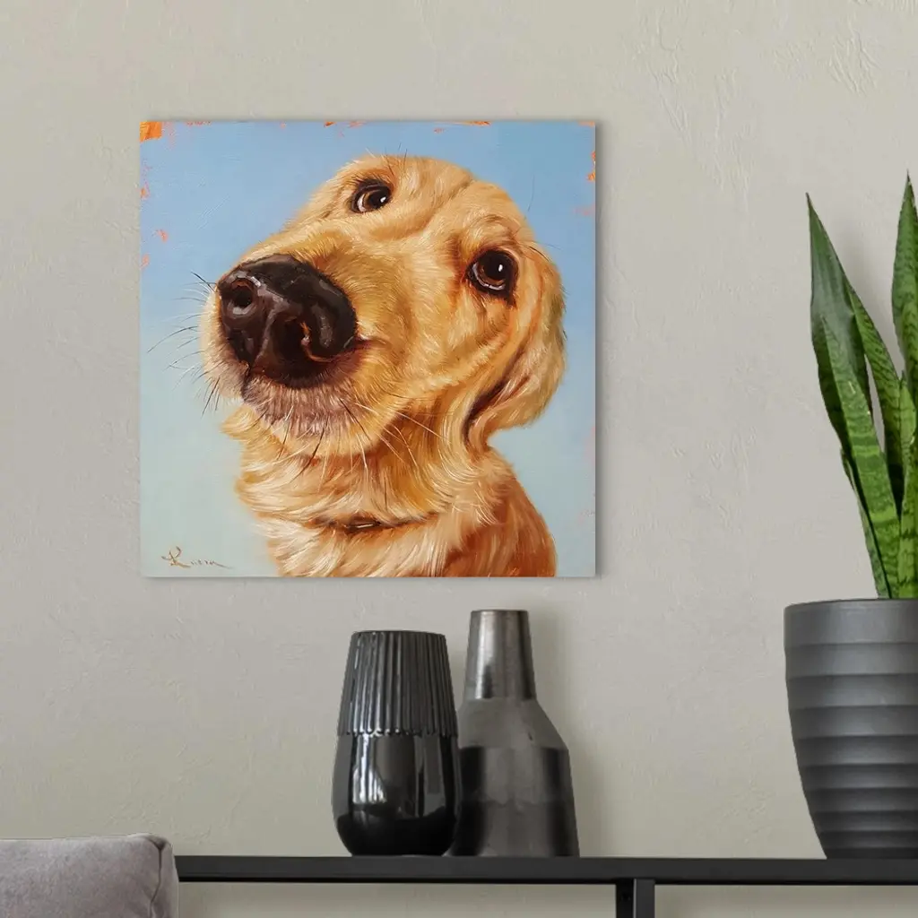 A contemporary painting of a yellow labrador against a blue backdrop.