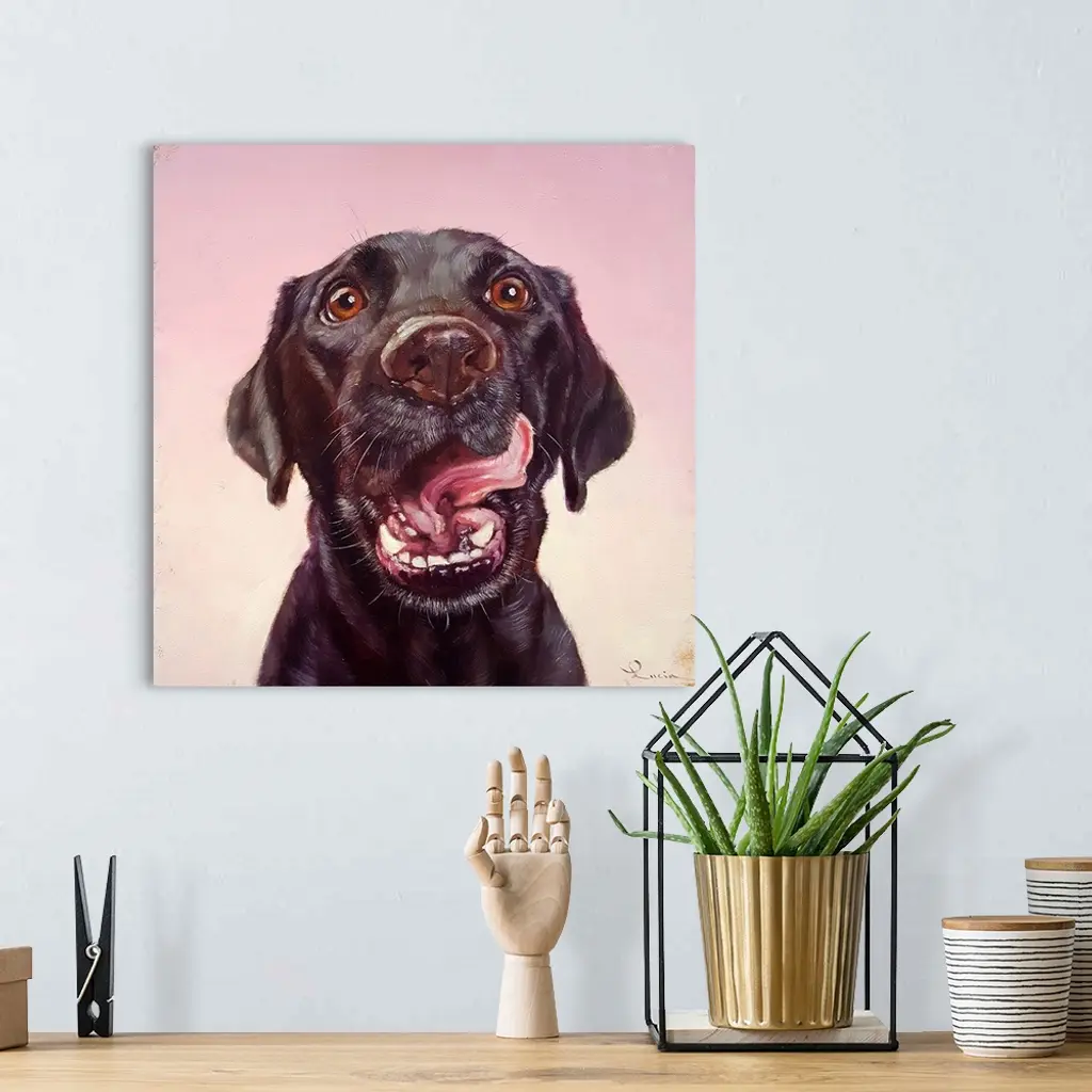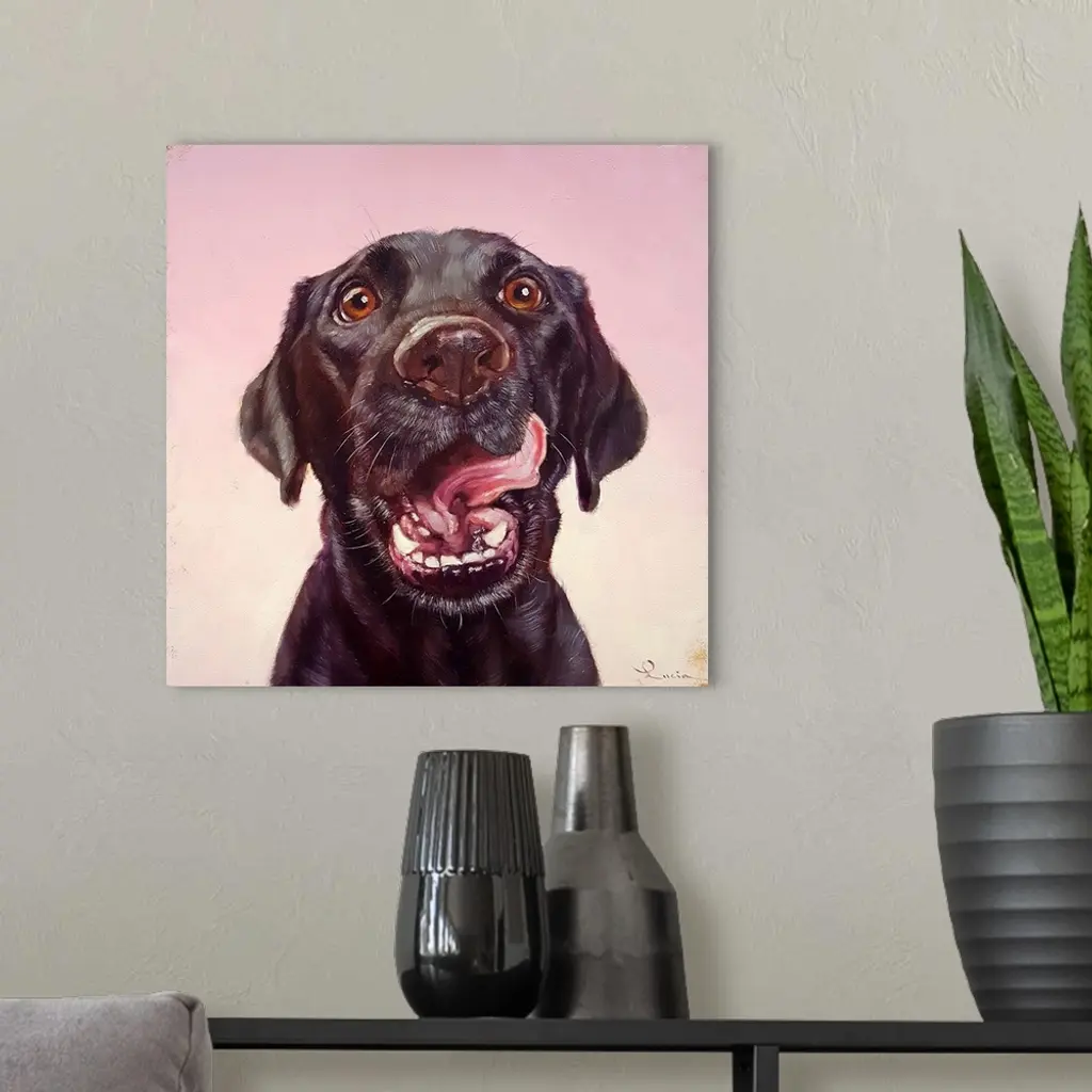 A contemporary painting of a black labrador against a pink backdrop.