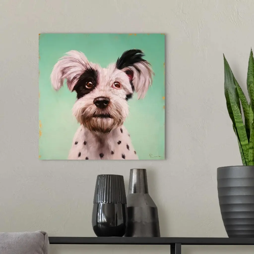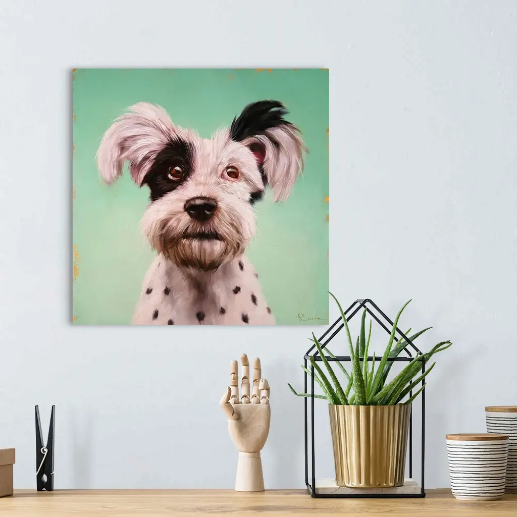 A contemporary painting of a terrier against a green backdrop.