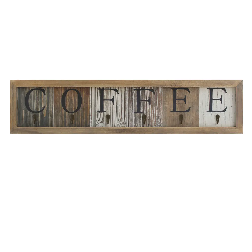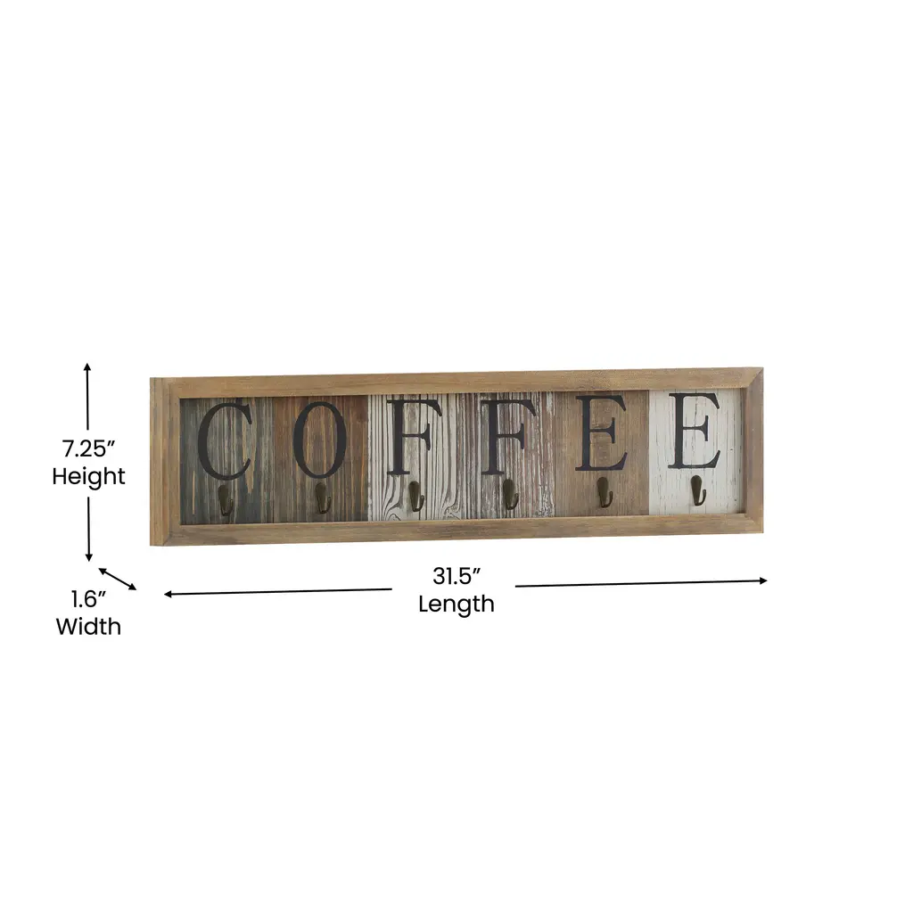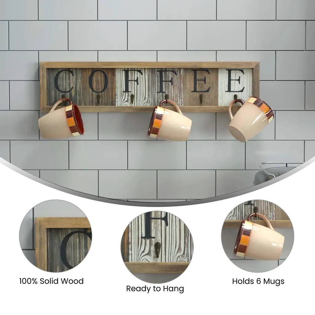 Folston Wooden Wall Mount Distressed Printed Coffee Mug Organizer With Metal Hanging Hooks, No Assembly Required