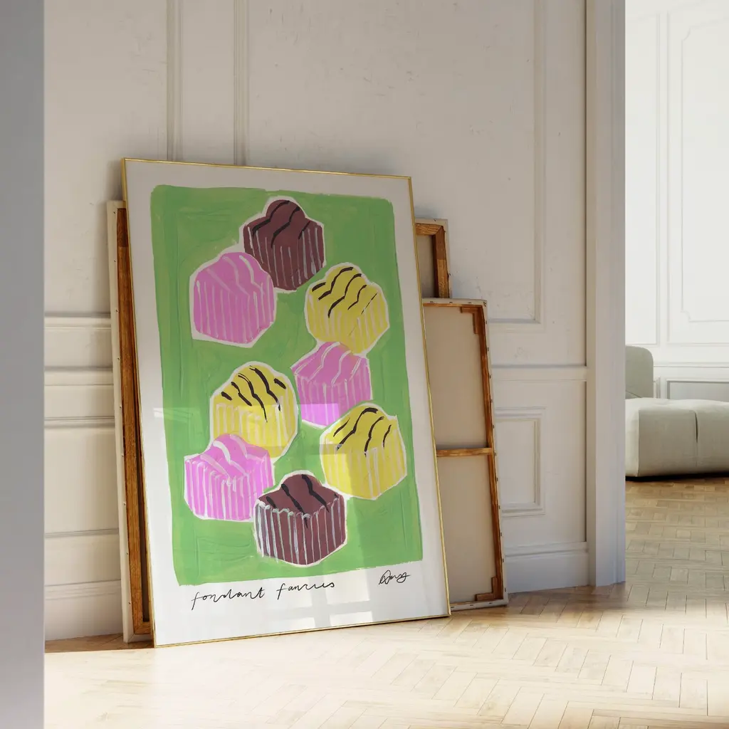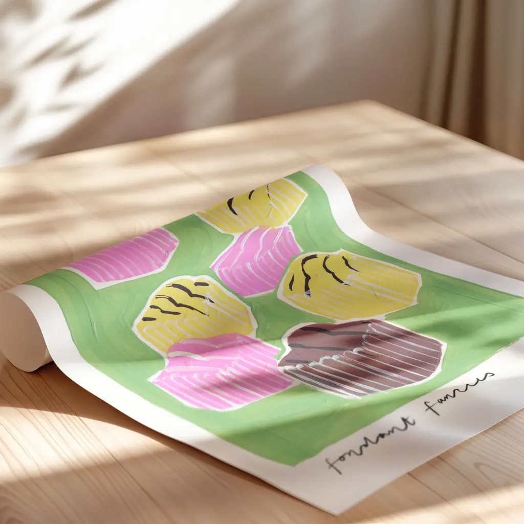 Fondant Fancies Hand Painted Art Print - A3Hand painted by Natalie and made into a beautiful print, this print is a perfect addition to any home decor. Smooth fine art 230 gsm matte card. Printed with vivid colour and detail. Sold without a frame.