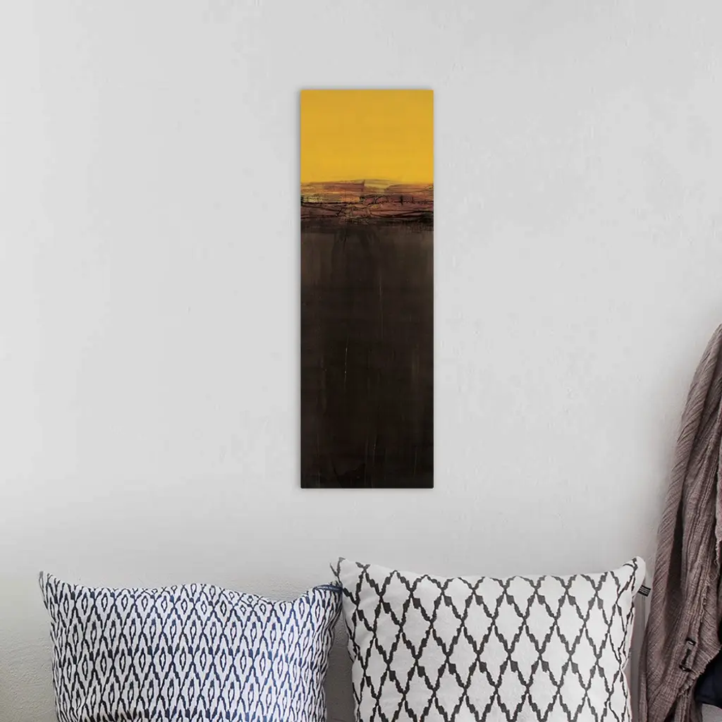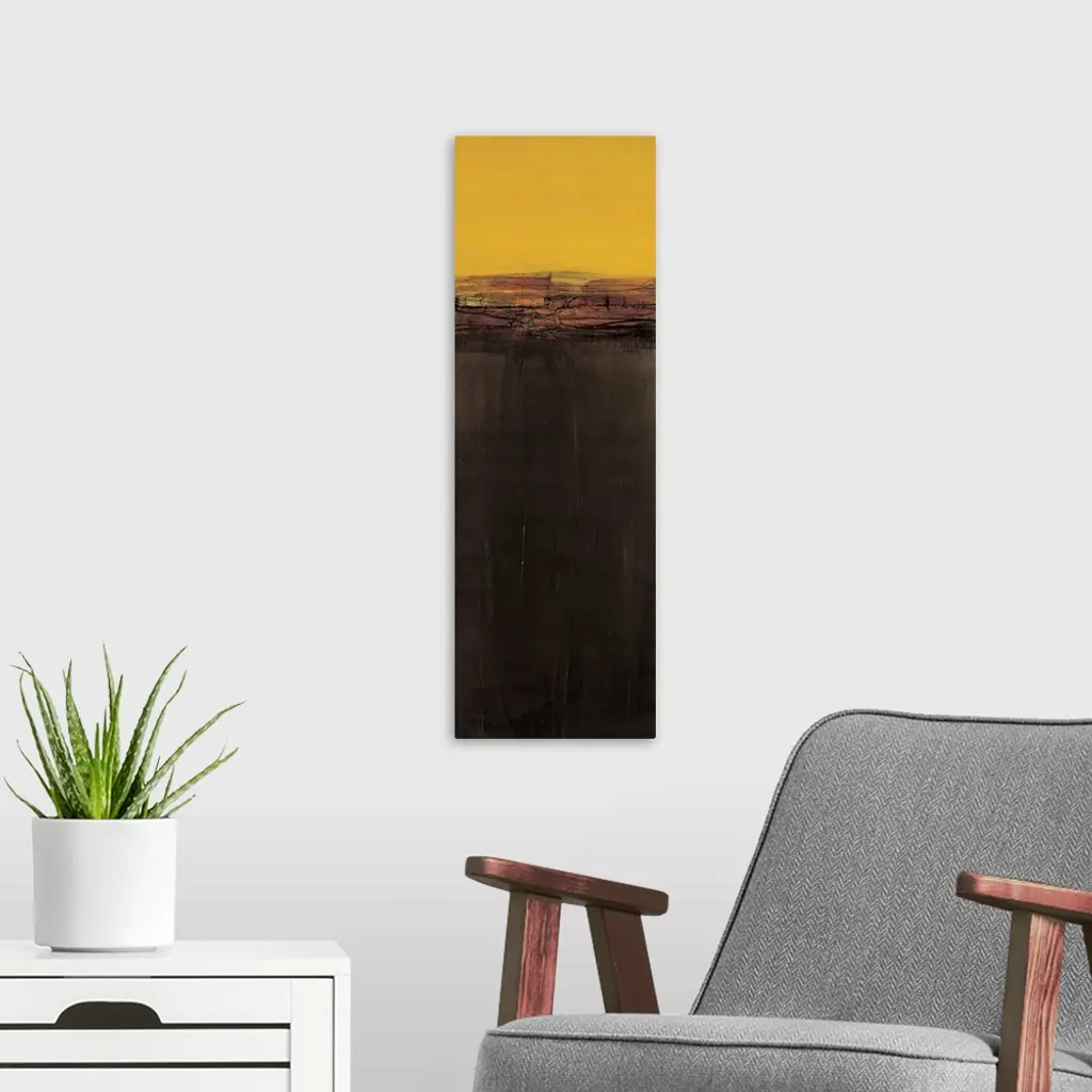 Contemporary abstract painting using golden yellow and dark brown to create a color field.