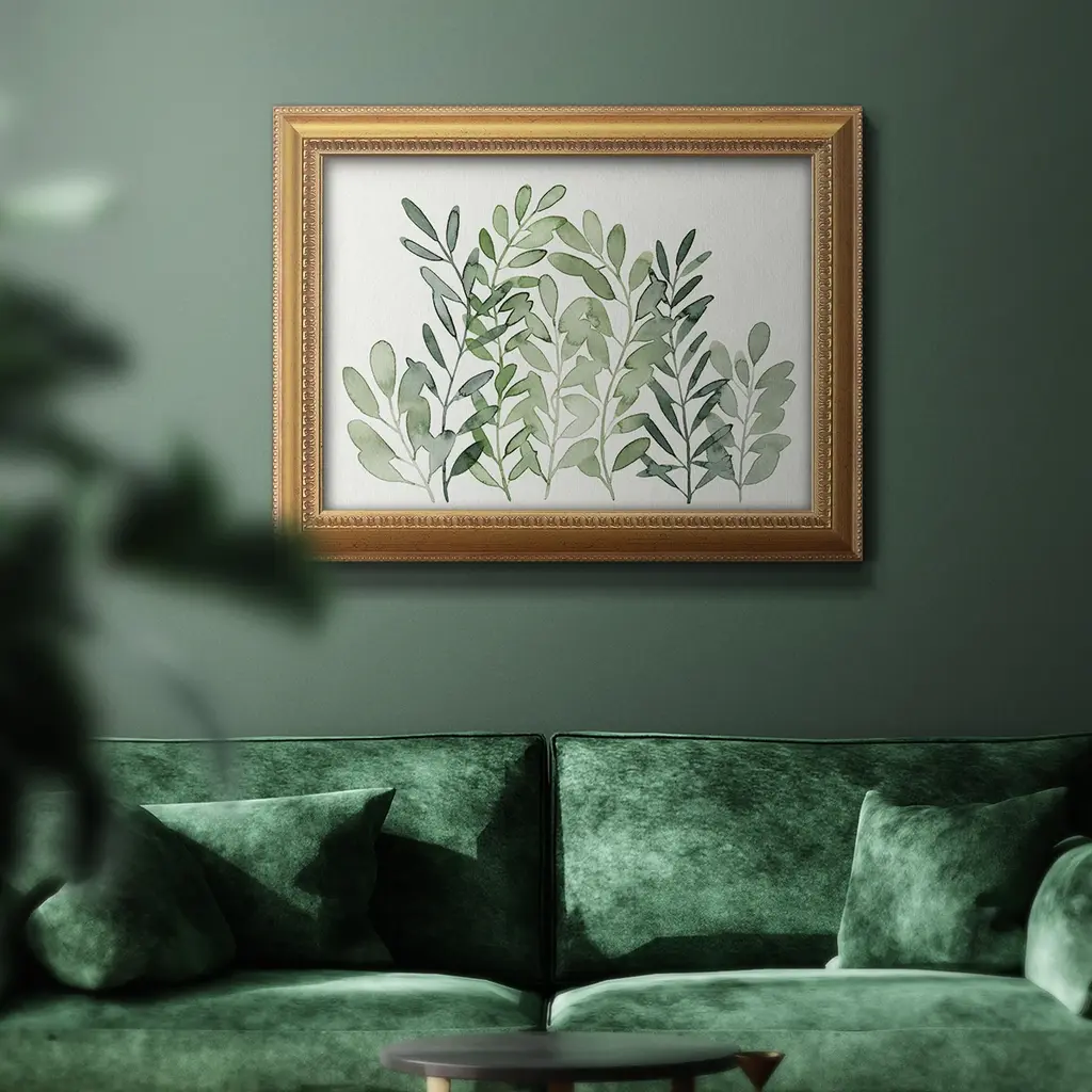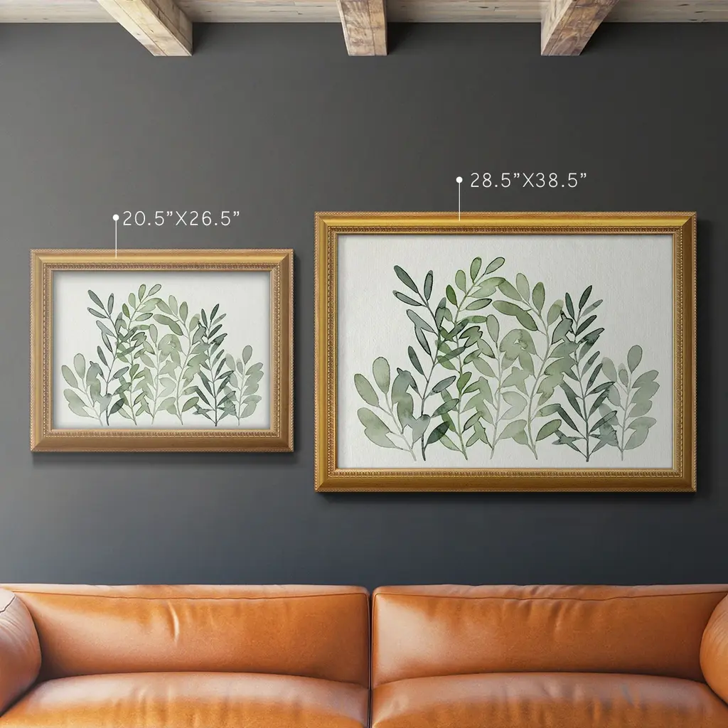 Foraged Greens II Premium Framed Canvas- Ready to Hang A Premium Framed Canvas created to last. Framed in distressed wood and available in an array of sizes and colors Featuring a beveled a solid wood stretcher bar, each piece comes ready to hand 3 SIZES AVAILABLE 16''X20'' - Overall Size 18'X27'' - Overall Size 24''x36'' - Overall Size Each piece is made to order. Each piece comes with hanging hardware. Made in the USA Ready to Hang Giclee Paper Print Acrylic Glass Beveled Matt Board