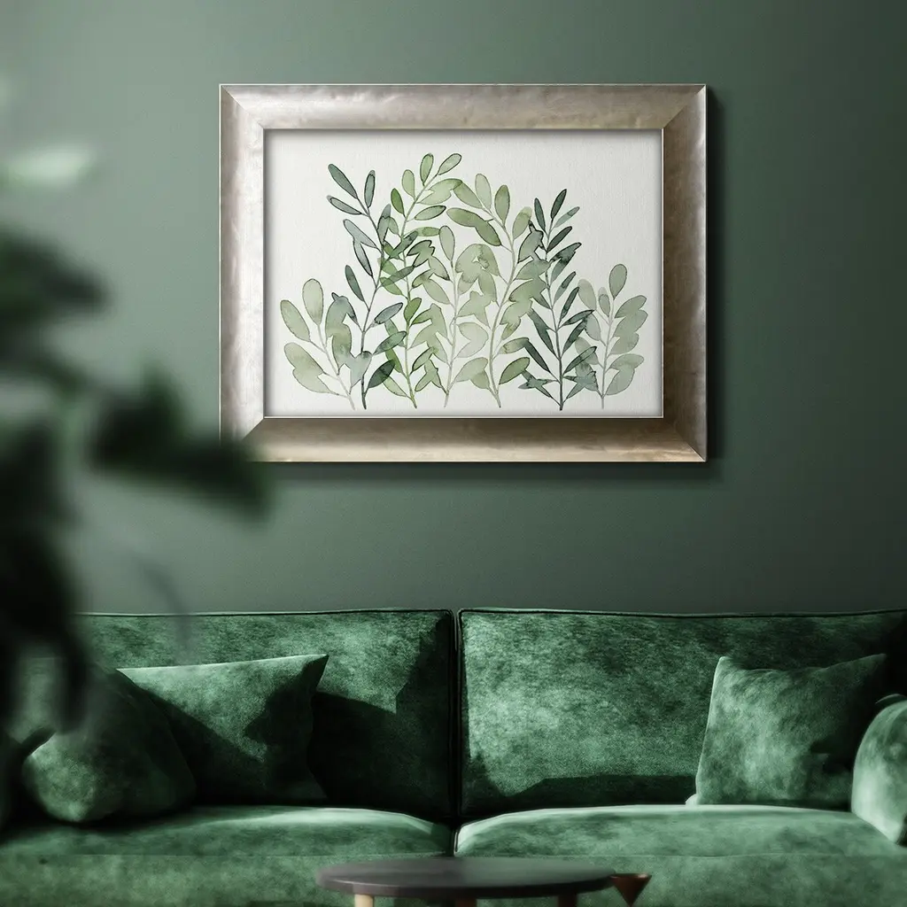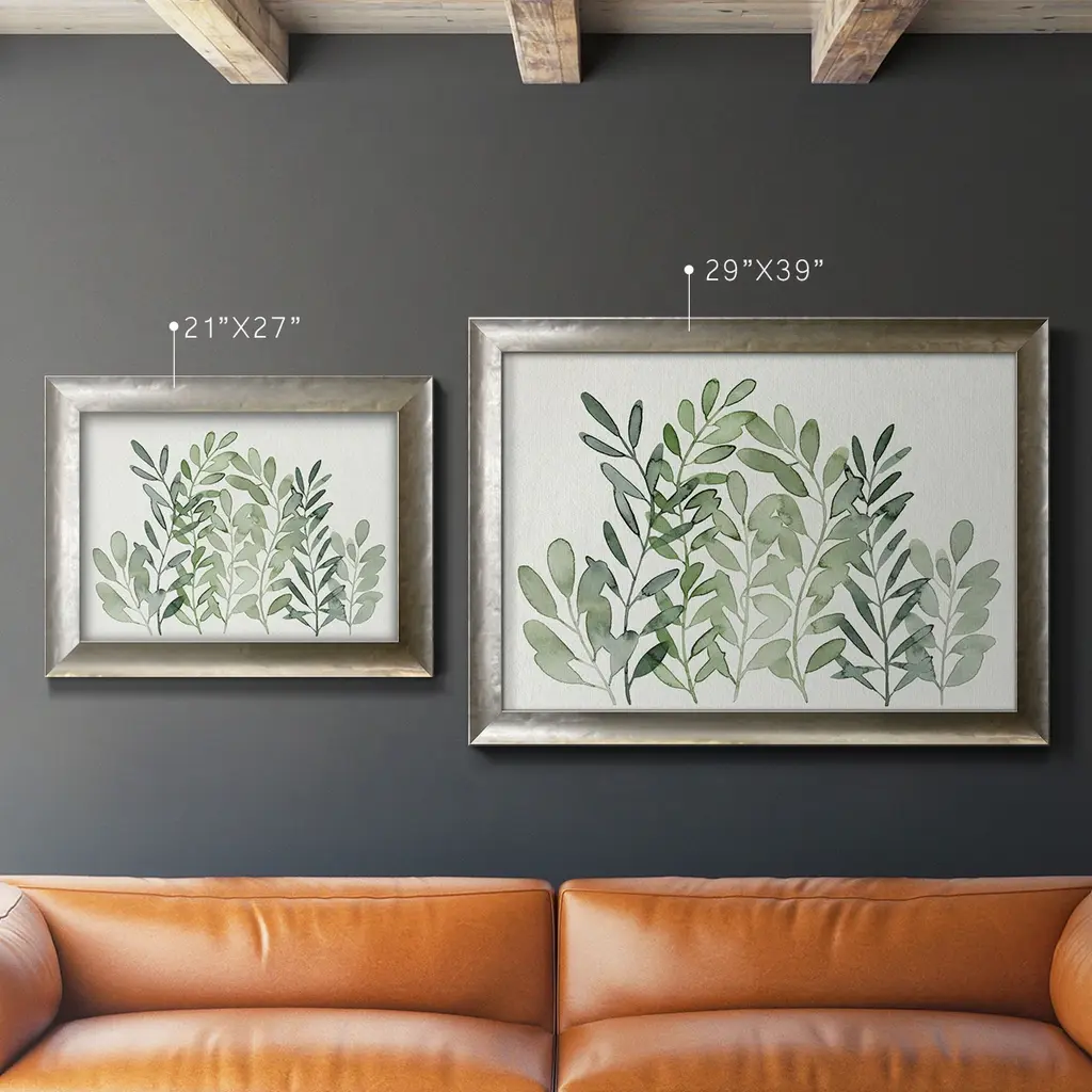Foraged Greens II Premium Framed Canvas- Ready to Hang A Premium Framed Canvas created to last. Framed in distressed wood and available in an array of sizes and colors Featuring a beveled a solid wood stretcher bar, each piece comes ready to hand 3 SIZES AVAILABLE 16''X20'' - Overall Size 18'X27'' - Overall Size 24''x36'' - Overall Size Each piece is made to order. Each piece comes with hanging hardware. Made in the USA Ready to Hang Giclee Paper Print Acrylic Glass Beveled Matt Board