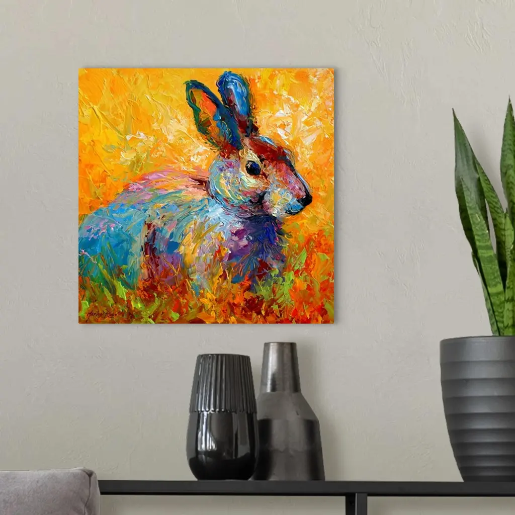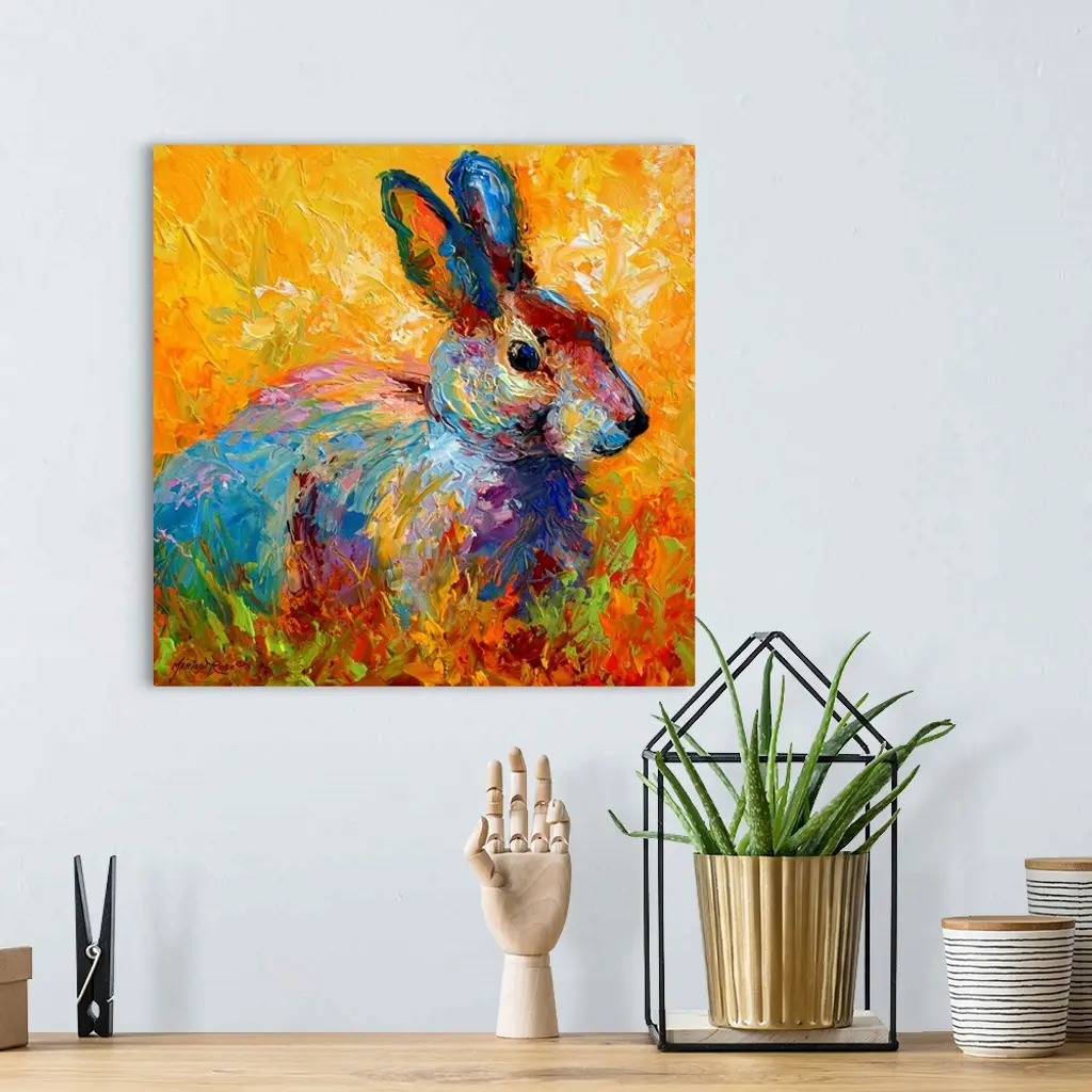 A square painting of a wild rabbit painted with wild and unexpected colors.