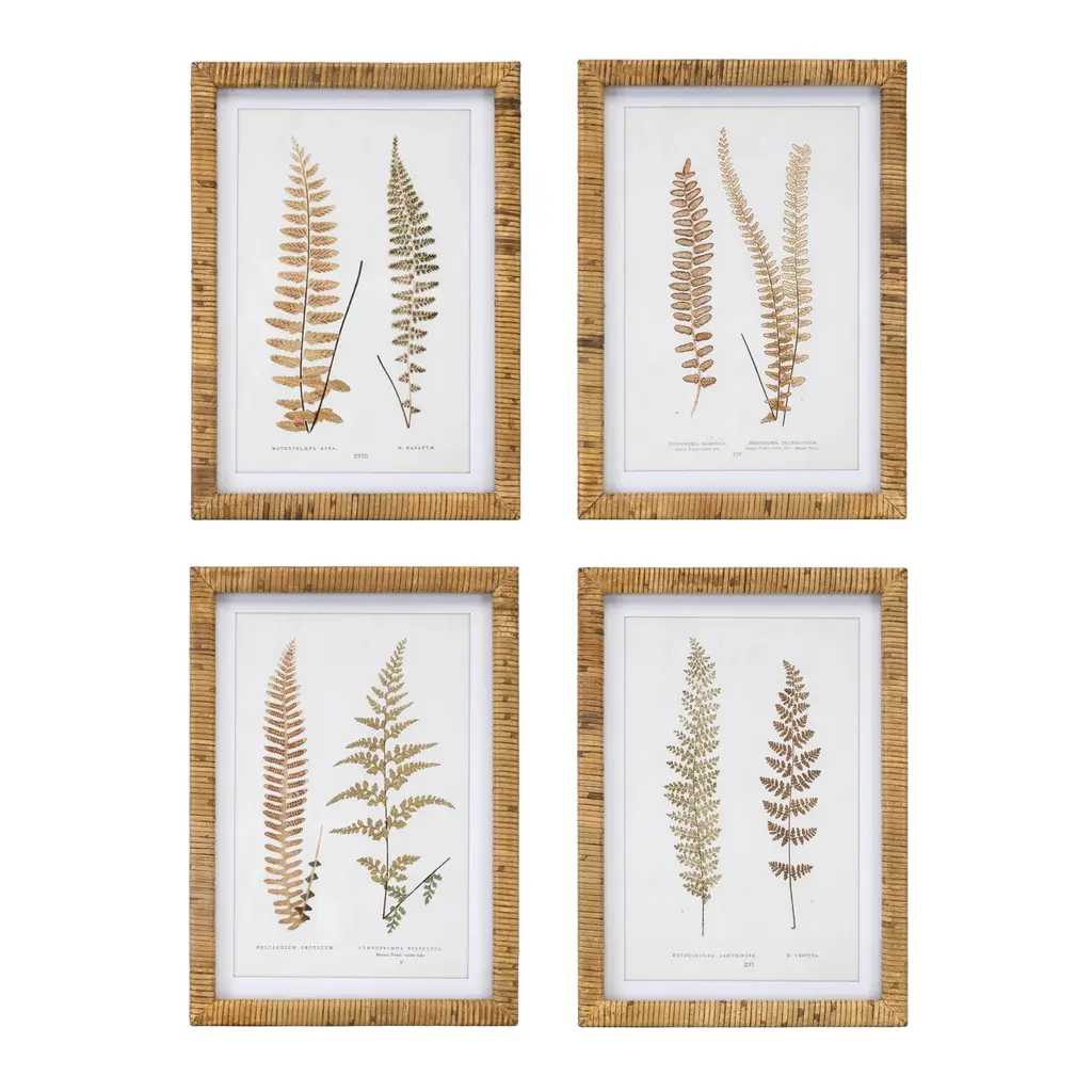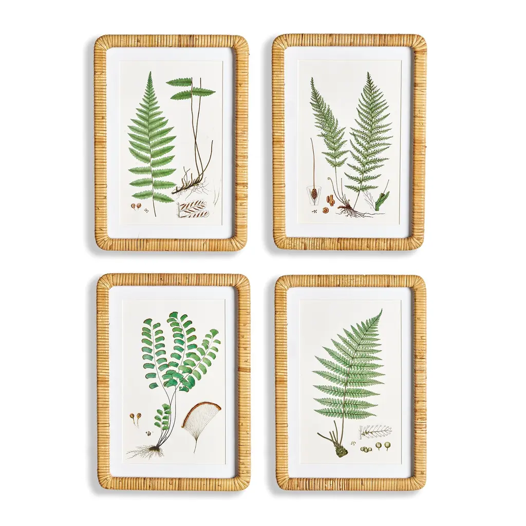 This selection of four classic forest fern illustrations are a handsome set. Finished off with a crisp white mat, and a rattan wrapped frame, they add a touch of nature to home office, hallway or entry.