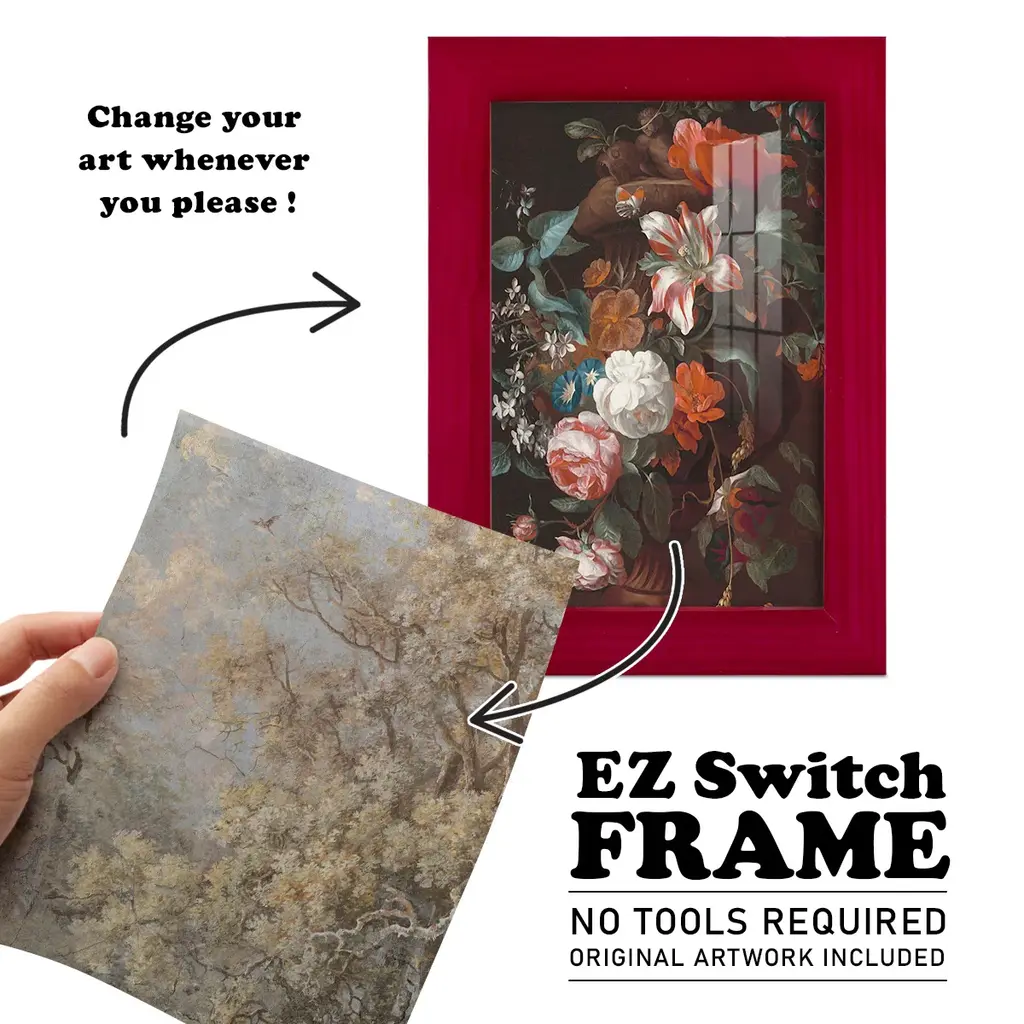 Forest Fresco II -EZ SWITCH Framed Print w/glass-Cherry Red A delightful, framed print. Featuring a solid wood frame with real wood glass. This premium print is giclee quality. In addition, every frame features a removable back and table top stand. This allows you to change your art in the future or to just stand the art on a table for a new look. We are sure you'll enjoy our new series of EZ SWITCH Framed Art. Solid Wood Frame Real Glass Removable / Replaceable Art Built in Tabletop Stand Sizes range from 4x6 up to 12x15 - buy just one or pair them up as sets as you see fit.