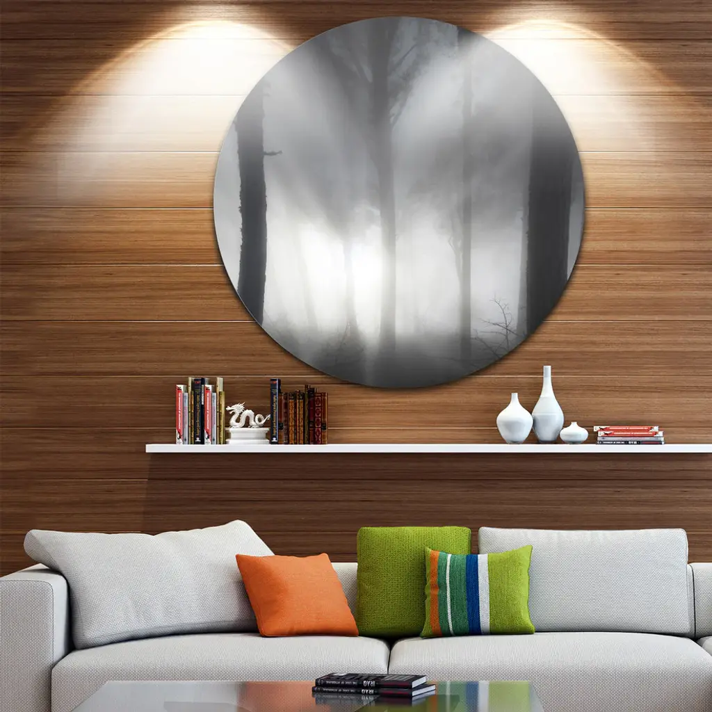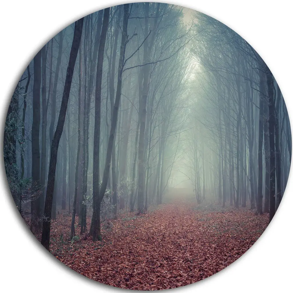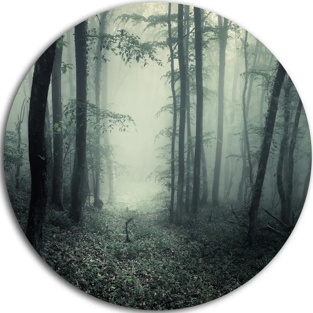 Bring Contemporary Abstraction to your home with this large Circle Metal wall art. This Forest in Heavy Autumn Mist Metal Artwork makes it the focal point of any room or office. - White Gloss Coating ensures colors are extra vibrant with light reflection.- Aluminum grade Sheet Metal with 1 inch mounting frame on the back giving the illusion that the artwork is floating on the wall..- Mounting Brackets are included along with instructions.- High Quality Digital images are created directly into a glossy aluminum panel producing a stunning and captivating print into the glossy finish of the metal.- Water, Fire and Scratch resistant HD Aluminum panels.- Looks better than any photo paper and guaranteed to last at least 20 years- Easy to clean with a microfiber cloth. Colors are far superior to regular Canvas Art. - Easy to Hang