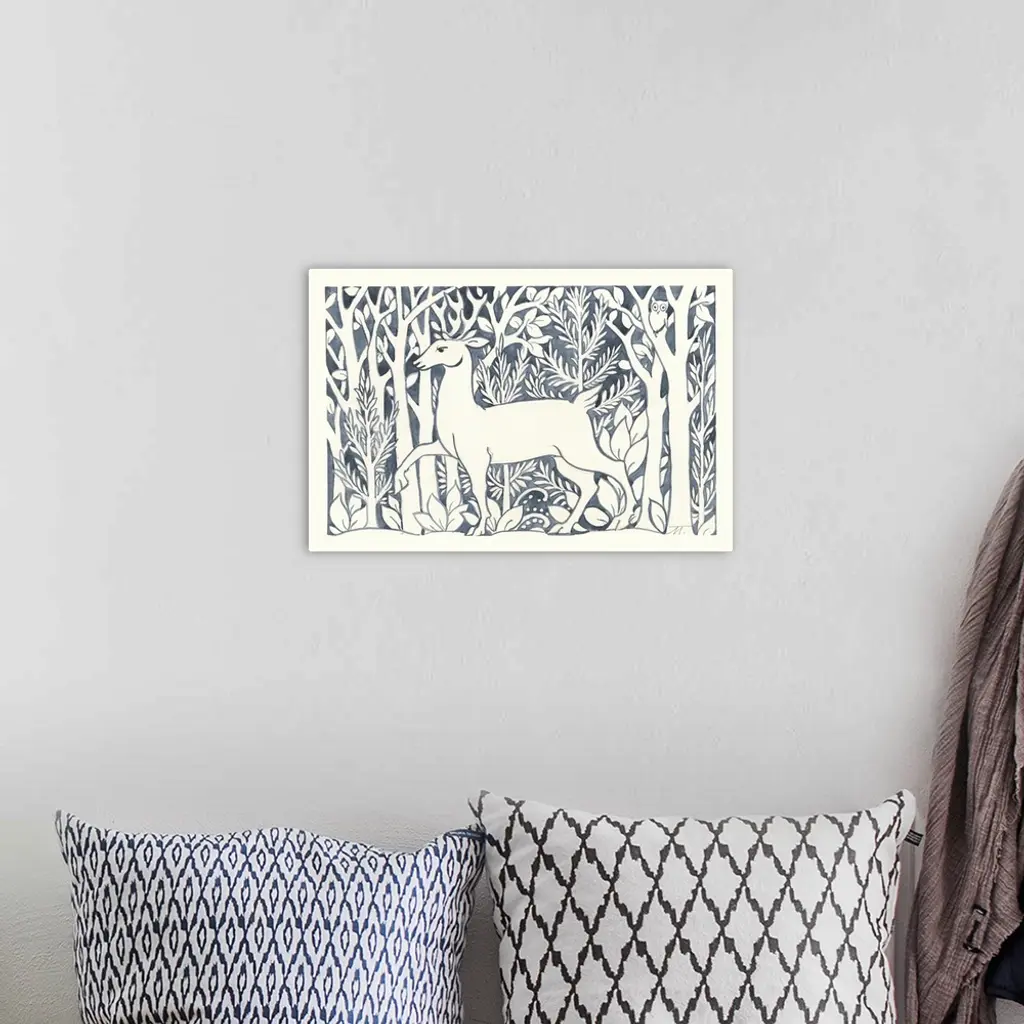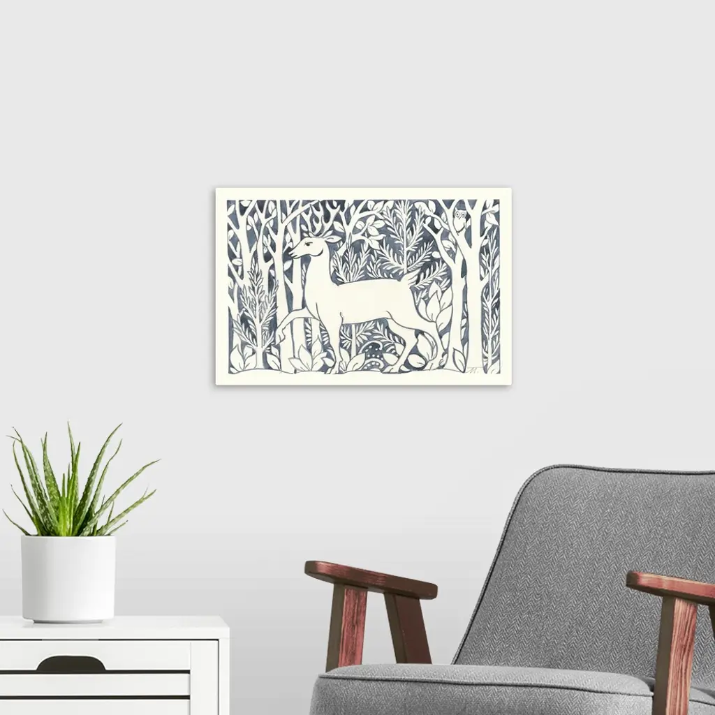 Floral indigo and white watercolor painting with a deer walking through the woods.