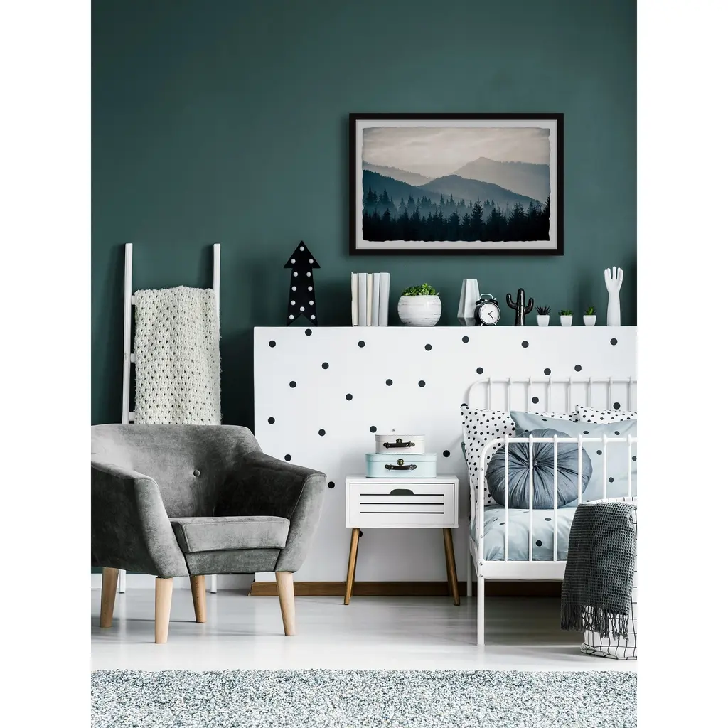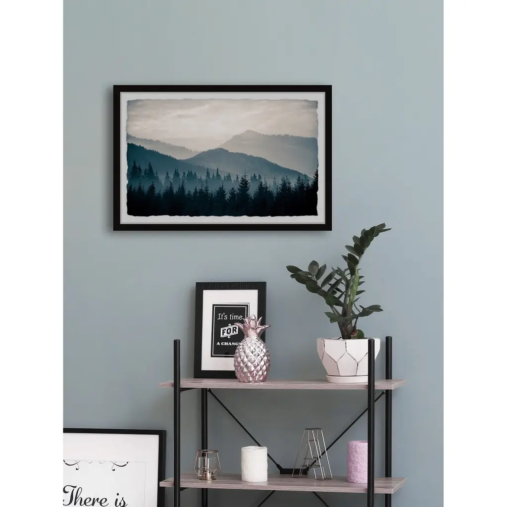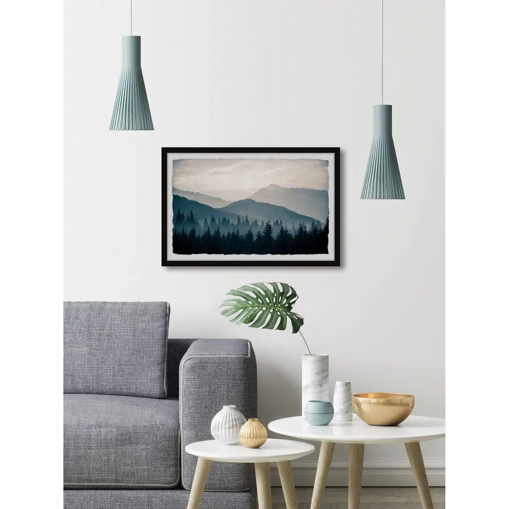 A vast pine forest stretches out over rolling mountain hills, a light mist dancing between the trees as the hills fade out into the cloudy atmosphere. The perfect piece of moody tranquility for a view into nature's majestic beauty. Proudly printed in the USA, this piece is printed on high quality archive paper and professionally hand-framed. With wall-mounting hooks included, this artful accent is ready to hang up as soon as it reaches your front door. • Top quality Giclee print on high resolution Archive Paper • Hand cut deckled edges • High quality durable non-warping frame • Finished under shatter resistant plexiglass • Arrives ready to hang • Includes a certificate of authenticity • Printed in the USA