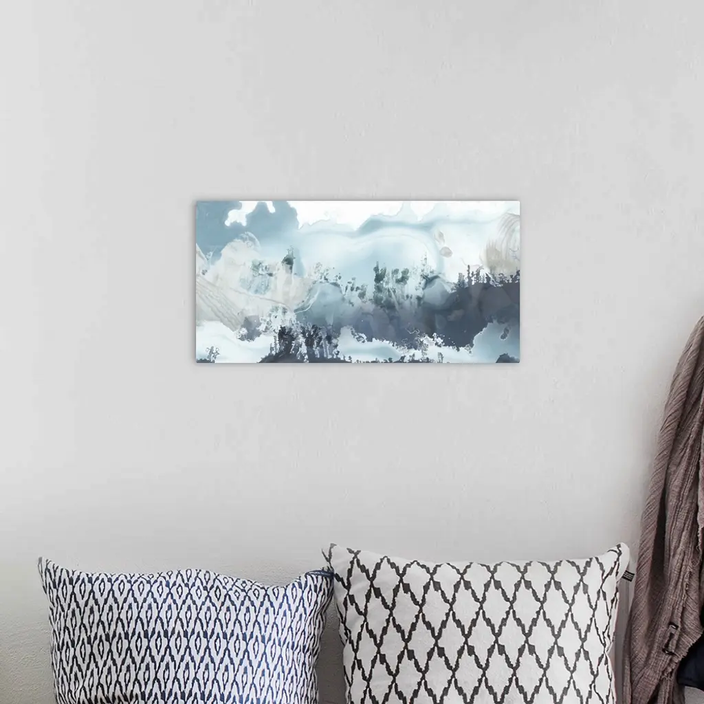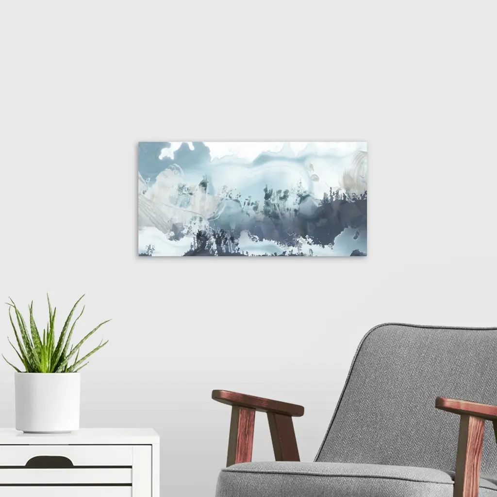 Horizontal abstract painting of blended blue tones of watercolor.
