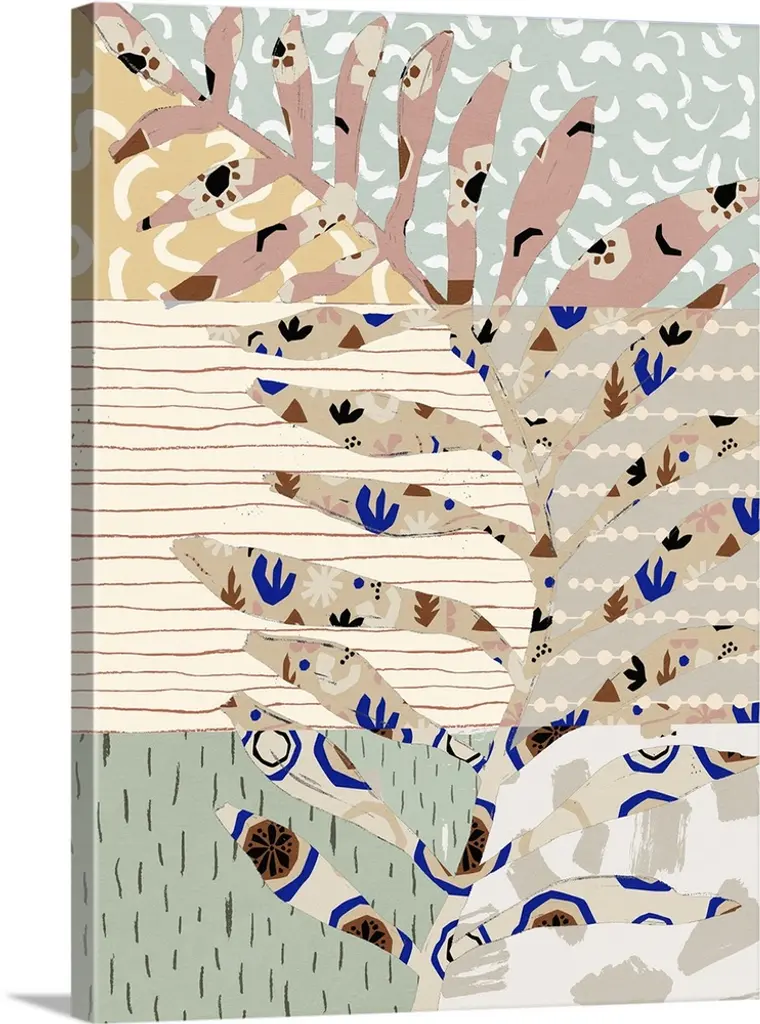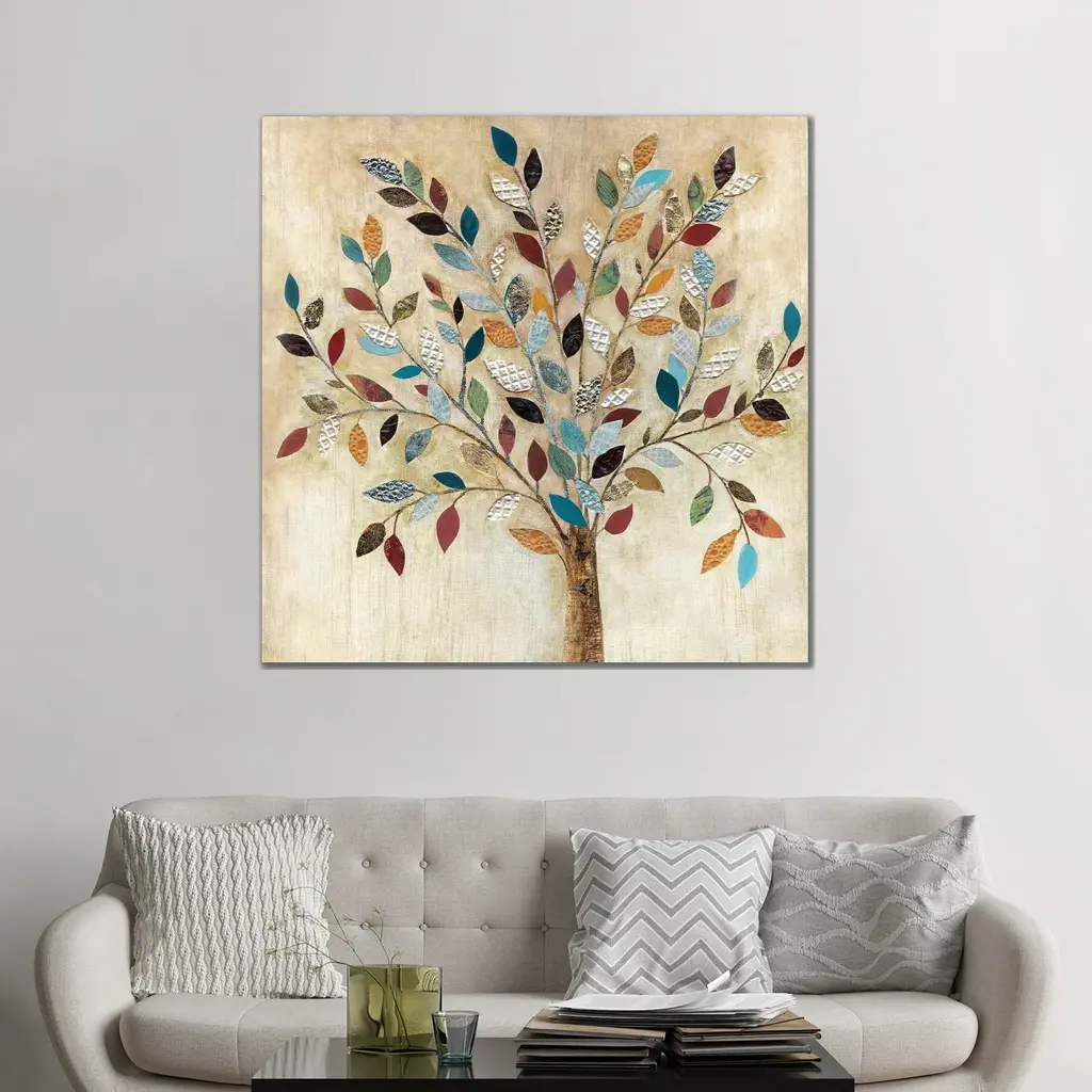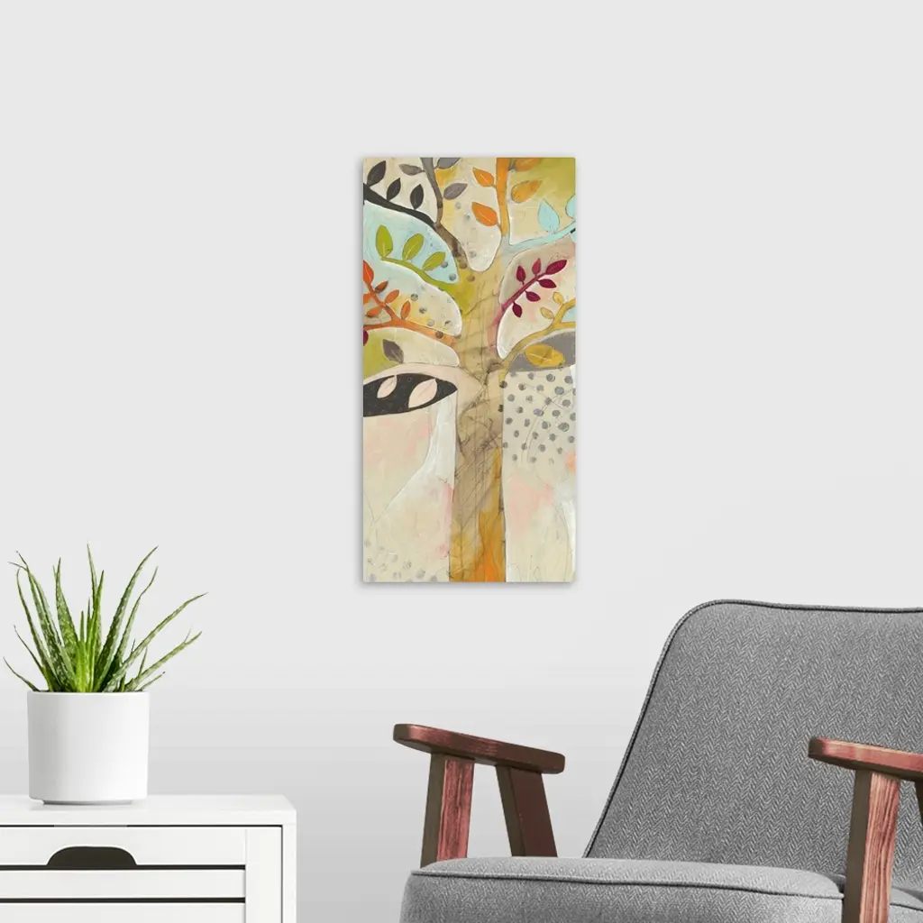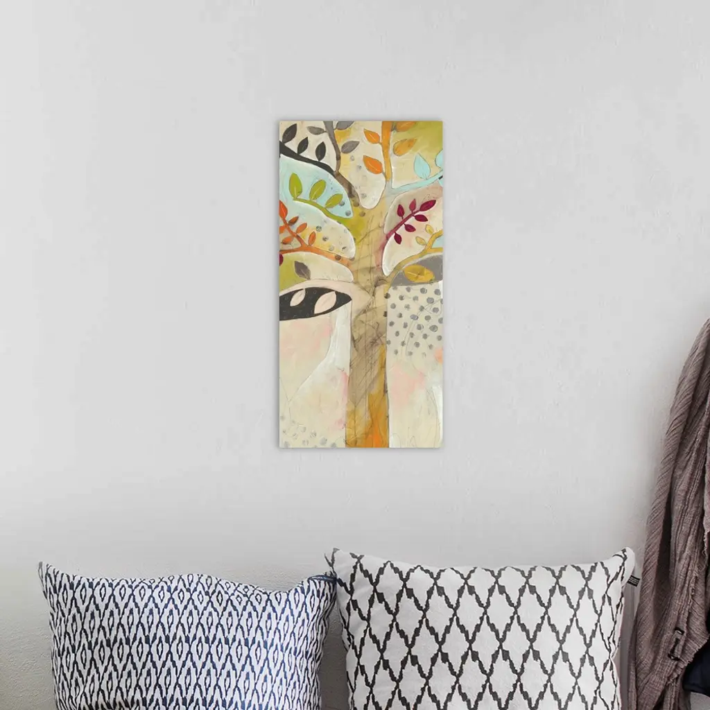 Contemporary painting of a tree using muted browns, oranges and blues.