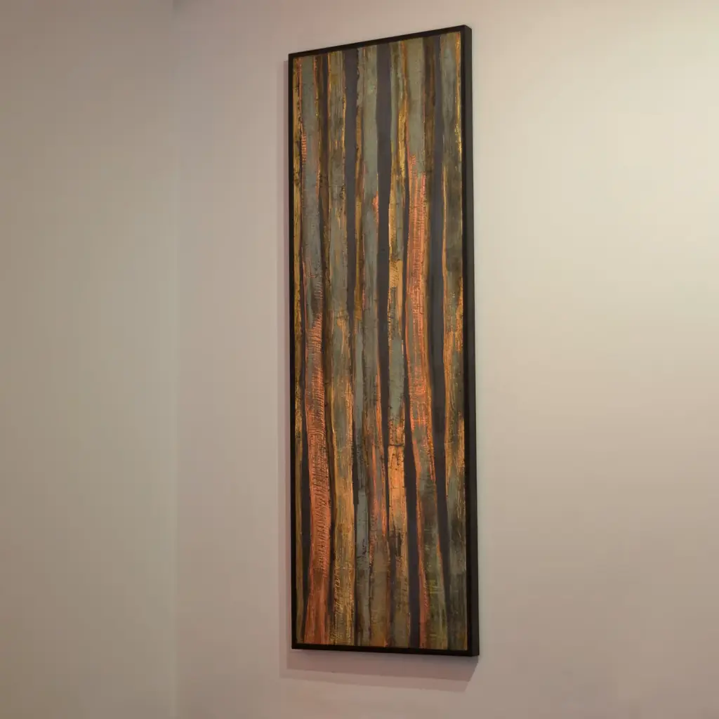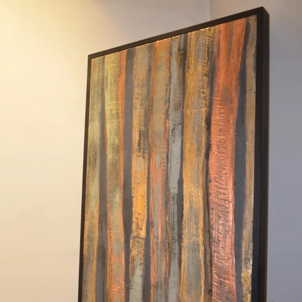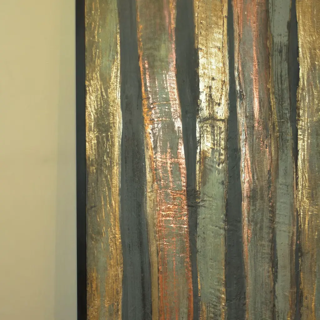 An art exhibition dedicated to life and nature hosted in the Ducal Palace in Pistoia, Tuscany offered artist Alice Corbetta the opportunity to craft a landscape of tree trunks on this stunning painting fashioned of wood. Inspired by the forest as a place to lose and find oneself, it is the result of a mix of techniques and materials where shimmering gold leaf, copper, and oxides alternate with black bole bands to replicate the rich tones of tree bark. Delivered with a certificate of authenticity.