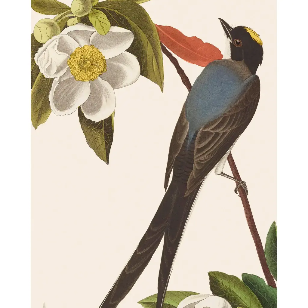 Introducing the Duchess Edition: a refined collection of Audubon Bird Giclée reproductions that elevate the timeless beauty of the original Havell edition hand-colored engravings. Unlike traditional facsimiles, our prints are meticulously enhanced to showcase Audubon's work with unparalleled vibrancy and detail. The Duchess Edition, named for its elegant proportions, measures 20 by 15 inches—smaller than the original Double Elephant and Imperial Editions, yet imbued with a regal, feminine charm. Each Giclée print is produced on premium acid-free cotton rag paper imported from England, ensuring durability and quality. Our use of archival inks guarantees a remarkable lightfastness of up to 200 years, preserving the vivid colors and intricate details for generations to come. Each print is framed in a stunning black and silver moulding imported from Italy. This beautiful frame features a wood veneer with silver detailing on both the inner and outer lips, adding a touch of sophistication to the presentation. The overall dimensions of the frame are 17.75 by 22.75 inches. The framed prints are completed with acrylic glazing, a paper dust cover on the back, and a wire for easy hanging. Experience the highest quality reproduction available on the market and enjoy the exquisite artistry of Audubon as never before. Often found in pastures, forests, and mangroves, the forked tailed flycatcher is named for its distinguishably long, forked tail. The forked tailed flycatcher symbolizes courage and perseverance.