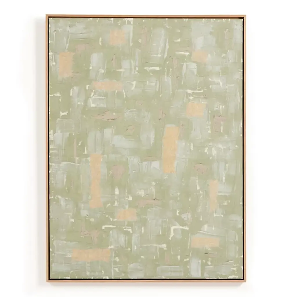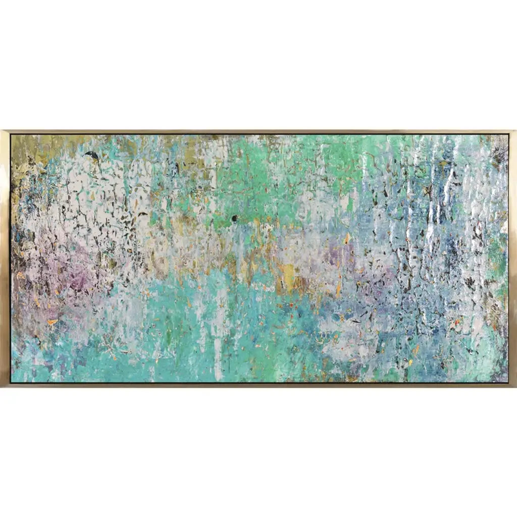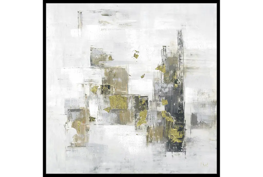 Form by artist Philippe Hugonnard is an abstract giclee on canvas with a satin texture, showcasing warm shades of gold leaf and pink among an ethereal background of grays and blues. This stunning artwork is held within a gold floater frame and may be displayed in both vertical and horizontal orientations.