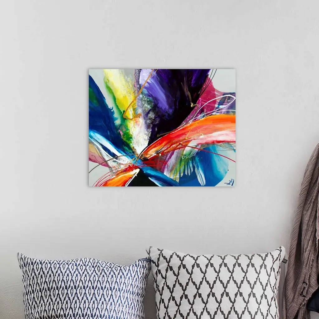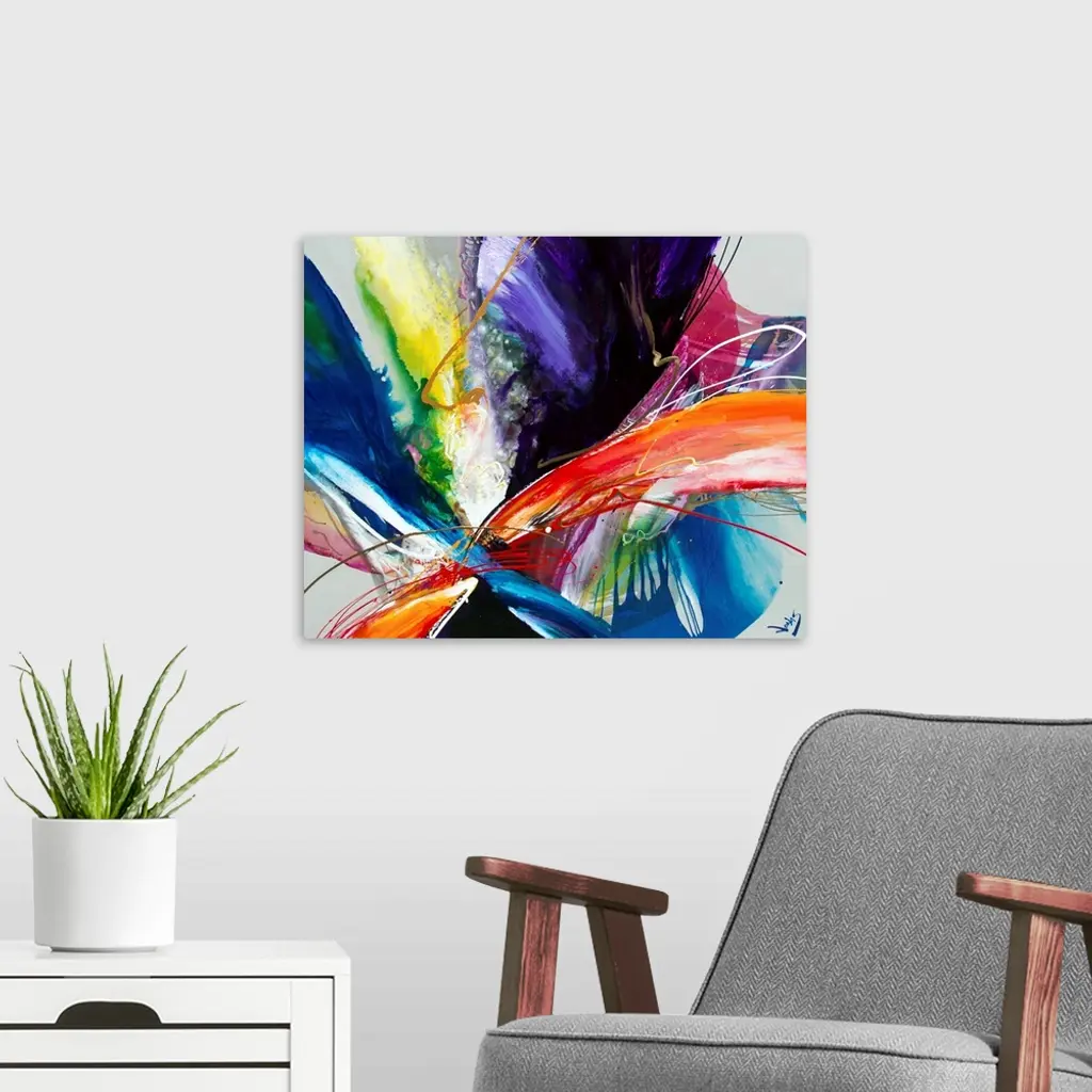 Contemporary abstract painting using wild and vivid colors to create movement and depth.