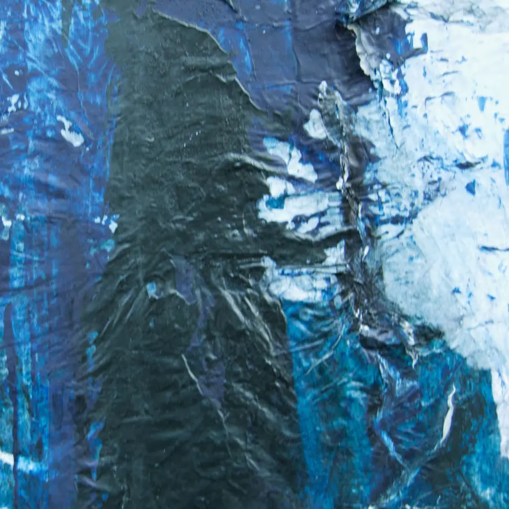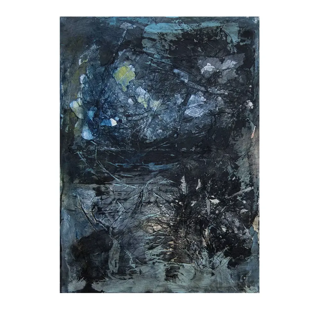 In this superb painting, night's shadows take shape of gloomy profiles that the fantasy transforms into unreal dimensions. The piece's distinctive textural flair is owed to the multiple layers of paper that prepare the canvas for welcoming all the dark acrylic colors that later are partially removed for a refined chromatic statement. The piece is delivered unframed and is supplied with an authenticity certificate.