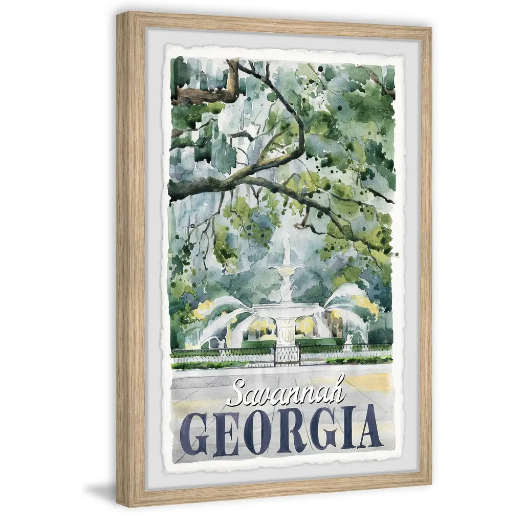 Featuring a white stone fountain and spouting waters, this print will give you the feeling of a soothing evening stroll in the parks of Savannah, Georgia. Proudly printed in the USA, this piece is printed on high quality archive paper and professionally hand-framed. With wall-mounting hooks included, this artful accent is ready to hang up as soon as it reaches your front door. • Top quality Giclee print on high resolution Archive Paper • Hand cut deckled edges • High quality durable non-warping frame • Finished under shatter resistant plexiglass • Arrives ready to hang • Includes a certificate of authenticity • Printed in the USA