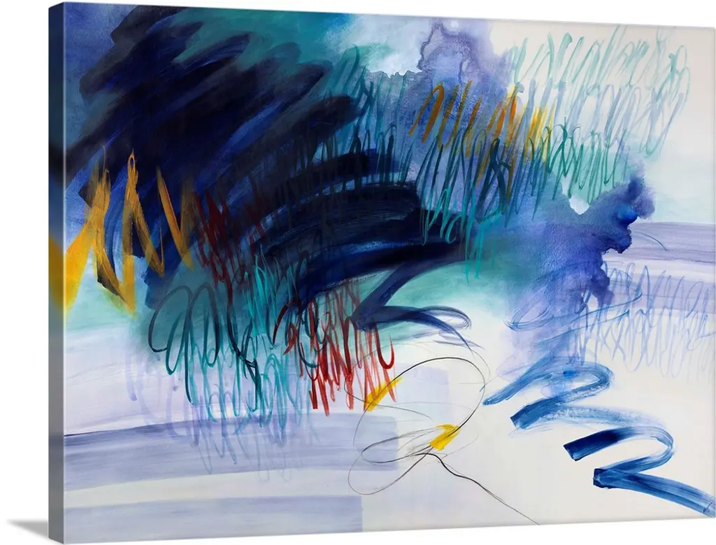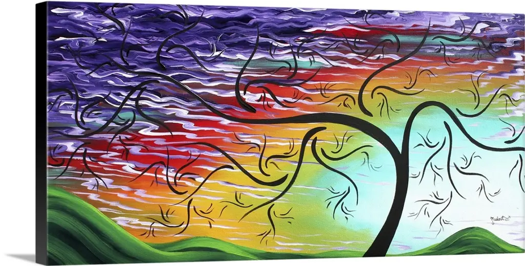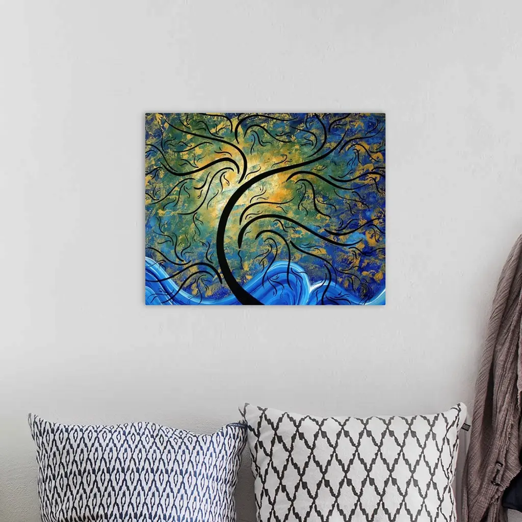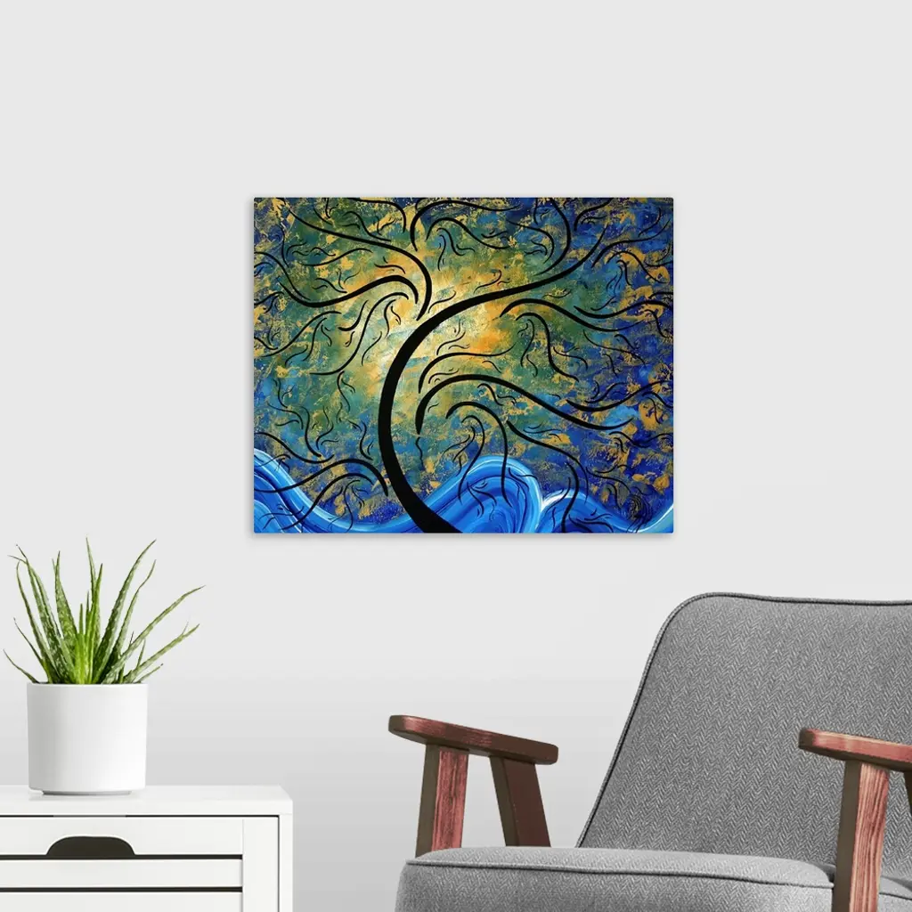 Abstract artwork of a tree that has golden leaves and the sun just behind it. A wave of blue is painted at the bottom.