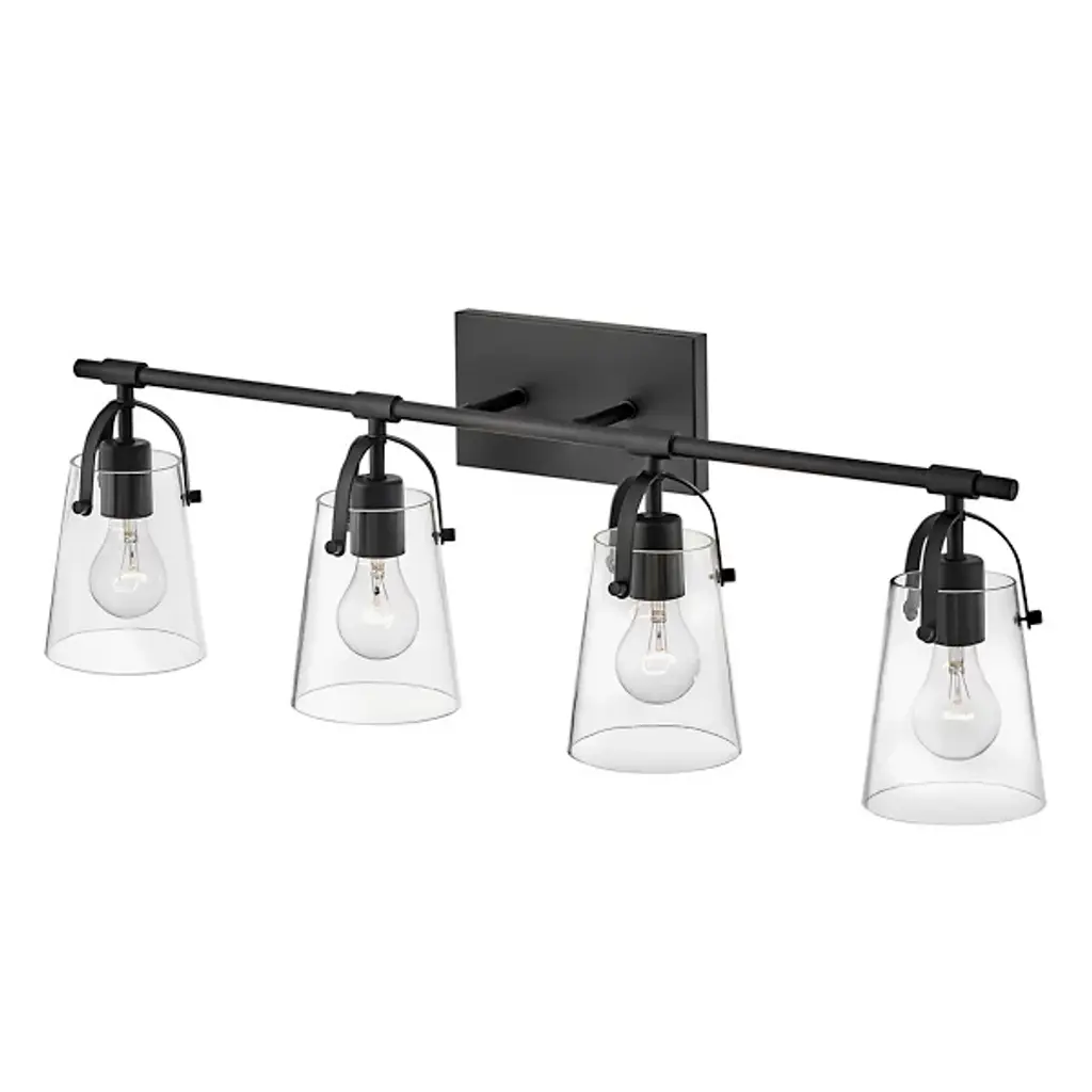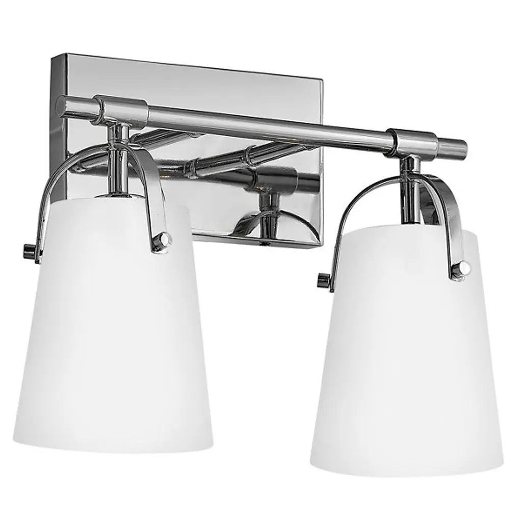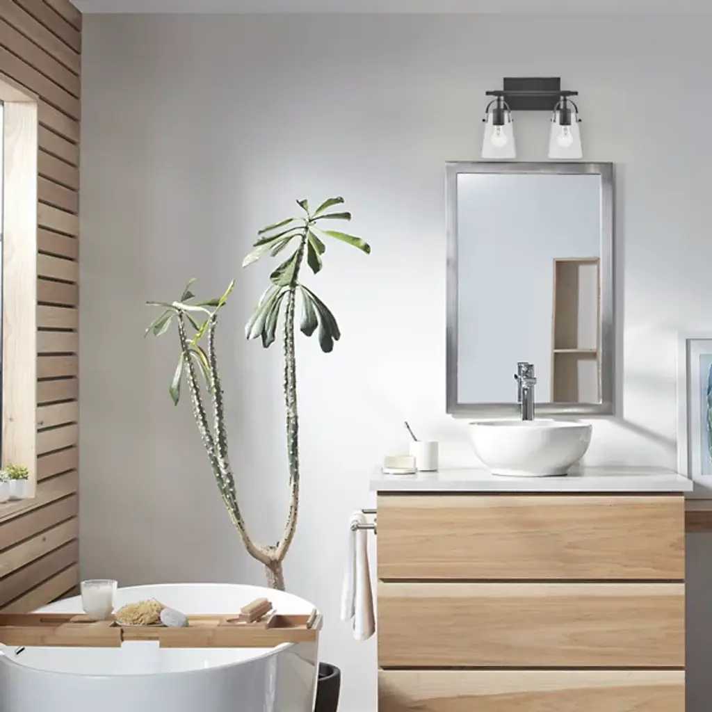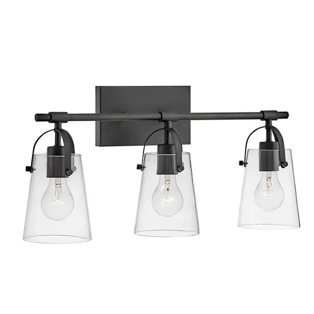 The Foster Vanity Light by Hinkley Lighting is a clean, contemporary lighting fixture for your bathroom. Efficiency is the goal here, with smooth, clean lines and soft curves. A sleek, unassuming backplate mounts a single smooth rod which holds up two powerful bulbs. Each of the series of lights is enclosed in a clear glass shade which gently hangs over the bulb, guaranteeing the light spreads throughout your bathroom space, whether that be over a vanity or elsewhere.