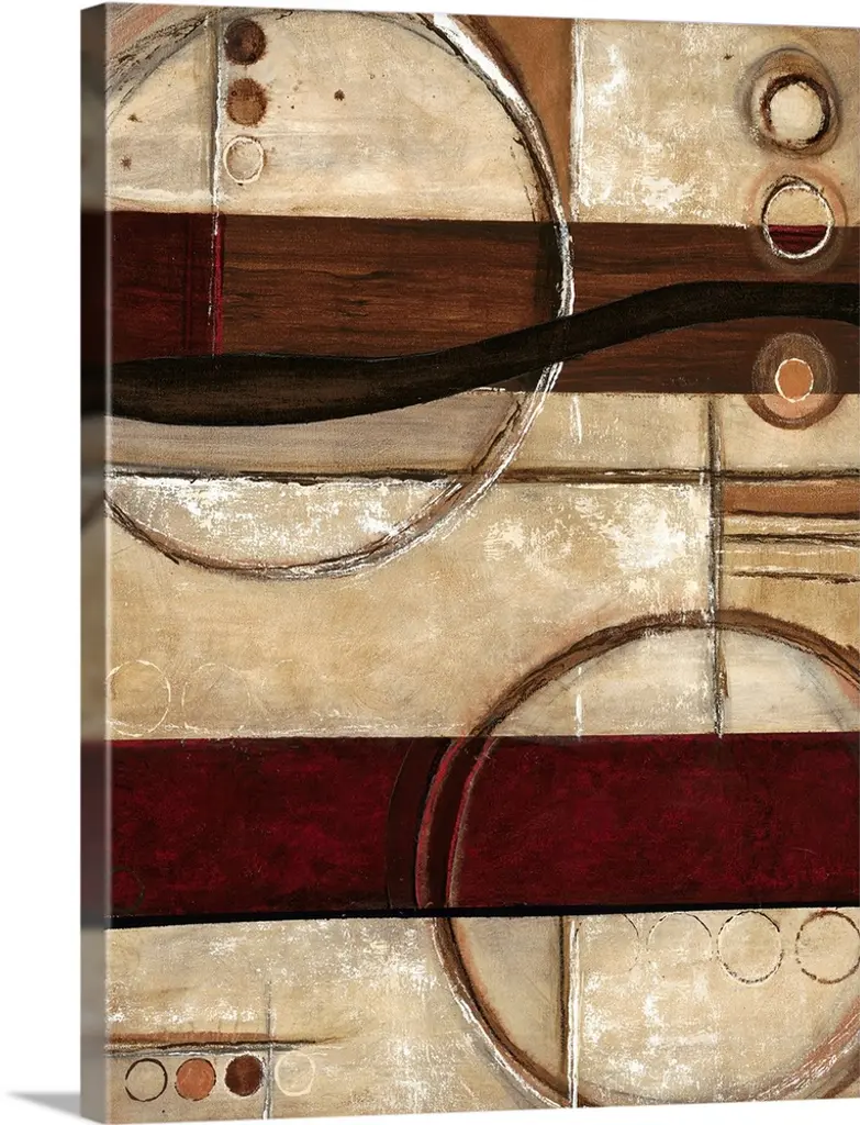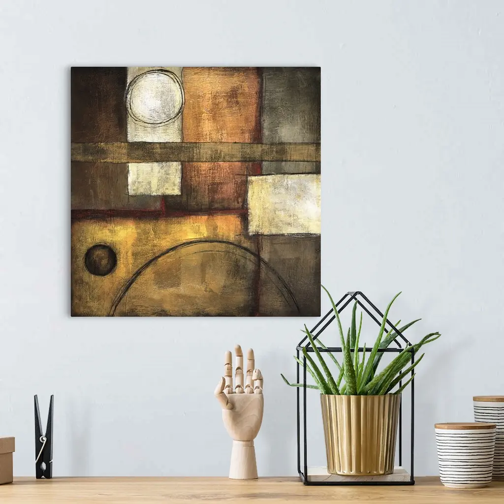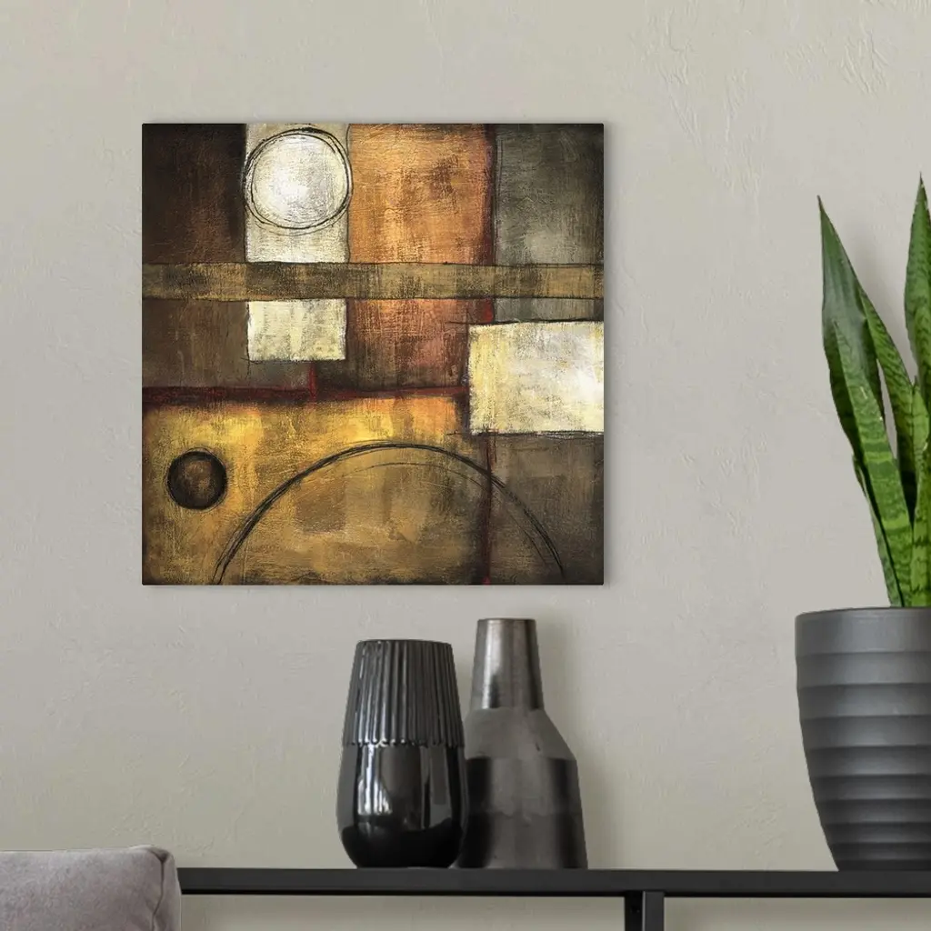 Abstract painting of squared shapes, overlapped with circular elements, done in textured earth tones.