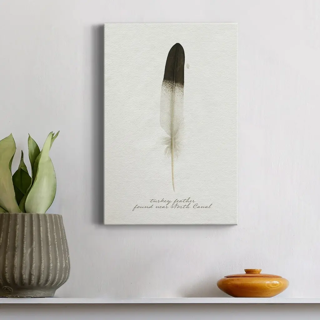 Found Feather IV Premium Gallery Wrapped Canvas - Ready to Hang A premium hand stretched gallery wrapped canvas print created to last. Featuring a beveled a solid wood stretcher bar, each piece comes ready to hand 5 SIZES AVAILABLE 8''X12'' - Overall Size 16'X20'' - Overall Size 24''x32'' - Overall Size 30''x40'' - Overall Size 36''x48'' - Overall Size Each piece is made to order. Built to Last Each piece comes ready to hang Solid wood stretcher Fade and Water resistant Made domestically