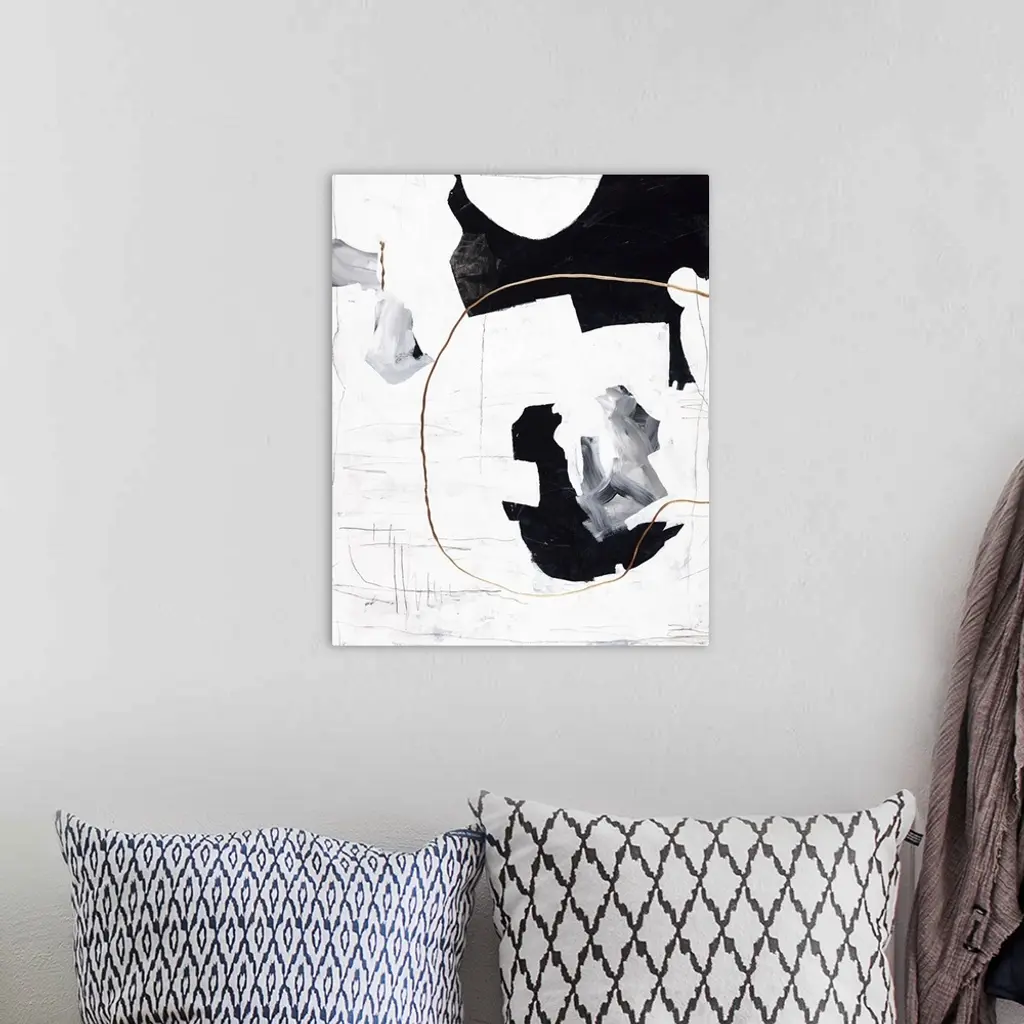 Black and white abstract painting with metallic gold accents.