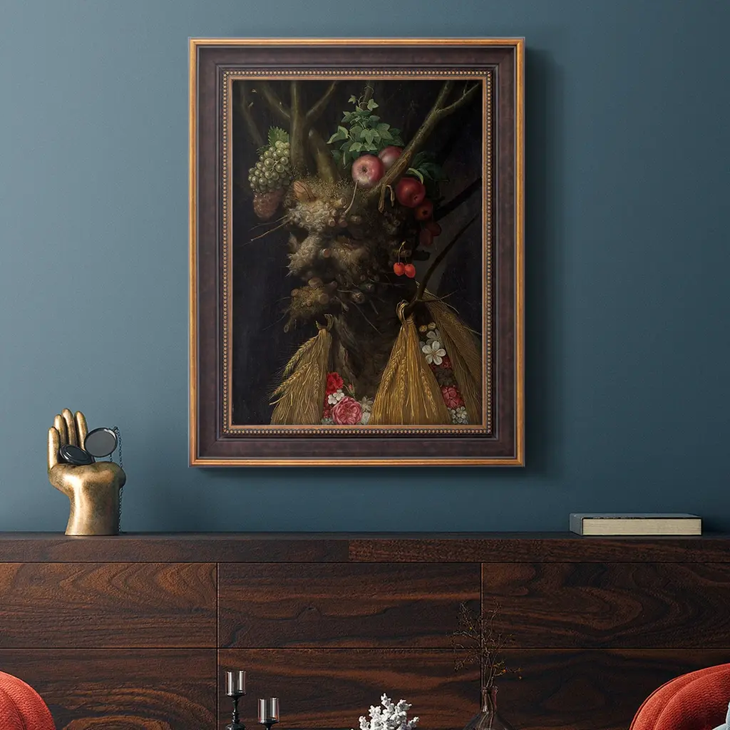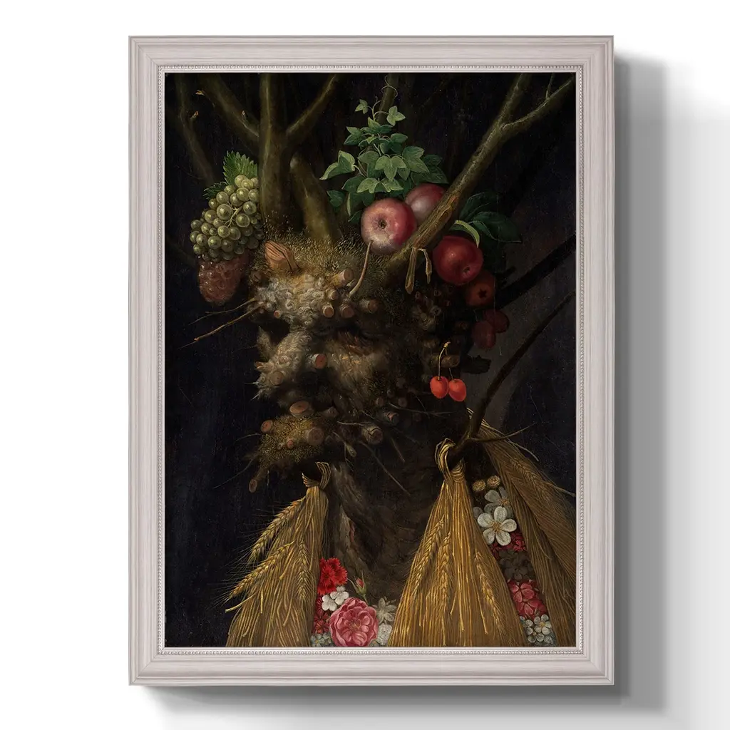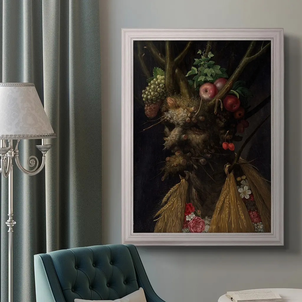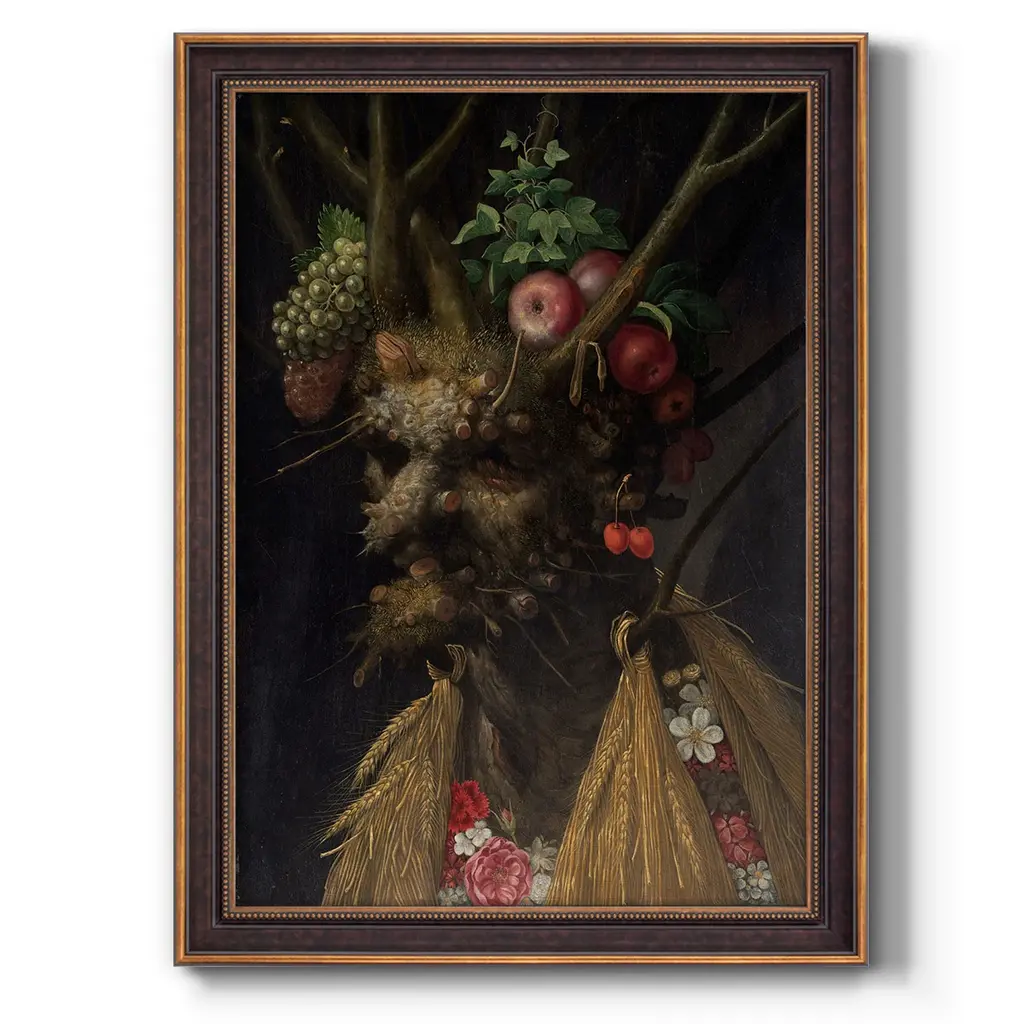 Four Seasons in One Head Premium Framed Canvas- Ready to Hang A Premium Framed Canvas created to last. Framed in distressed wood and available in an array of sizes and colors Featuring a beveled a solid wood stretcher bar, each piece comes ready to hand 3 SIZES AVAILABLE 16''X20'' - Overall Size 18'X27'' - Overall Size 24''x36'' - Overall Size Each piece is made to order. Each piece comes with hanging hardware. Made in the USA Ready to Hang Giclee Paper Print Acrylic Glass Beveled Matt Board