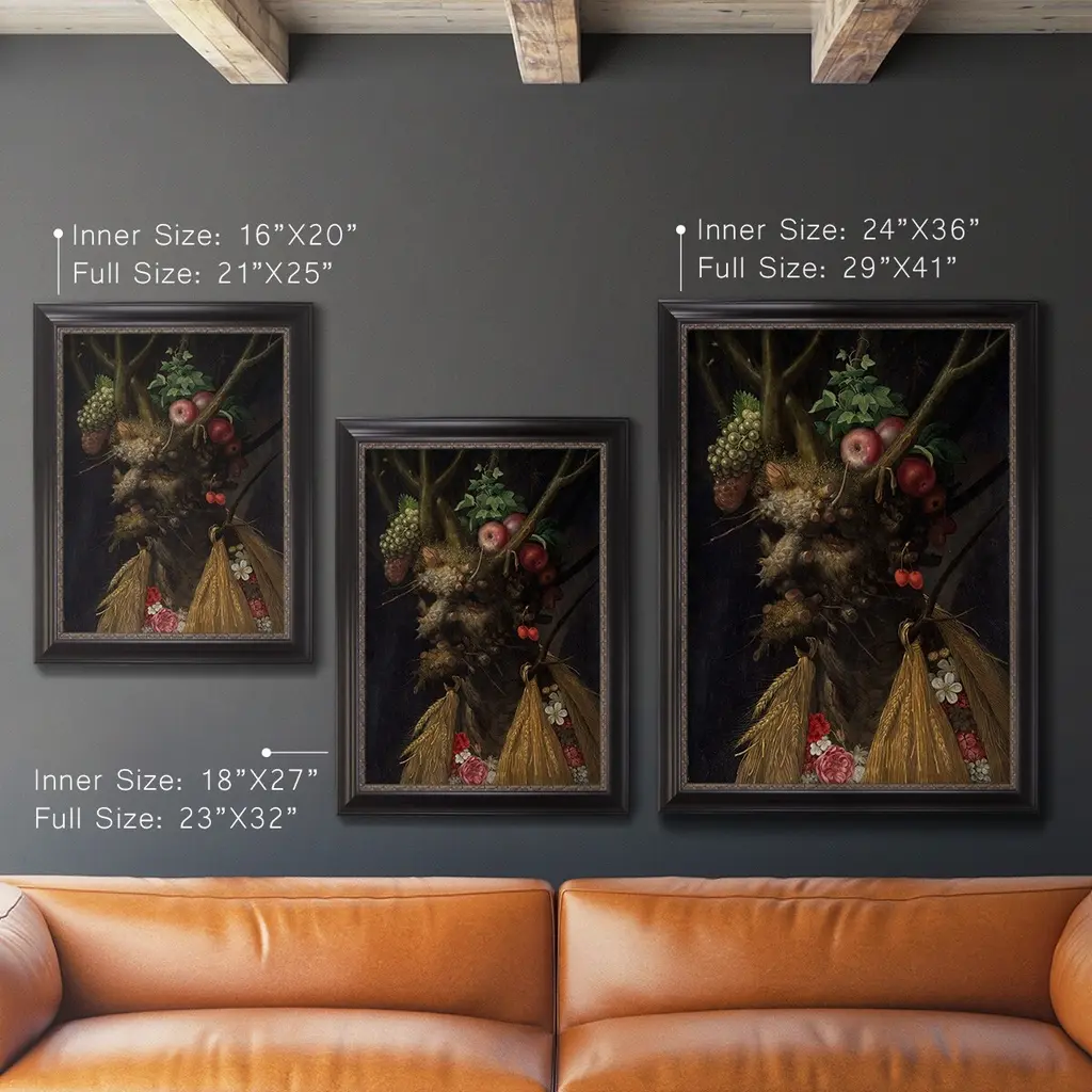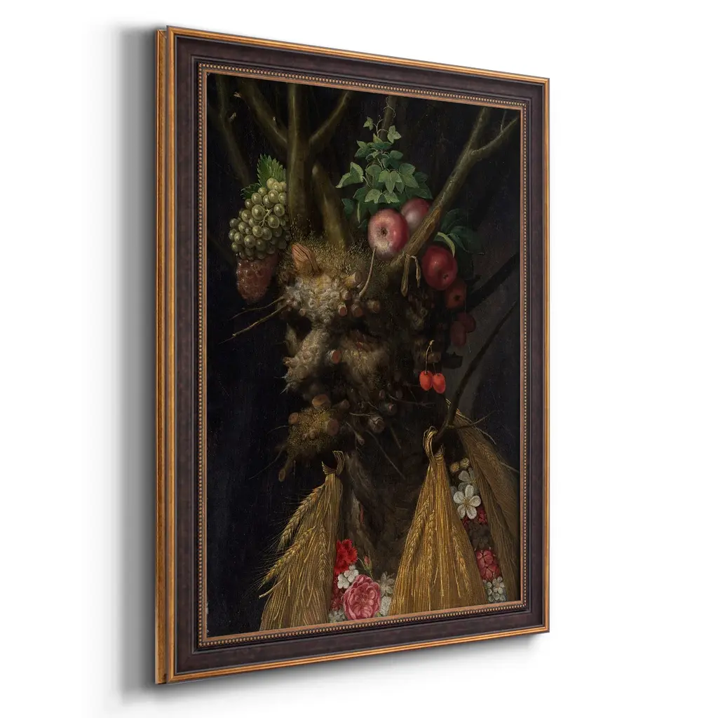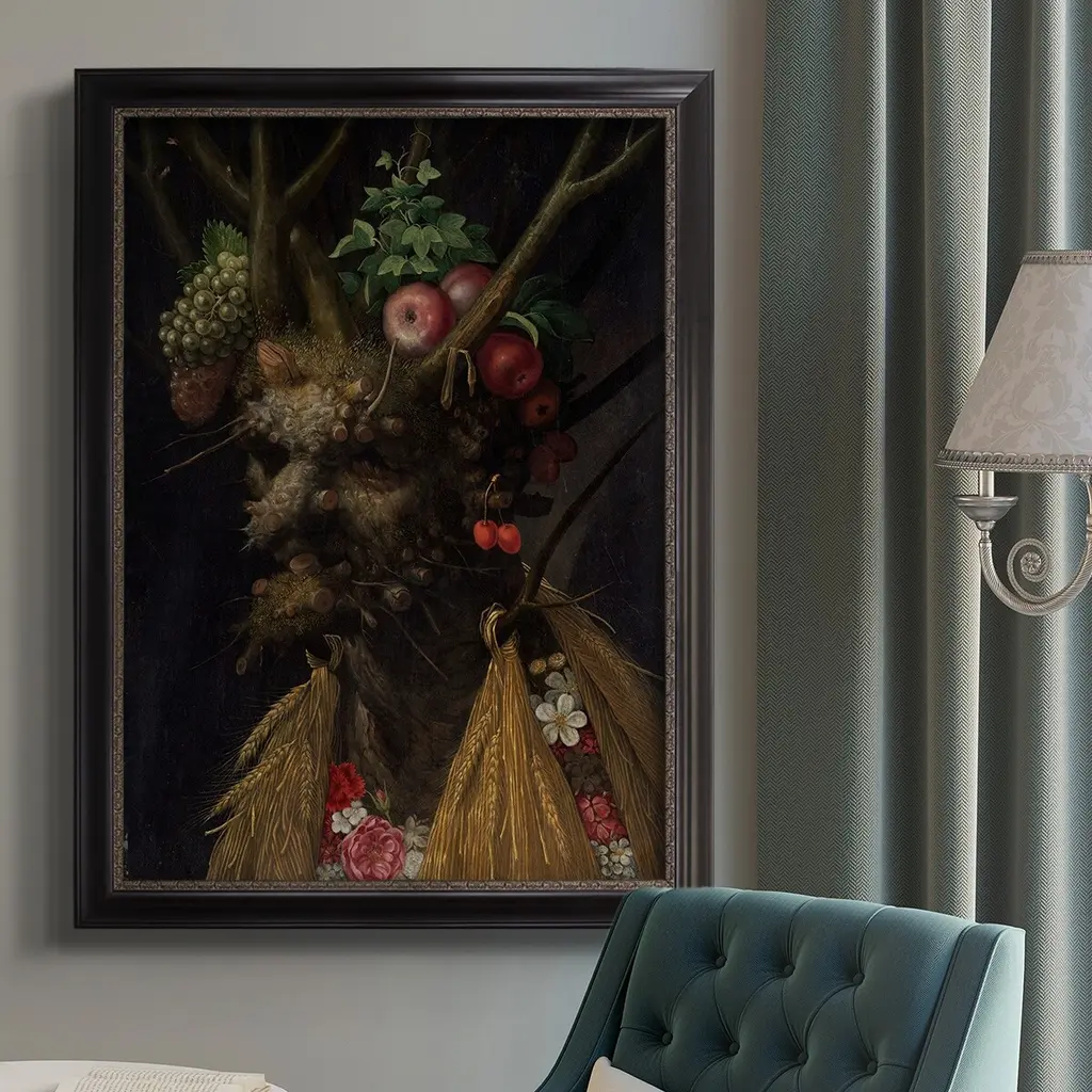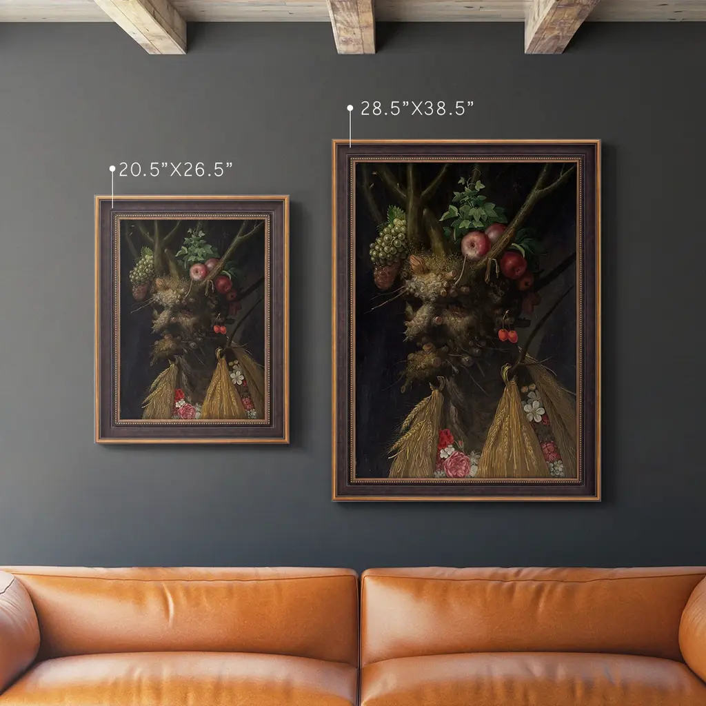 Four Seasons in One Head Premium Framed Canvas- Ready to Hang A Premium Framed Canvas created to last. Framed in distressed wood and available in an array of sizes and colors Featuring a beveled a solid wood stretcher bar, each piece comes ready to hand 3 SIZES AVAILABLE 16''X20'' - Overall Size 18'X27'' - Overall Size 24''x36'' - Overall Size Each piece is made to order. Each piece comes with hanging hardware. Made in the USA Ready to Hang Giclee Paper Print Acrylic Glass Beveled Matt Board
