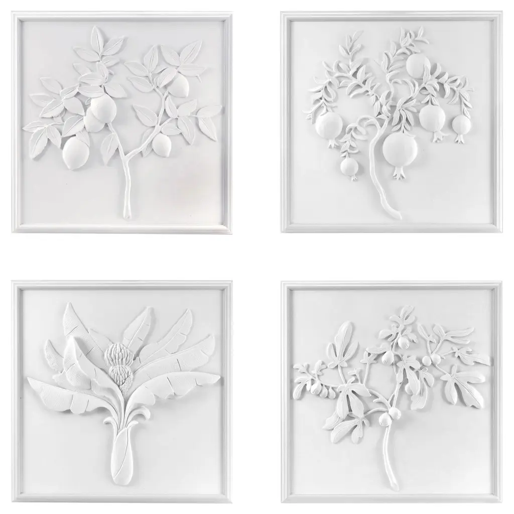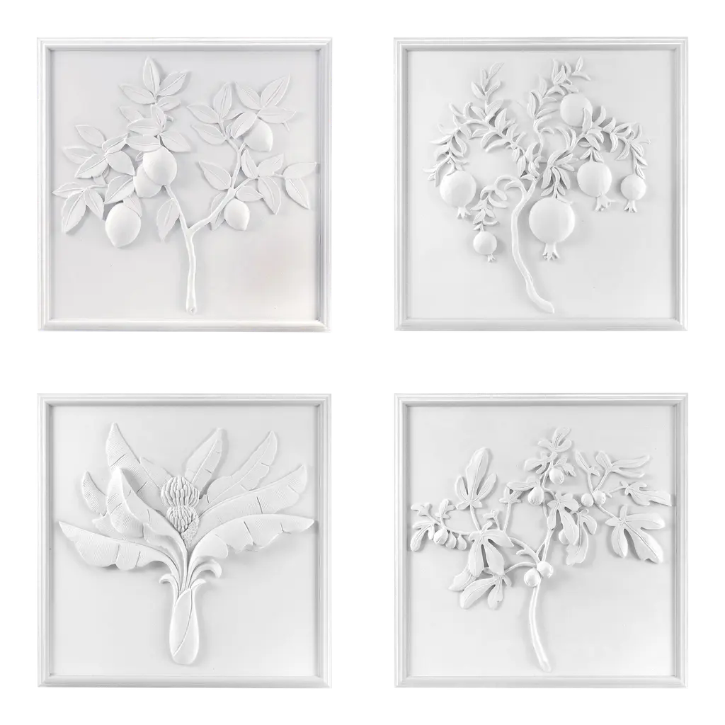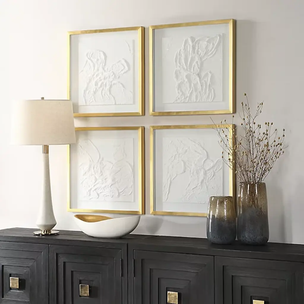 The Fourfold Wall Art, Set of 4 from Uttermost employs thick dimensional textures in an all-white palette. Protected under glass, the hand-painted abstract forms appear differently as lighting conditions change throughout the day. The light gold pinewood shadow box frame provides depth perception while complementing the monochromatic artwork. This versatile piece can hang horizontally or vertically, adapting to different wall spaces and design needs. The sculptural quality of the raised white forms creates an engaging tactile impression even though it remains behind glass.