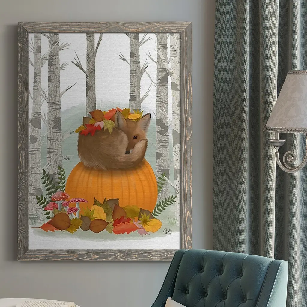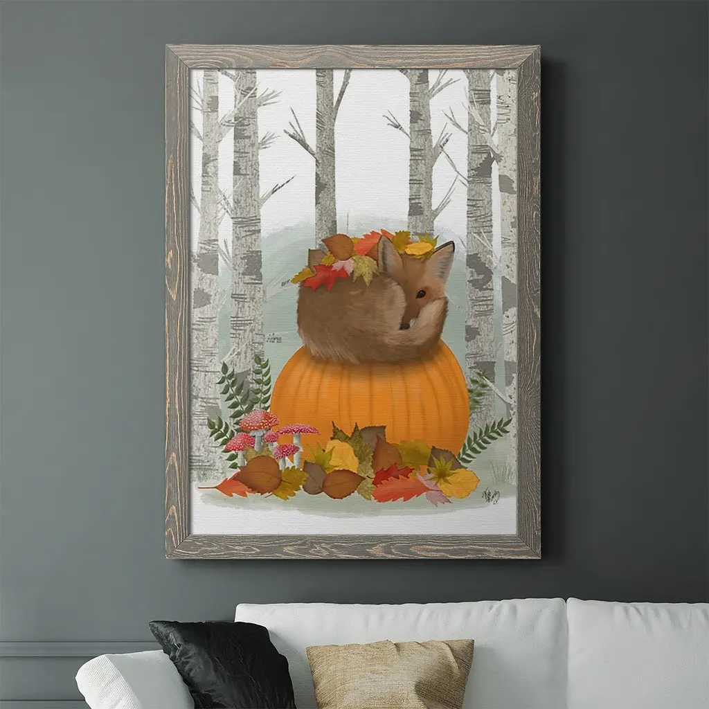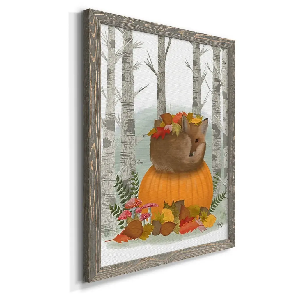 Fox Curled On Pumpkin-Premium Framed Canvas - Ready To Hang - 27.5x37.5 - Walnut
