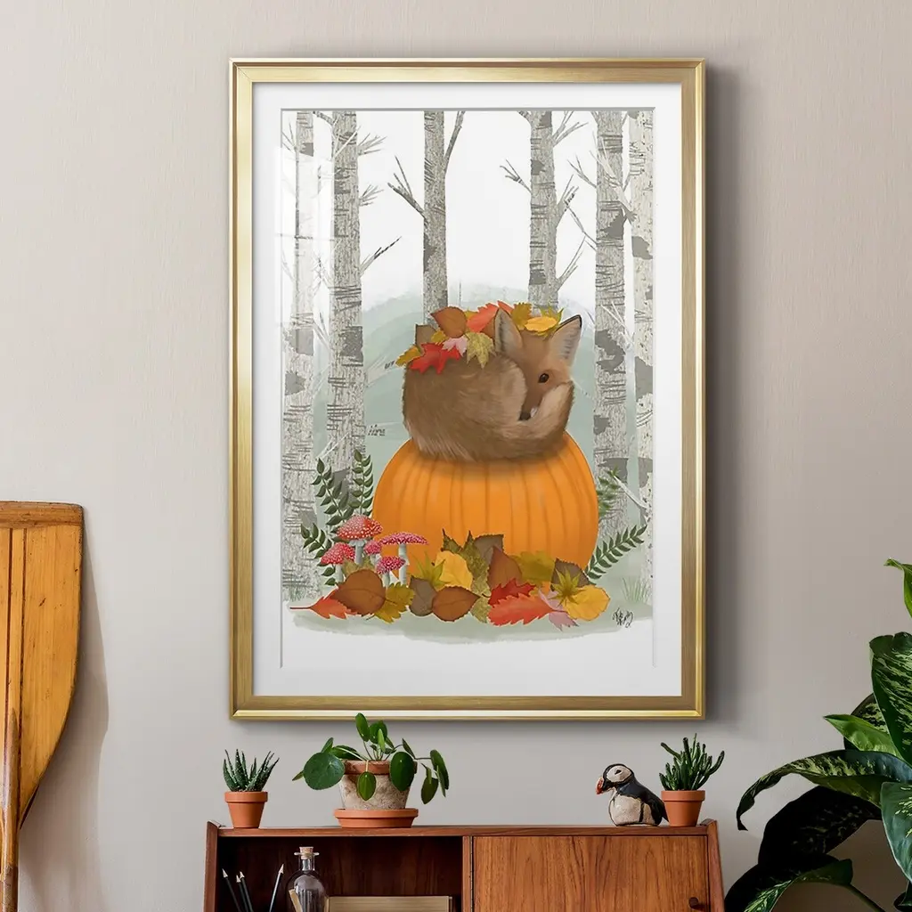 Fox Curled on Pumpkin Premium Framed Print - Ready to Hang A Premium Framed Print created to last. Framed in distressed wood and available in an array of sizes and colors Featuring a beveled a solid wood stretcher bar, each piece comes ready to hand 4 SIZES AVAILABLE 30.5''X42.5'' - Overall Size 26.5'X36.5'' - Overall Size 22.5''x30.5'' - Overall Size 18.5''x24.5'' - Overall Size Each piece is made to order. Each piece comes with hanging hardware. Made in the USA Ready to Hang Giclee Paper Print Acrylic Glass Beveled Matt Board